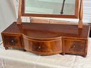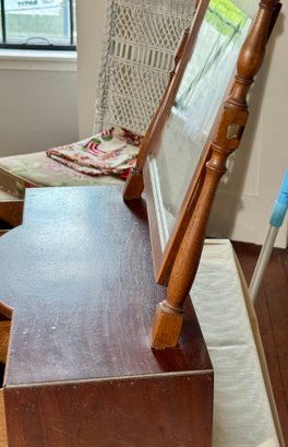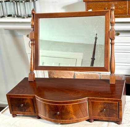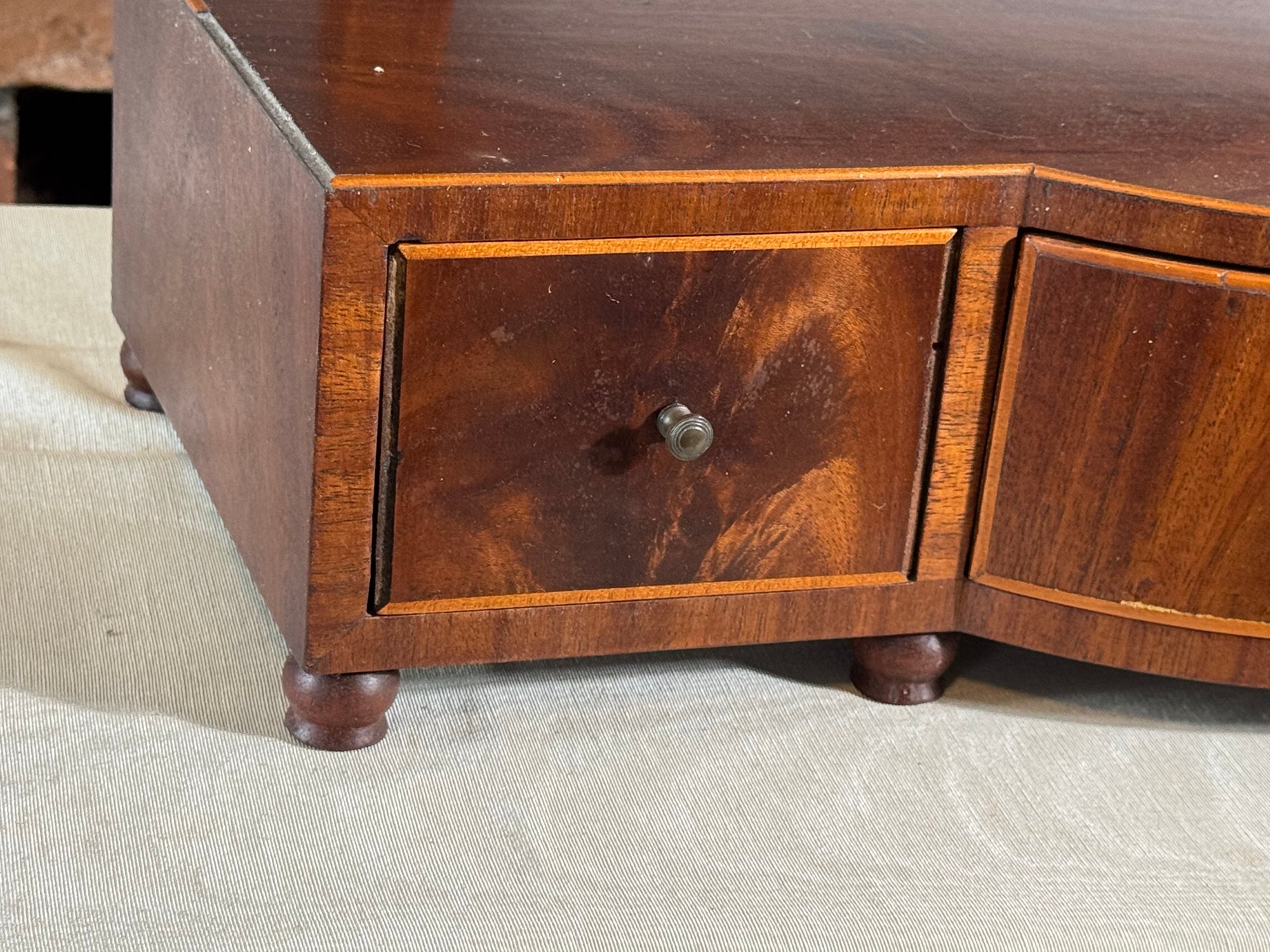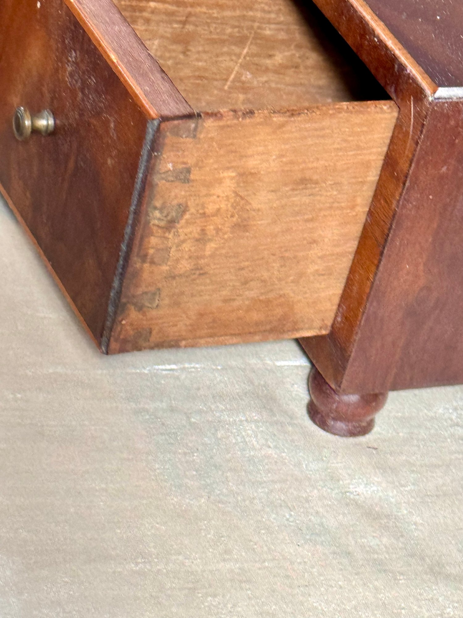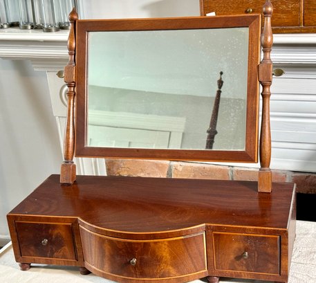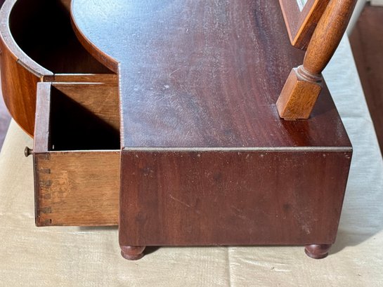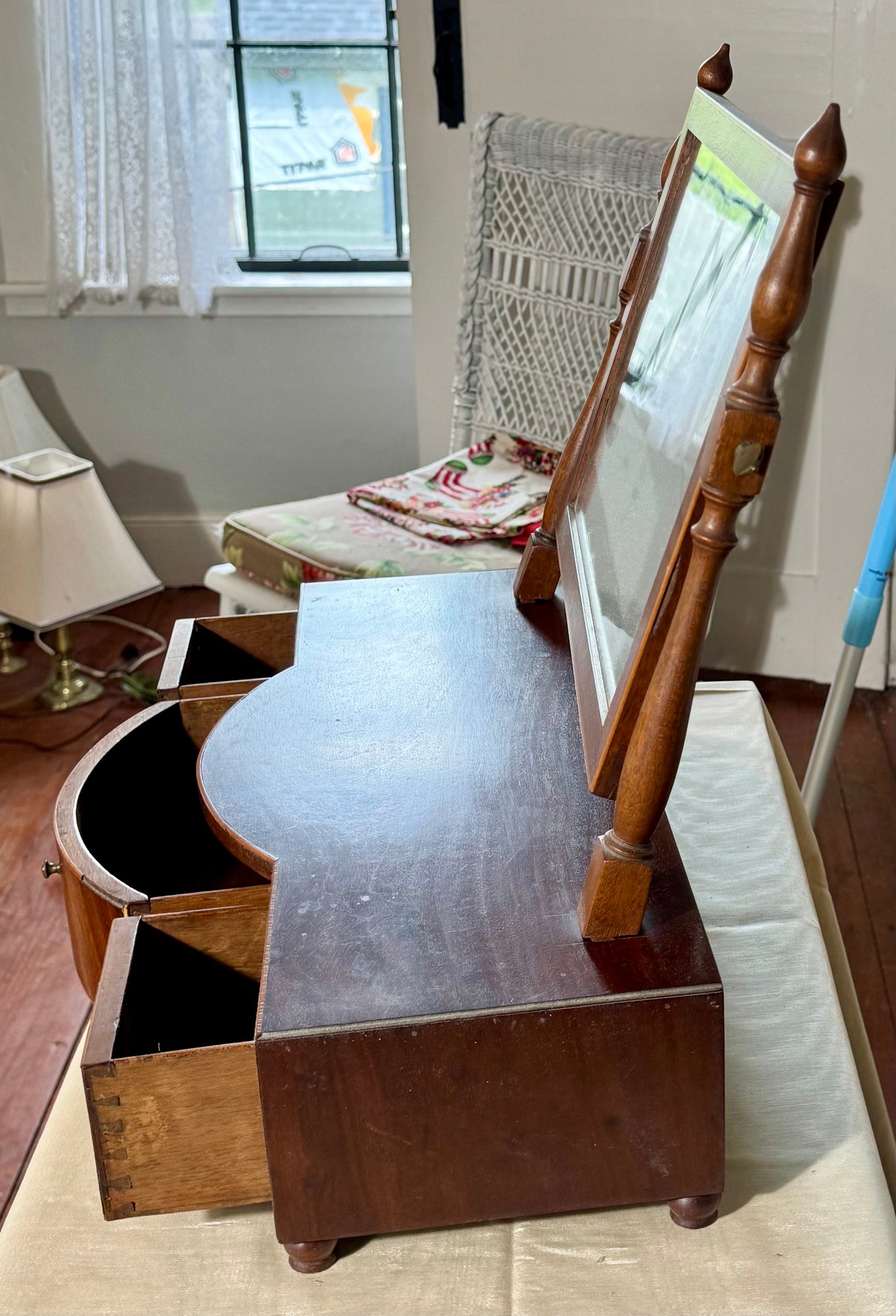 An antique American Federal shaving stand, a beautiful mahogany surface with a fine patina and white pine secondary on the trim, with three dovetailed drawers.