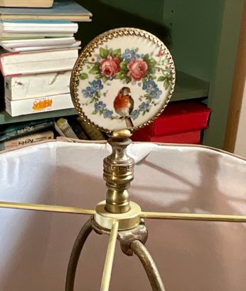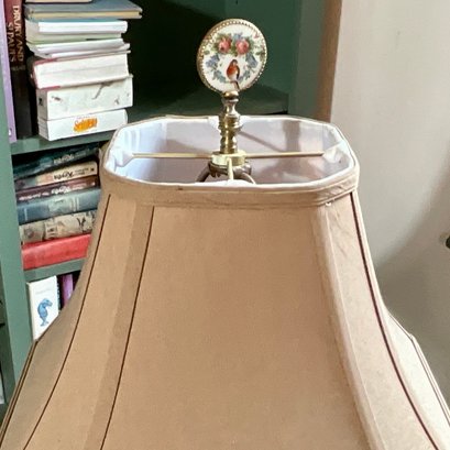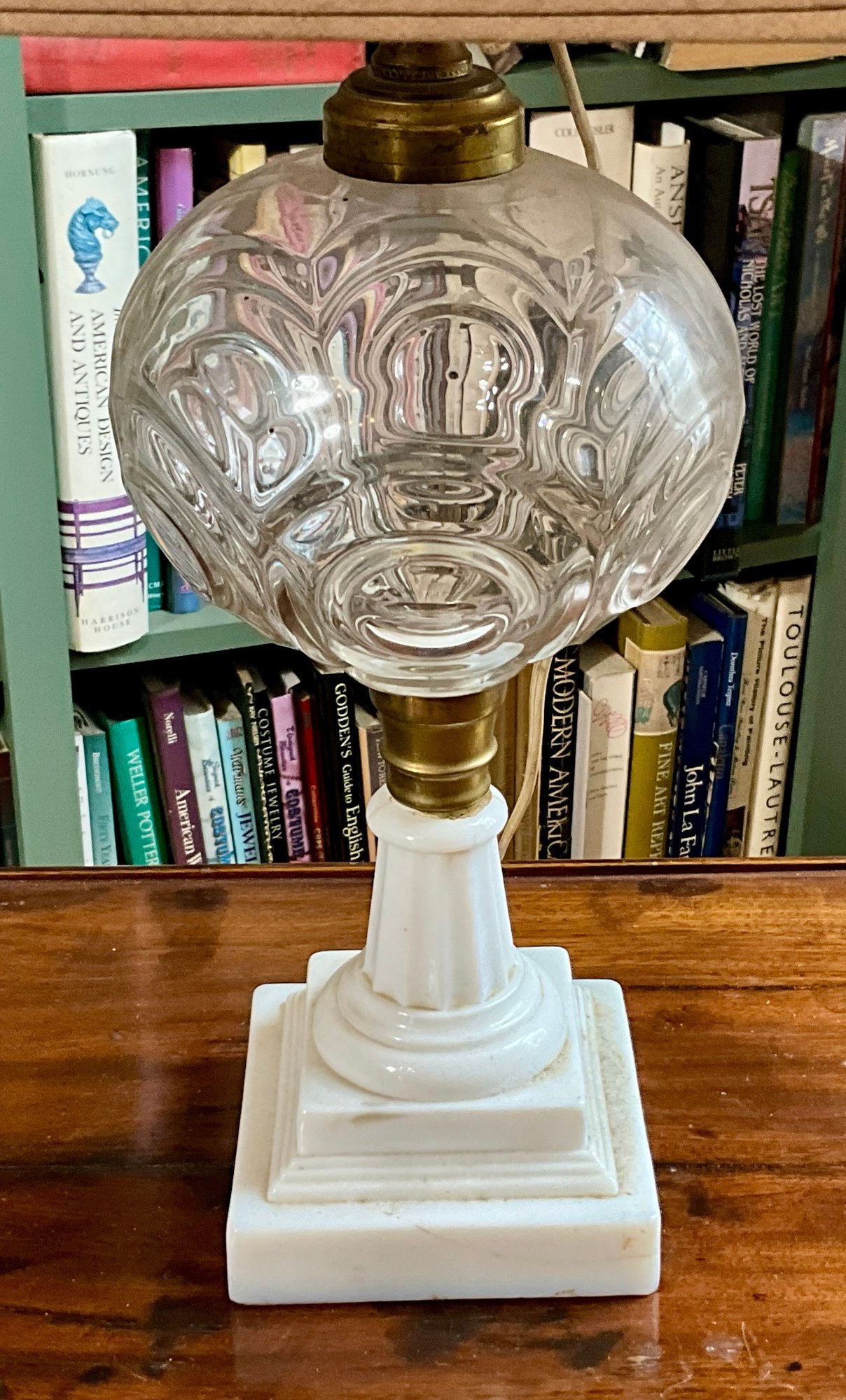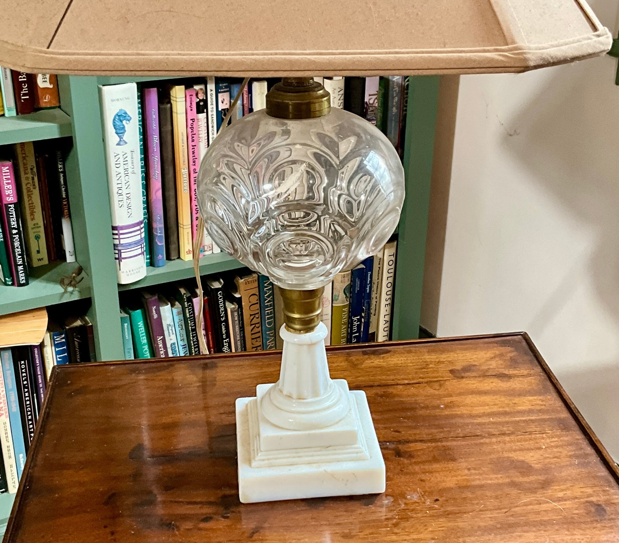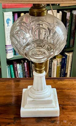 An antique table lamp with a tiered milk glass base, glass bullseye orb and a shade with a decorative finial.