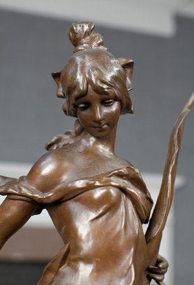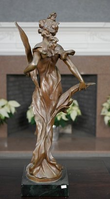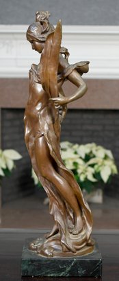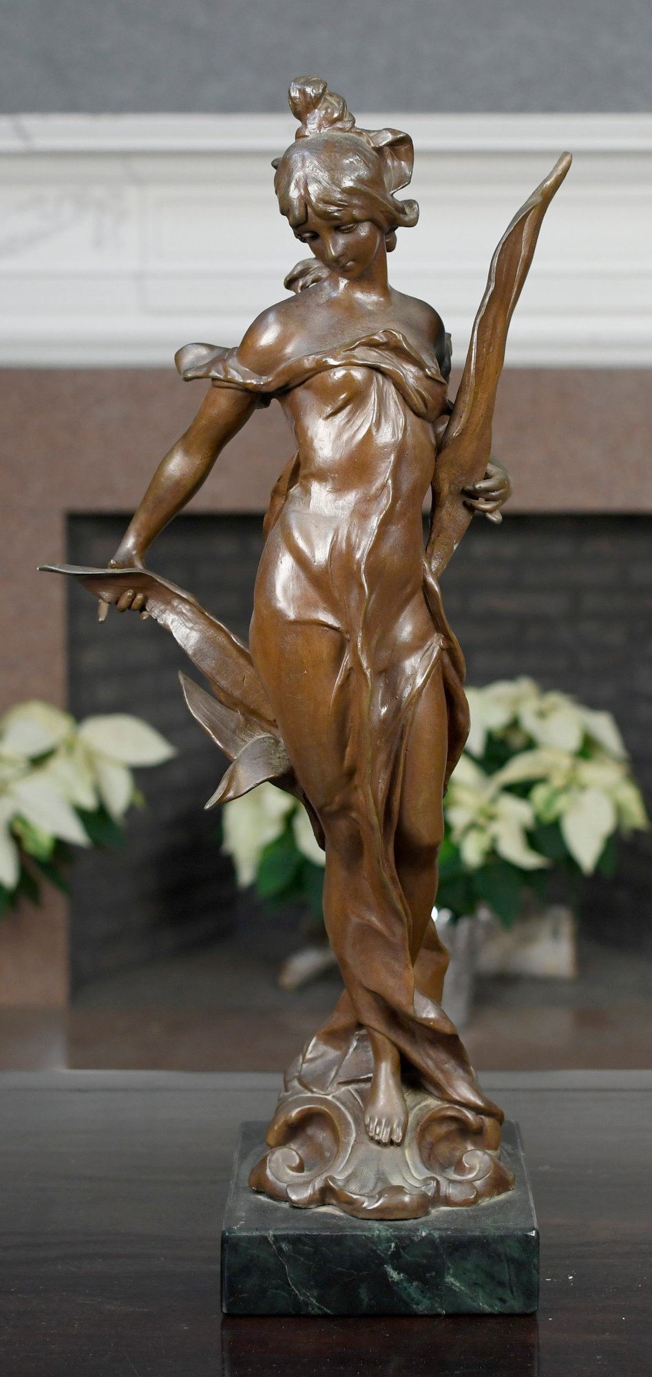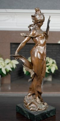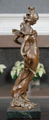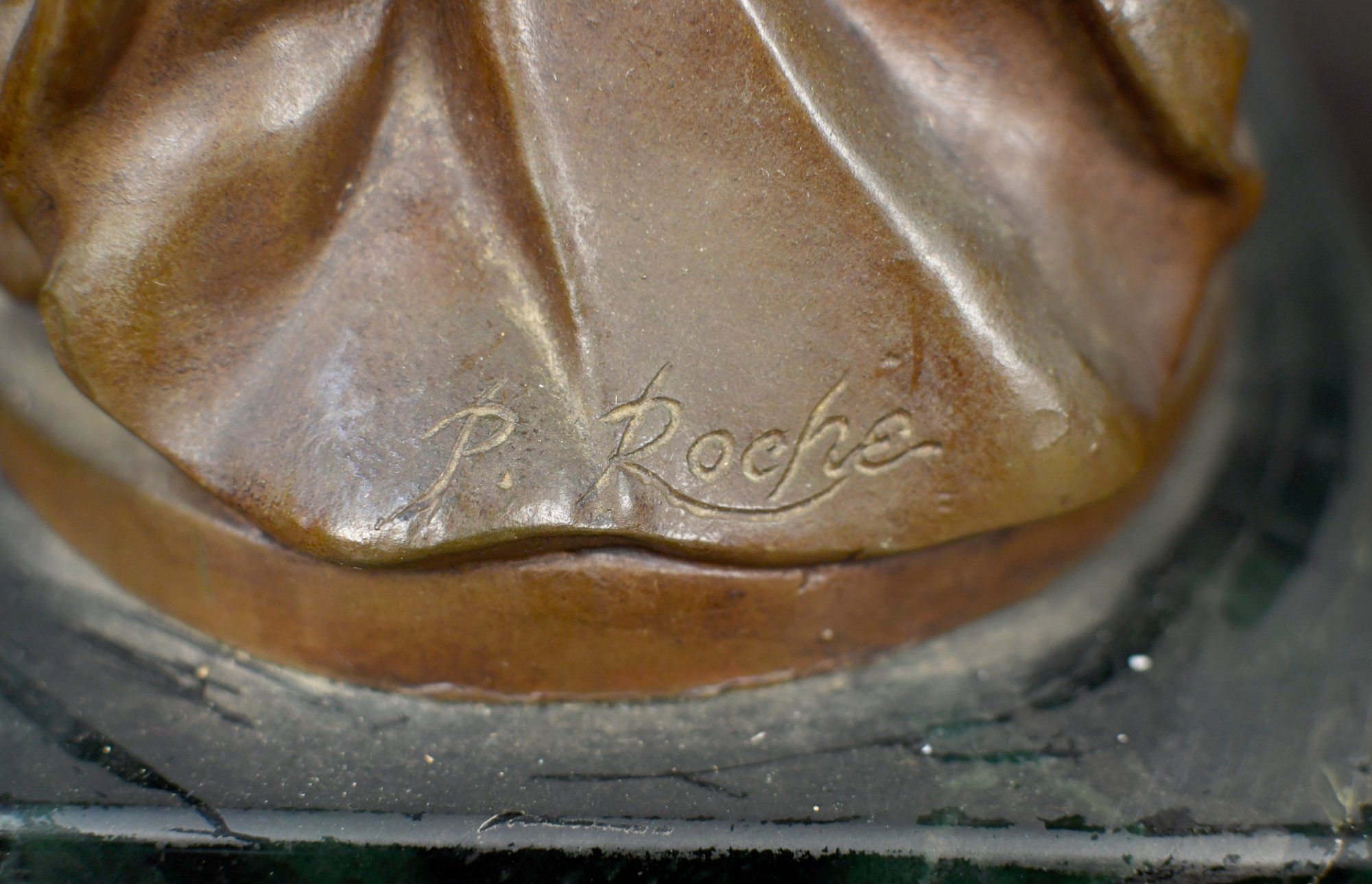 Antique bronze sculpture, woman in draperies among leaves, on green marble, signed P. Rocke.