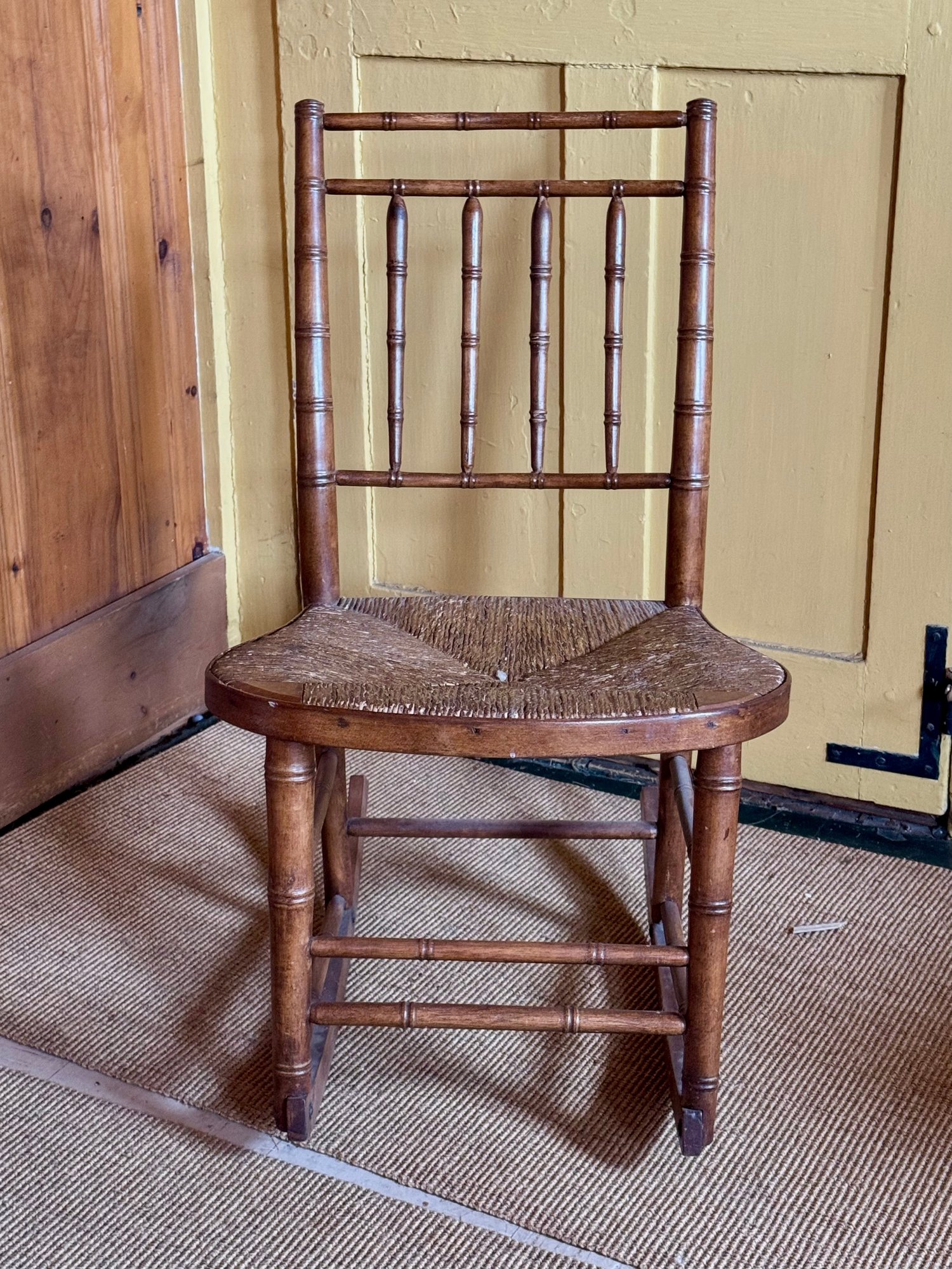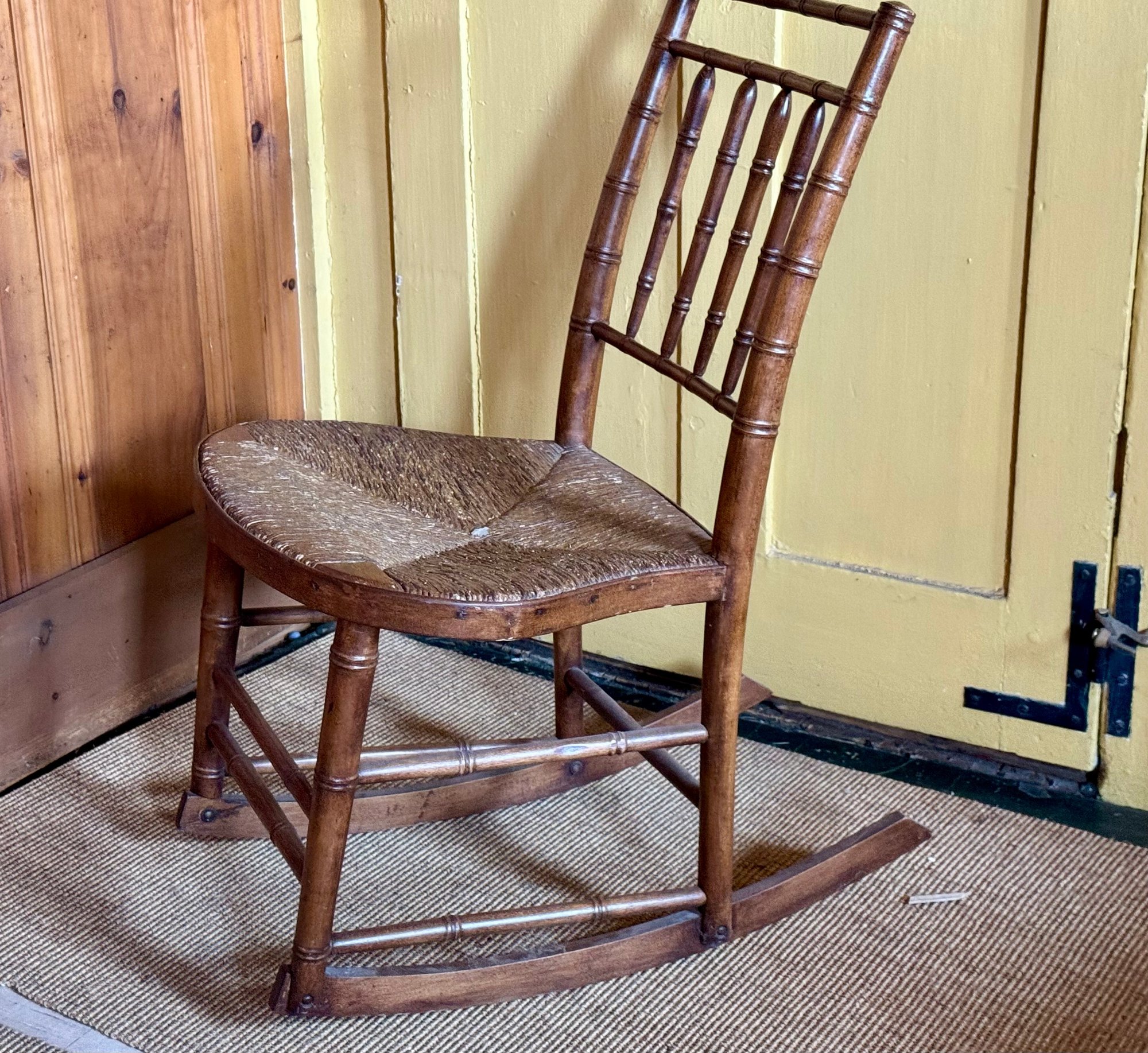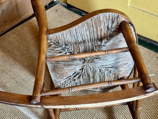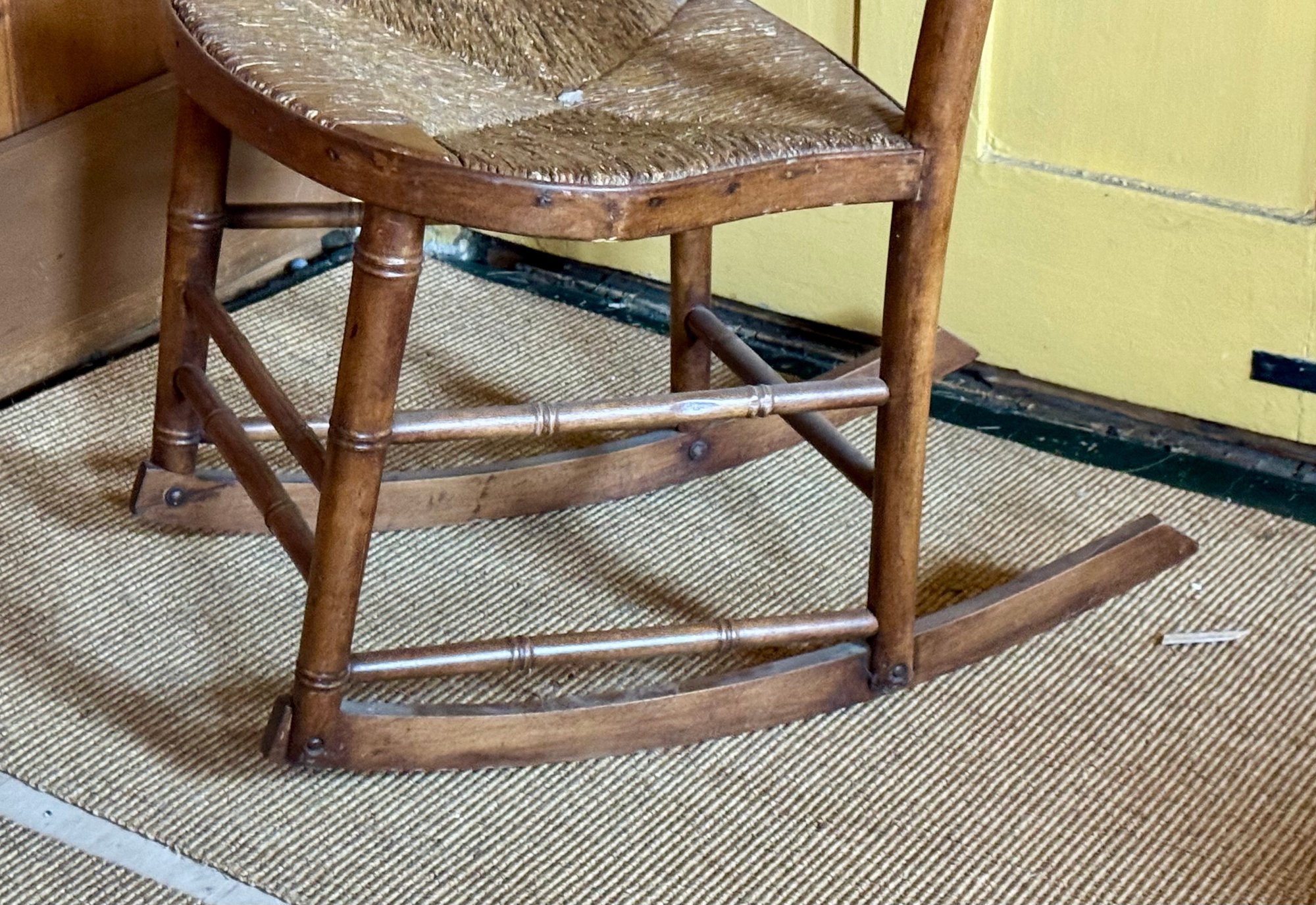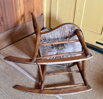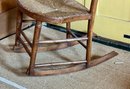 An antique rush seat rocking chair.