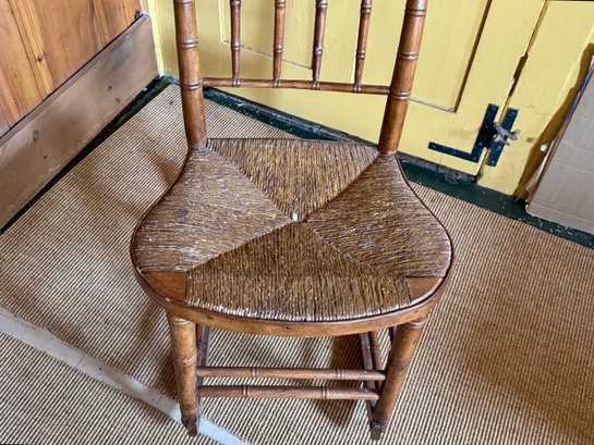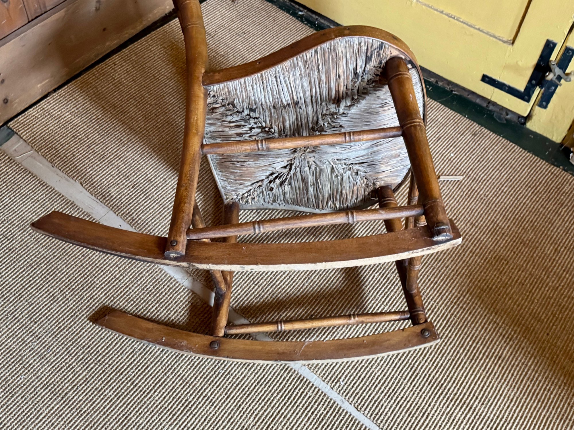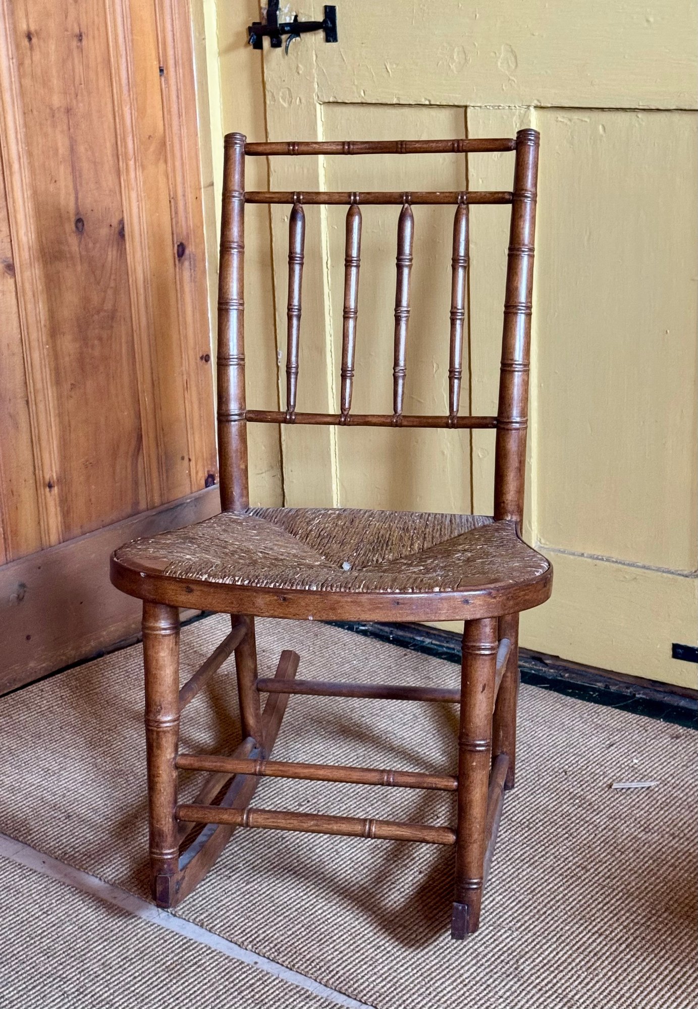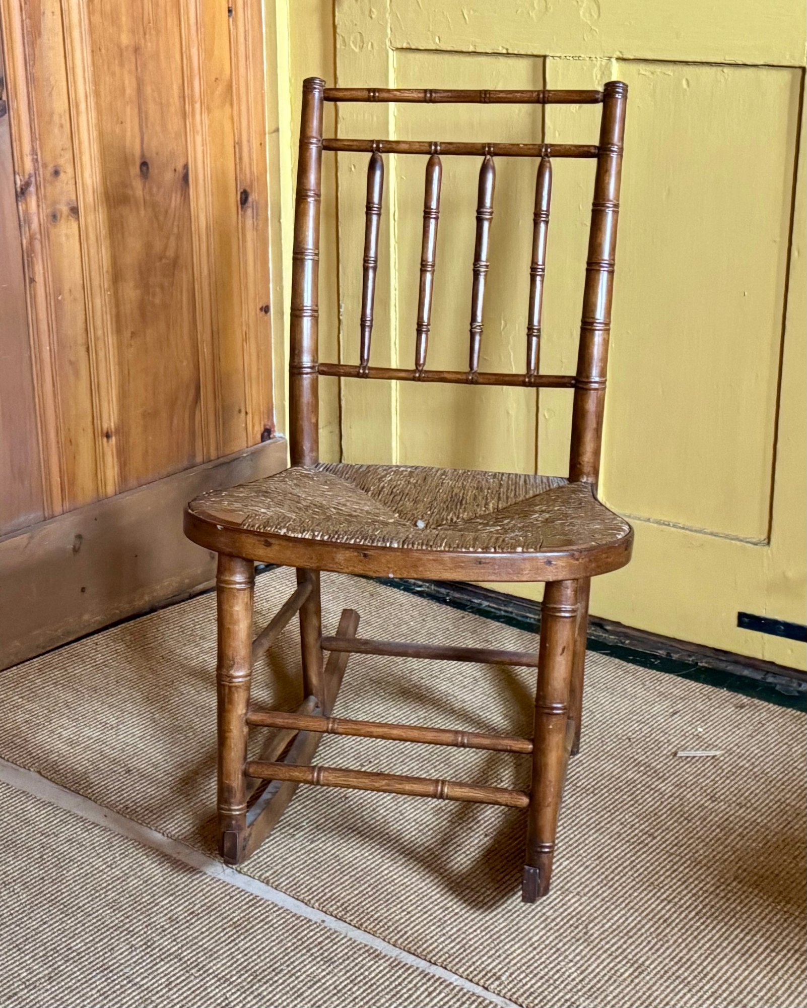 An antique rush seat rocking chair.