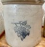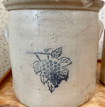 F.T. Wright & Son Taunton MA crock with cobalt grape leaf decoration 8.5”H x 9” dia.