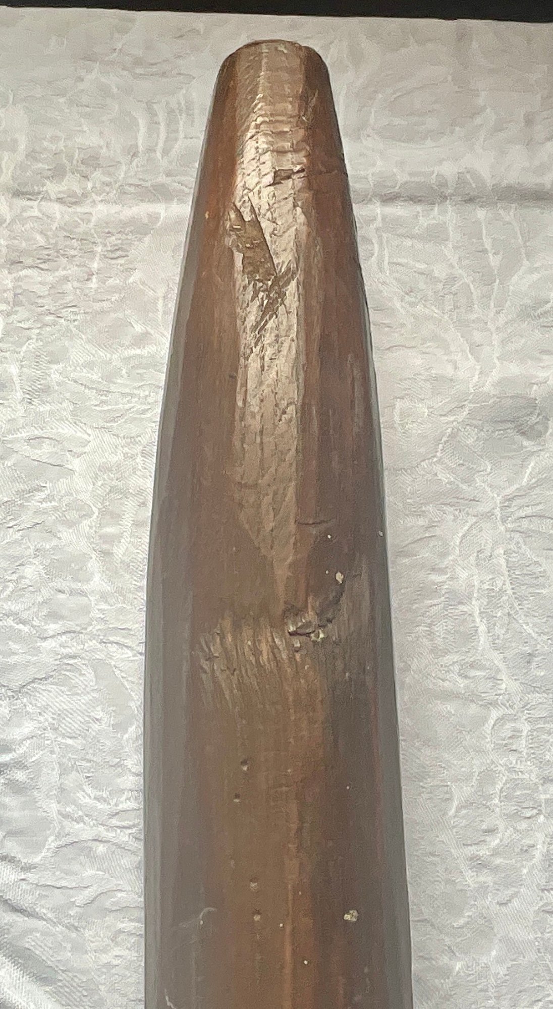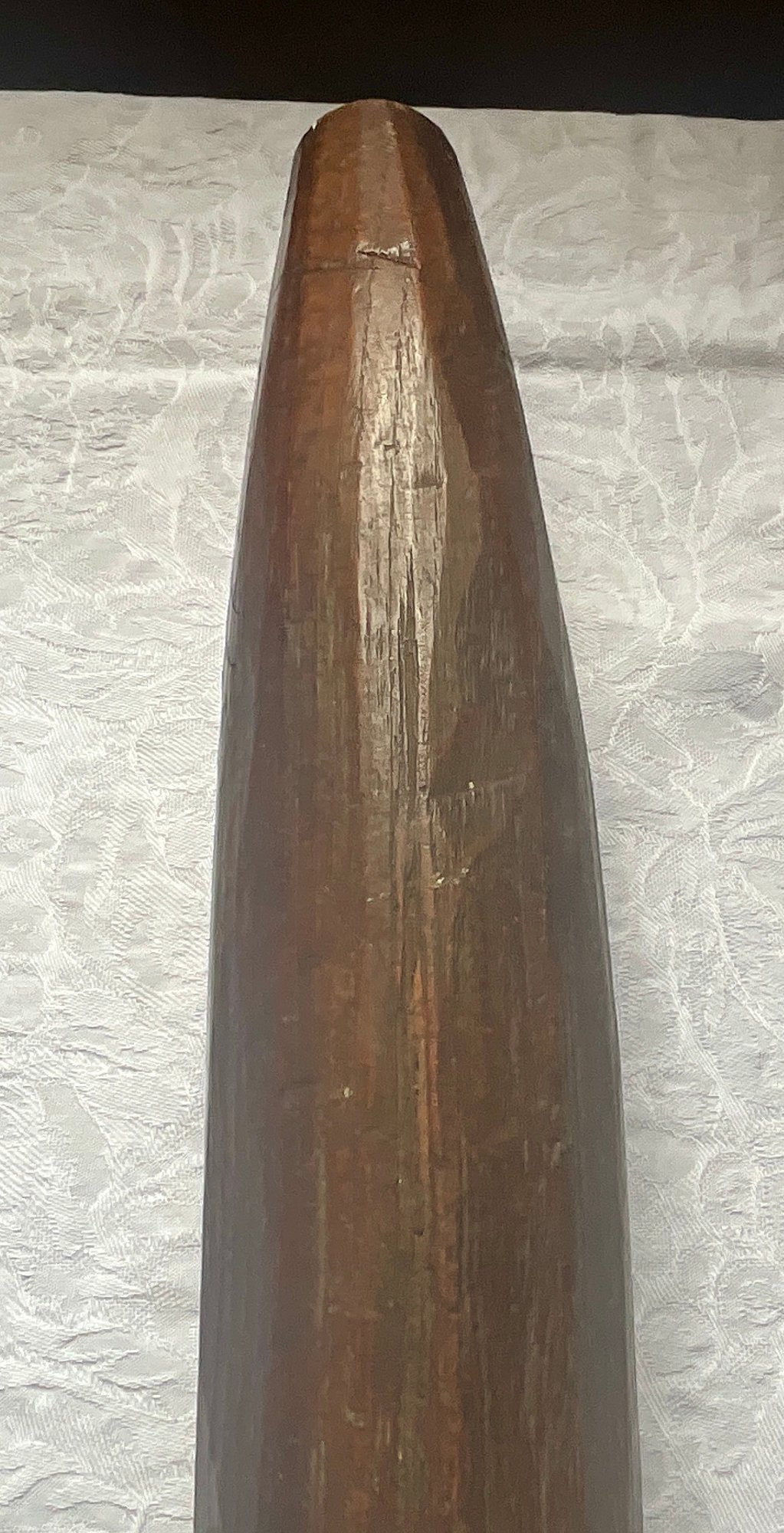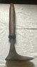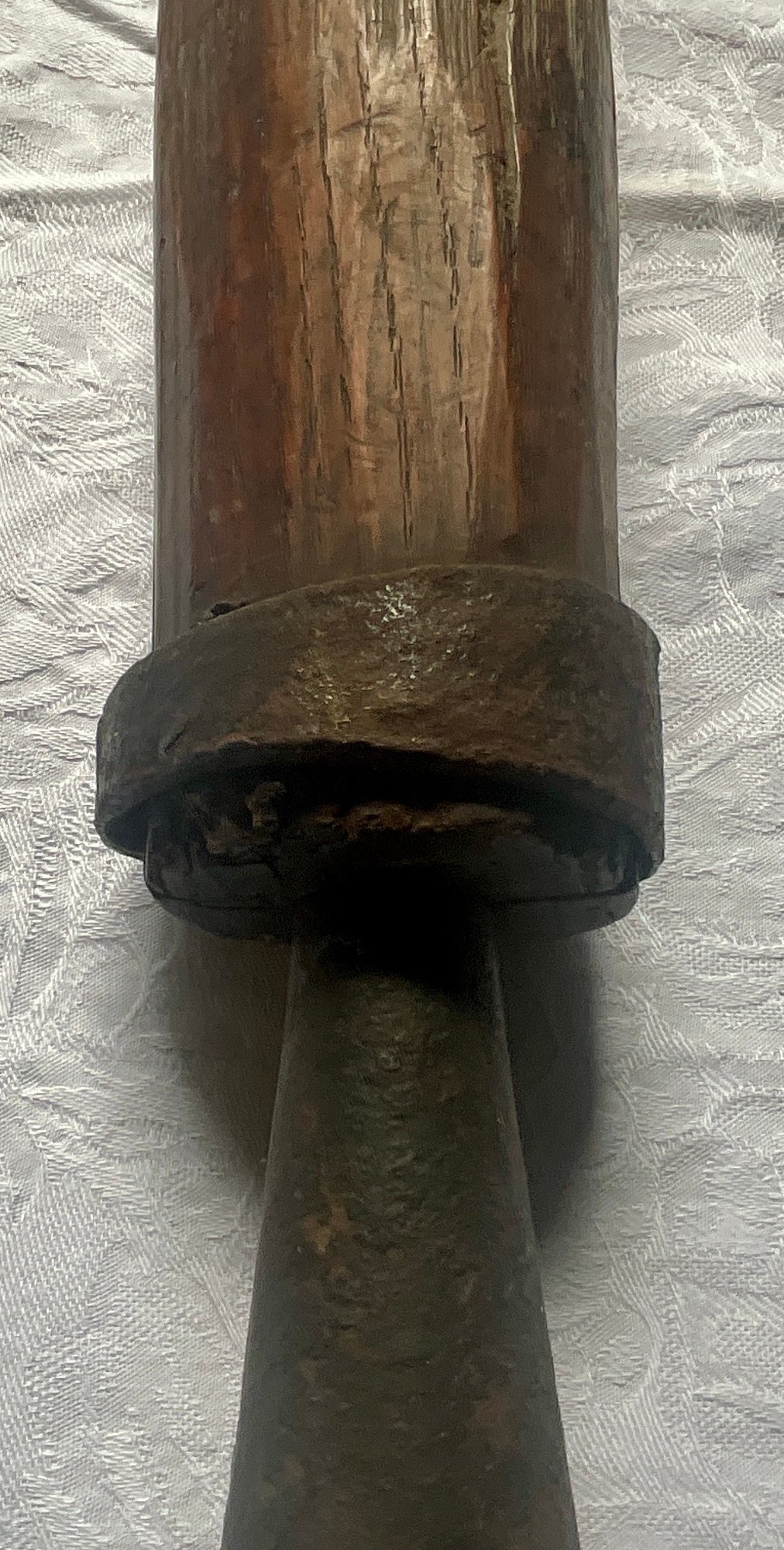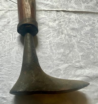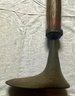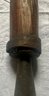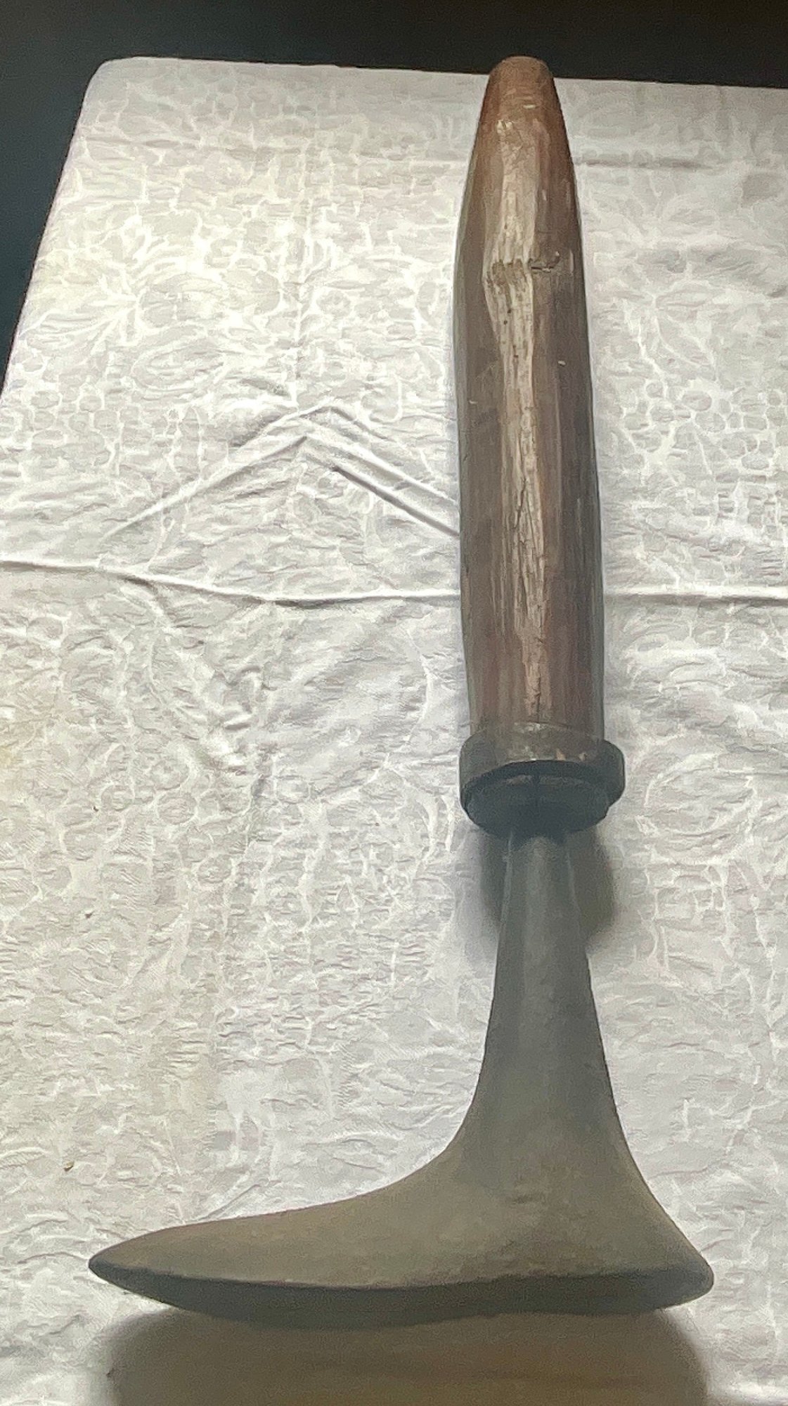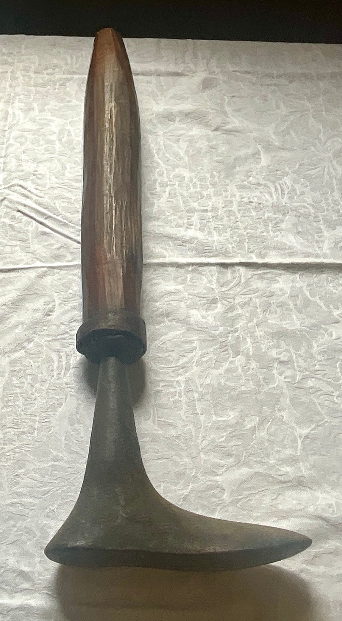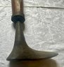 An antique wooden handled cobblers tool with iron foot.