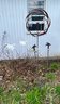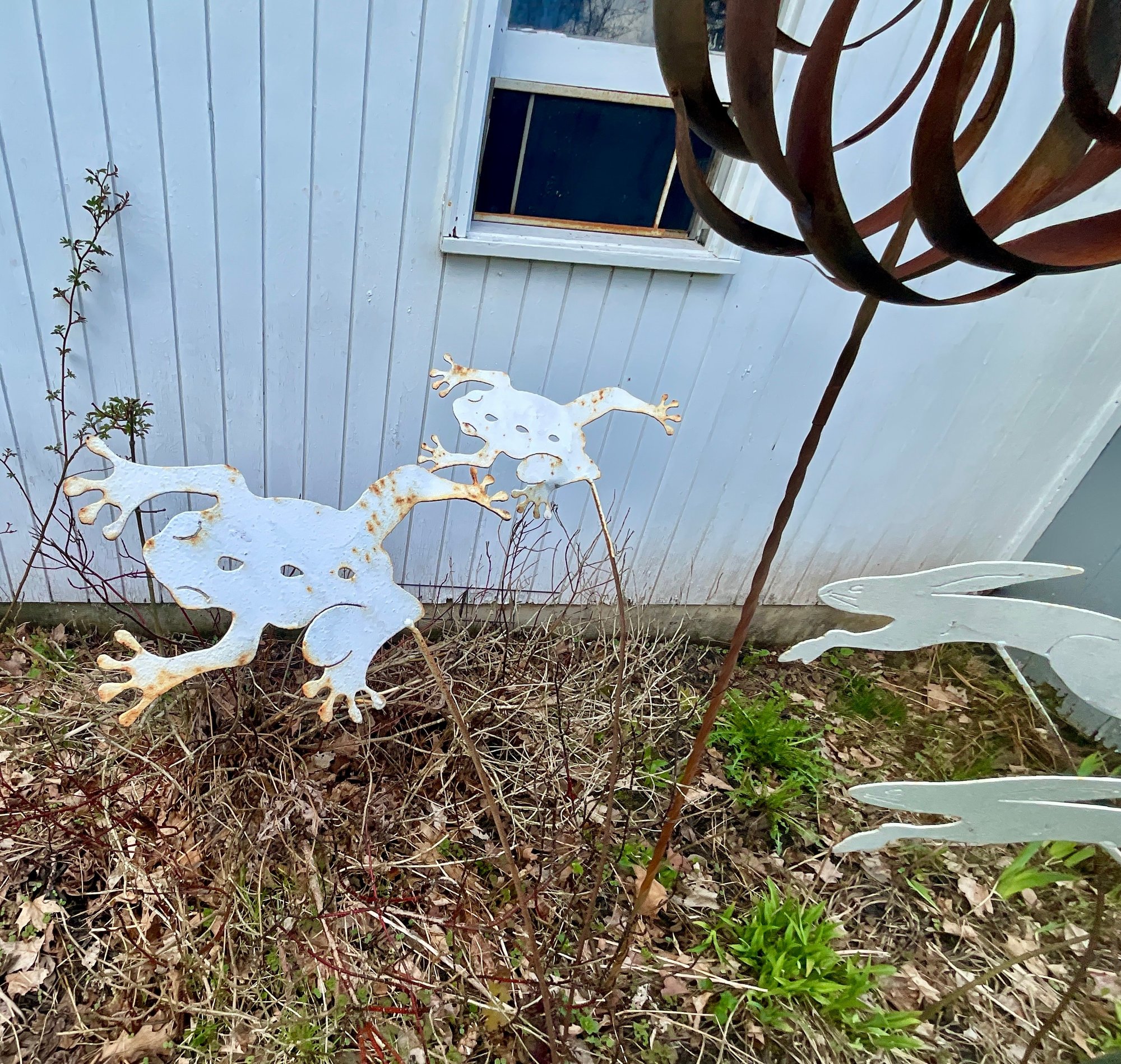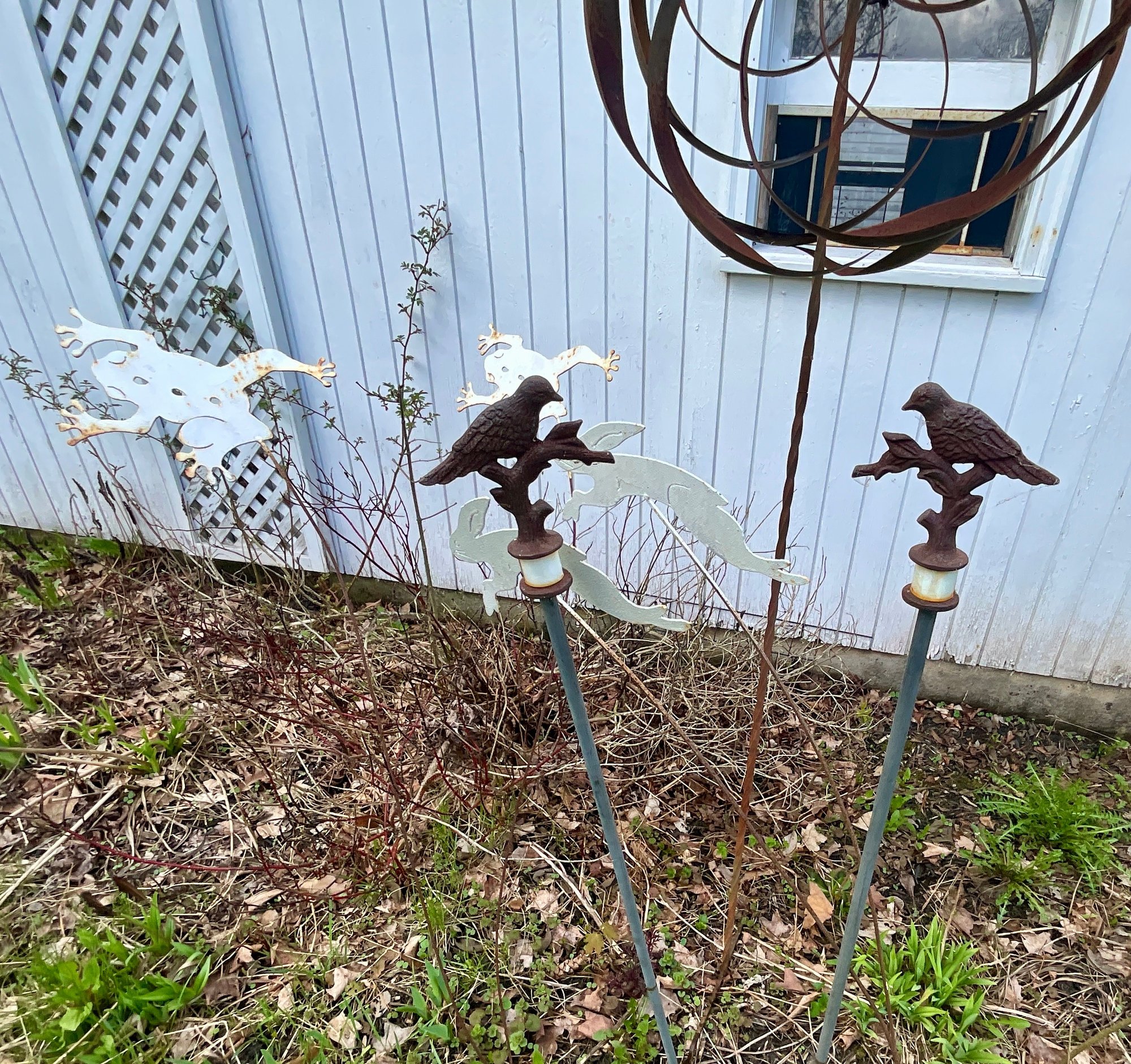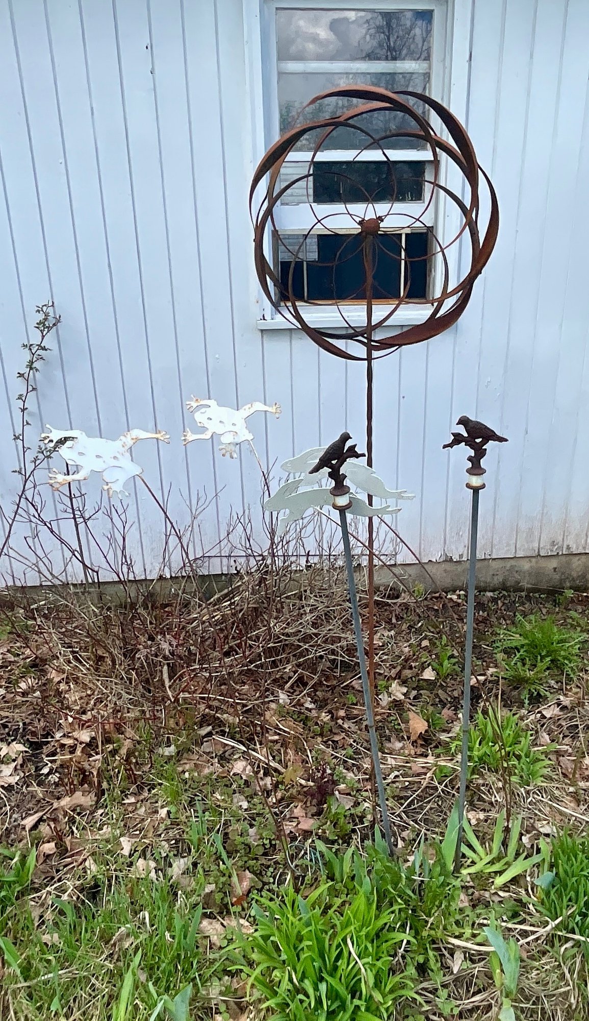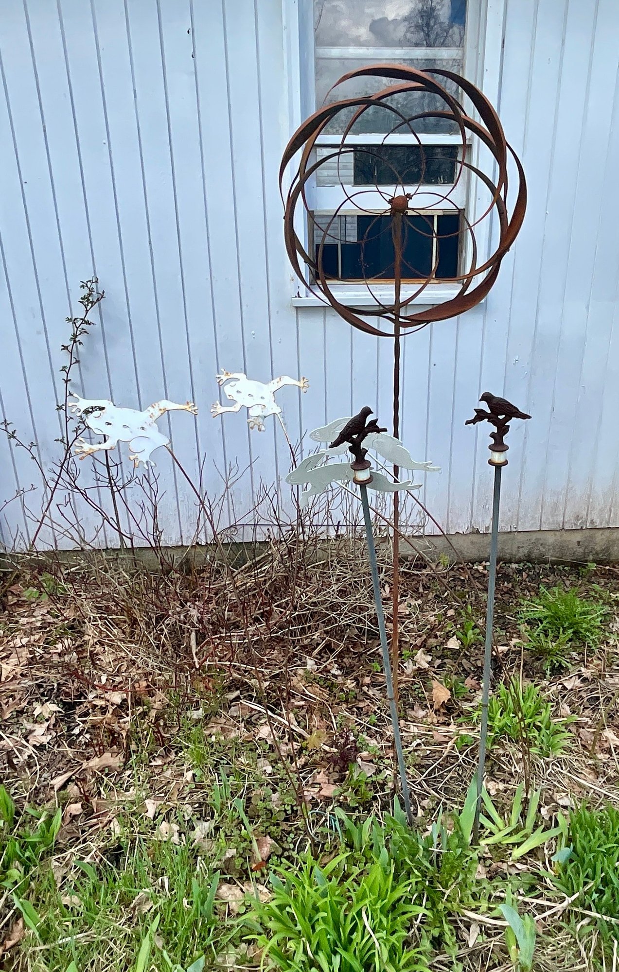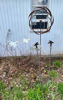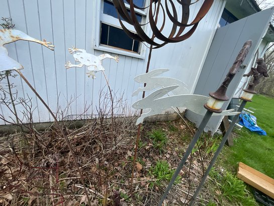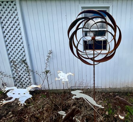 Contemporary whirly gig lawn ornament, garden stakes, and a garden frog and bird.