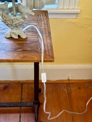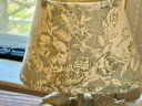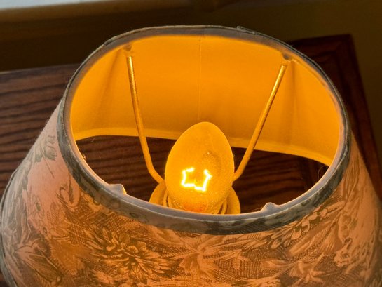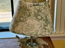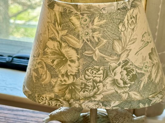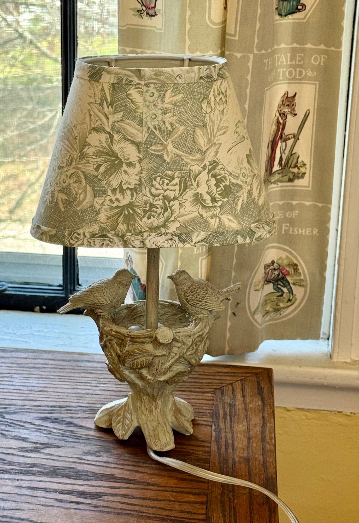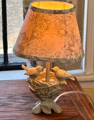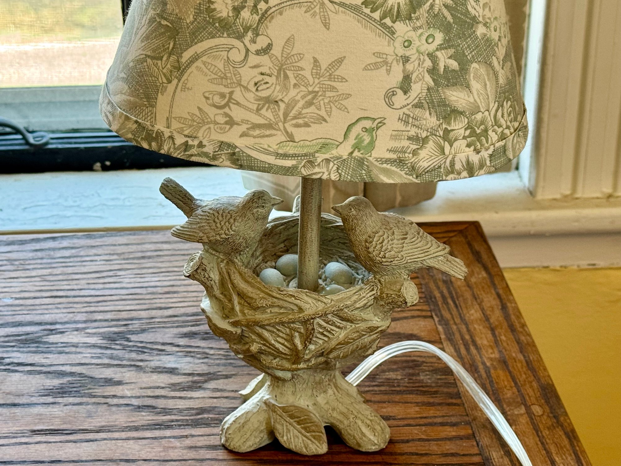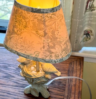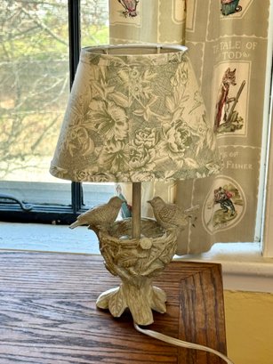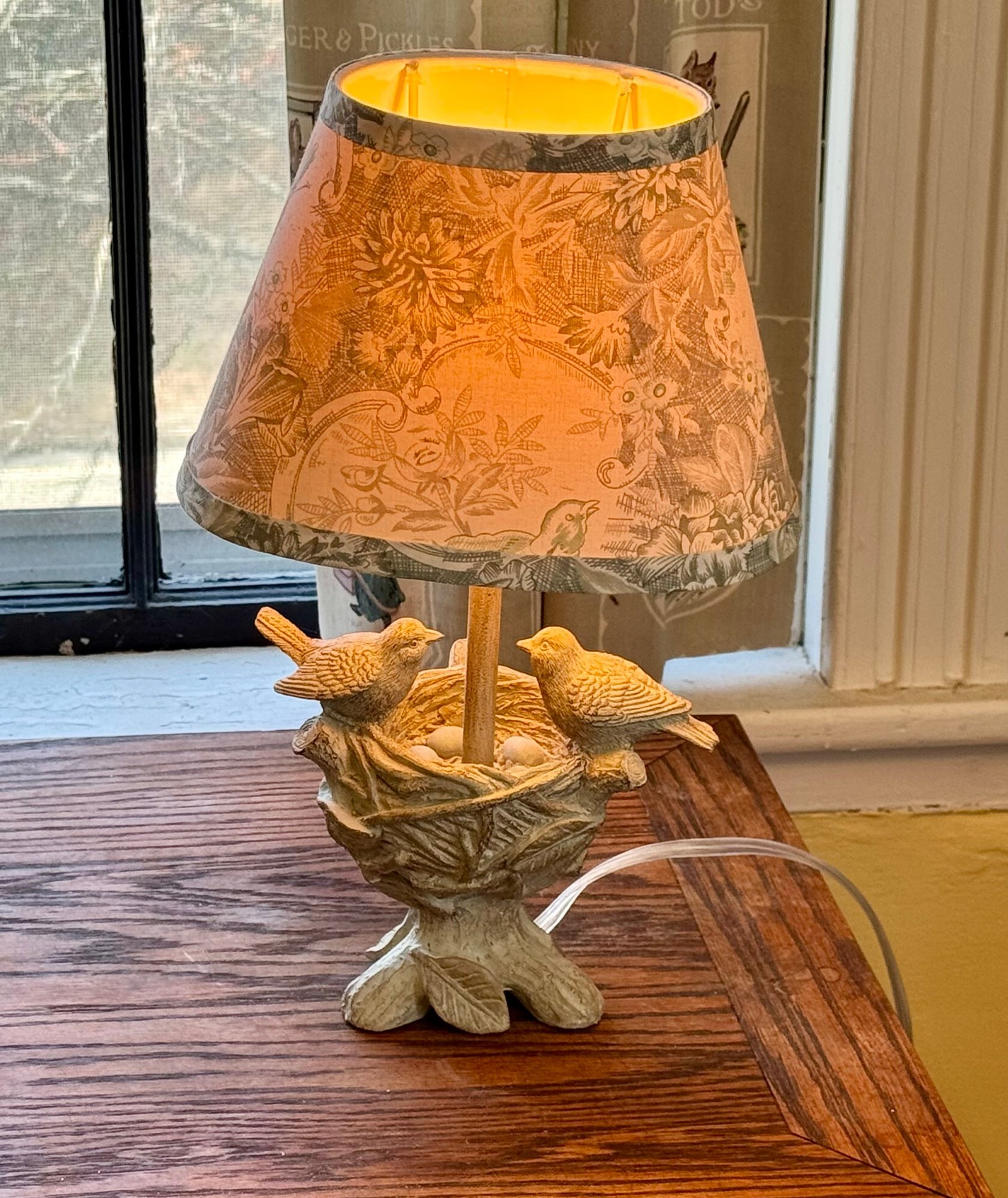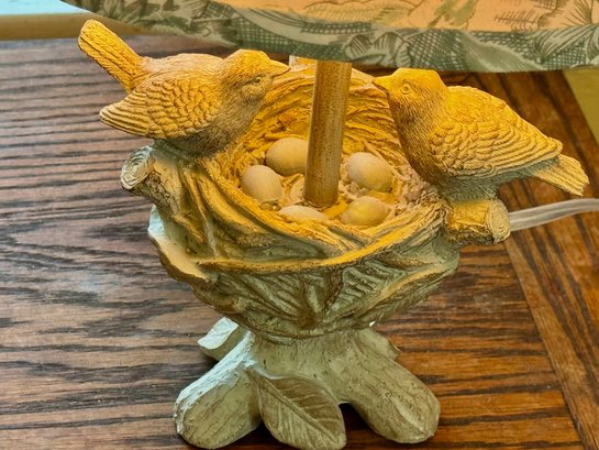 A sweet smaller decorative table lamp, base with two birds perched on a birds nest, with a textile shade.