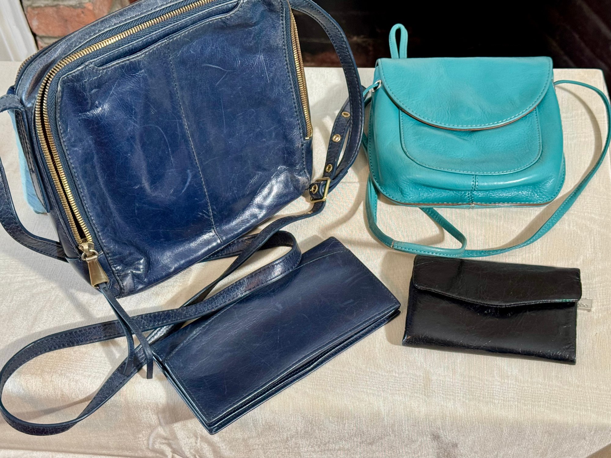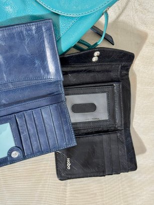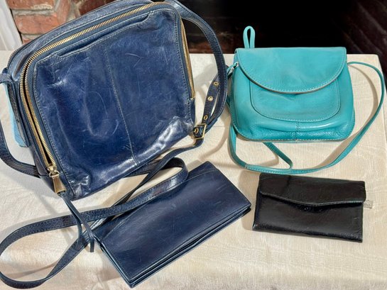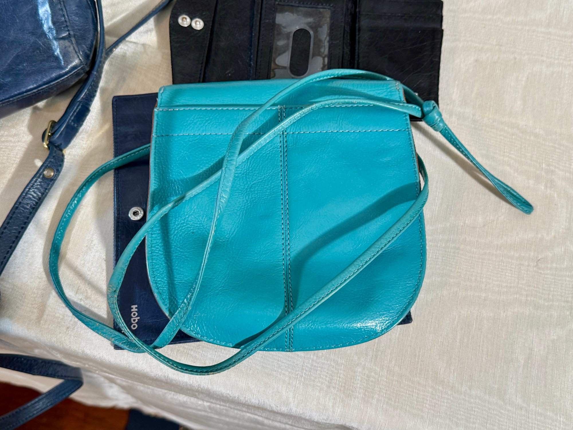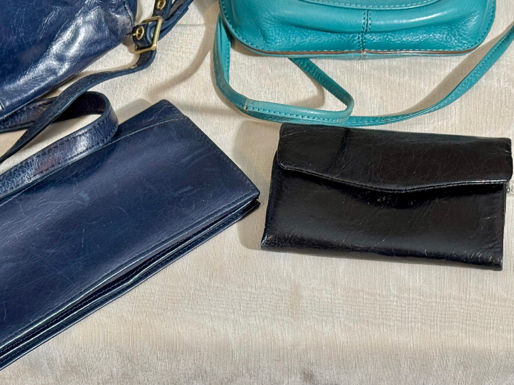 A Hobo navy blue purse, a navy blue wallet, a teal bag, and a black wallet.