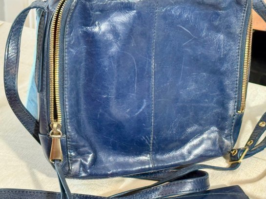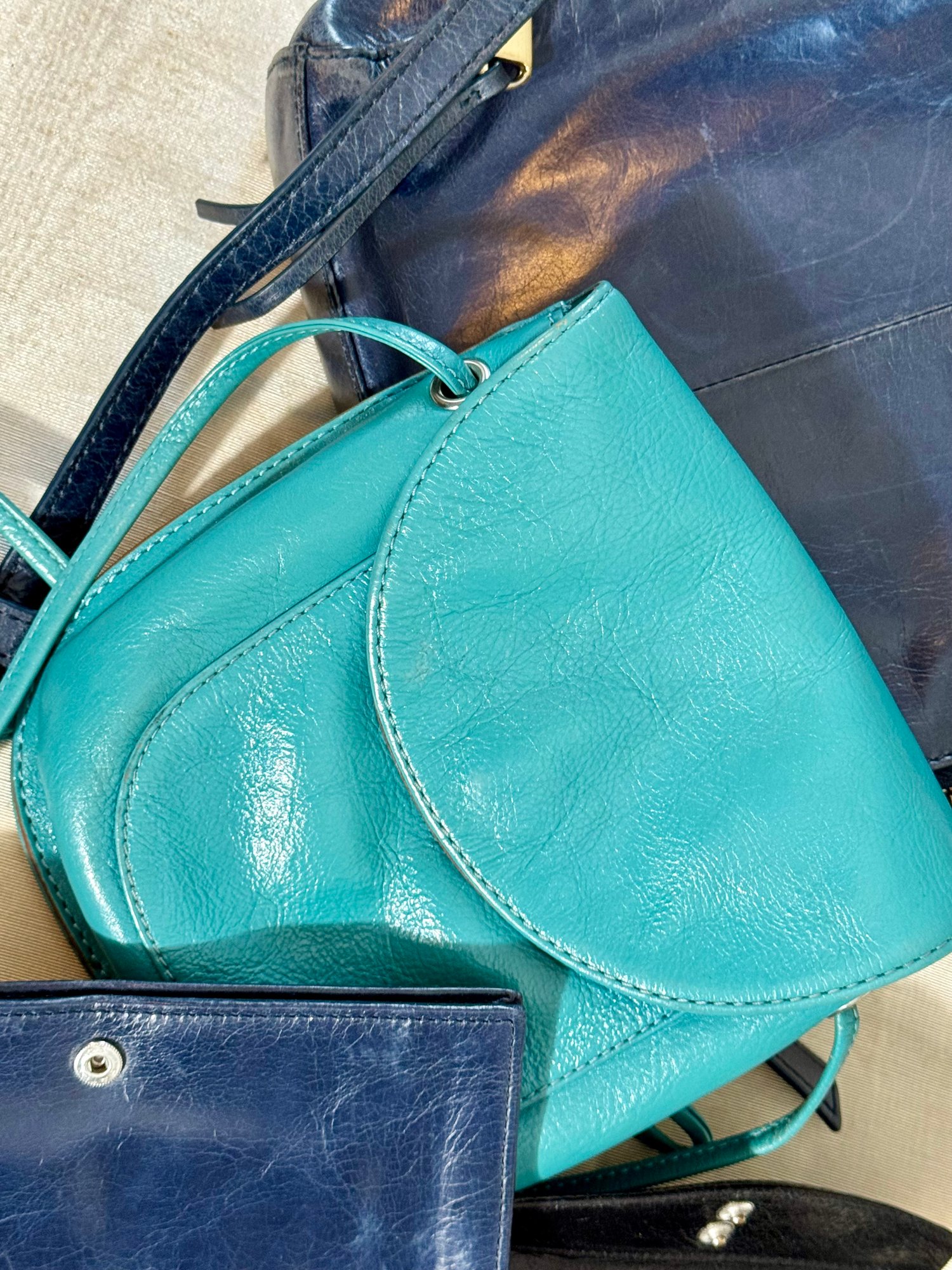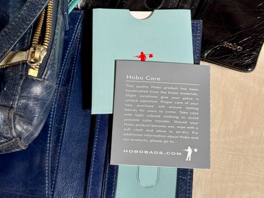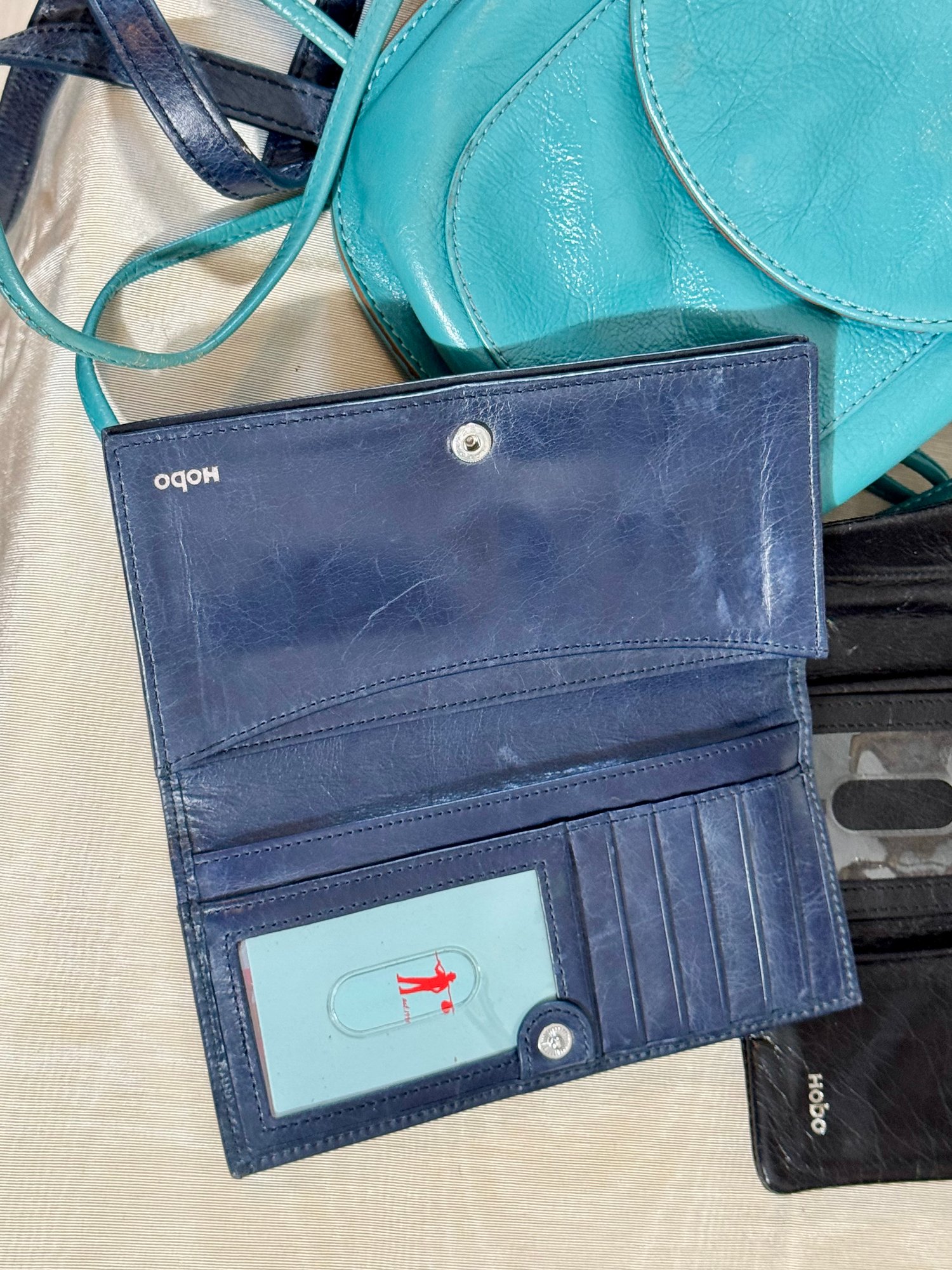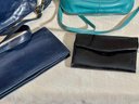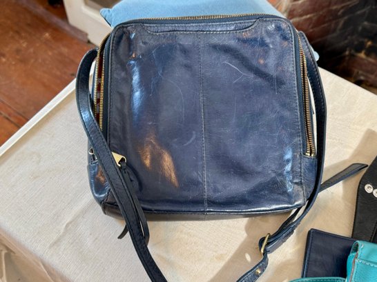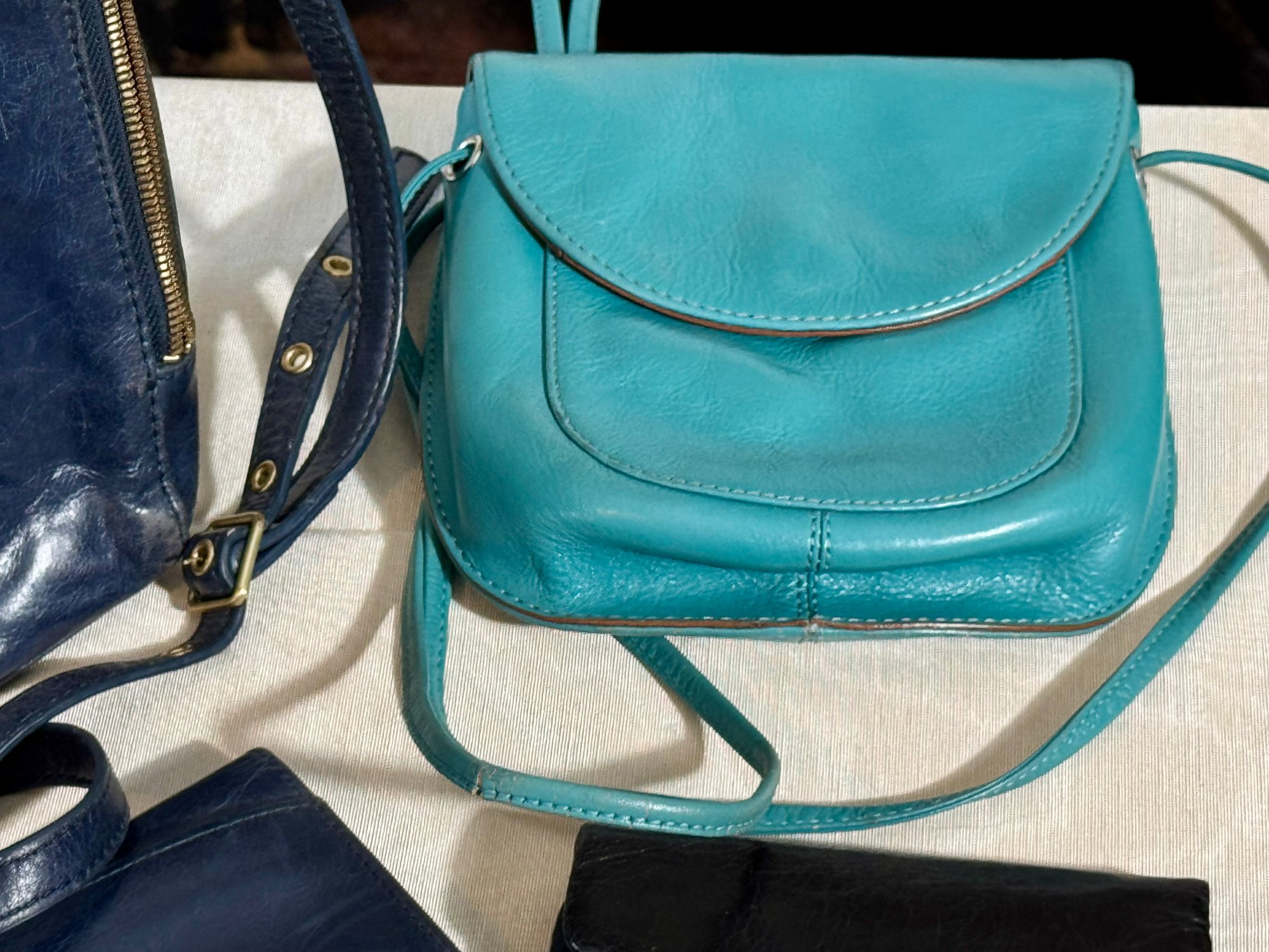 A Hobo navy blue purse, a navy blue wallet, a teal bag, and a black wallet.