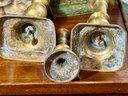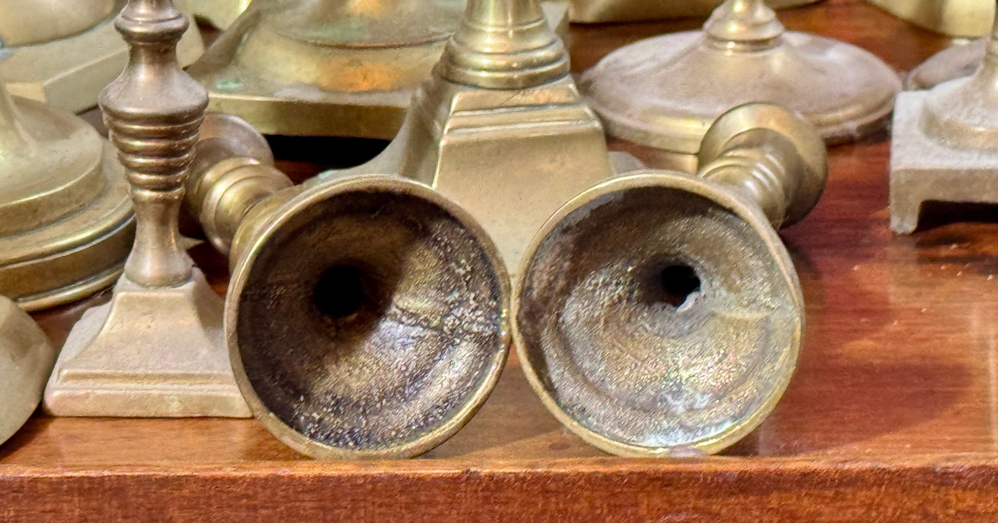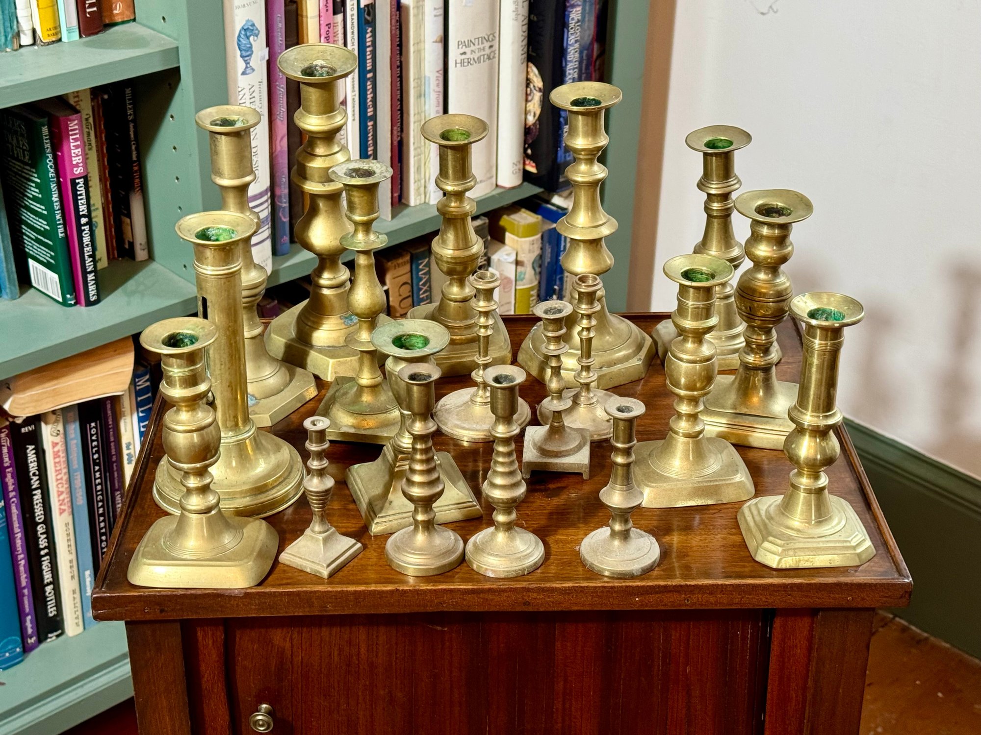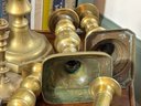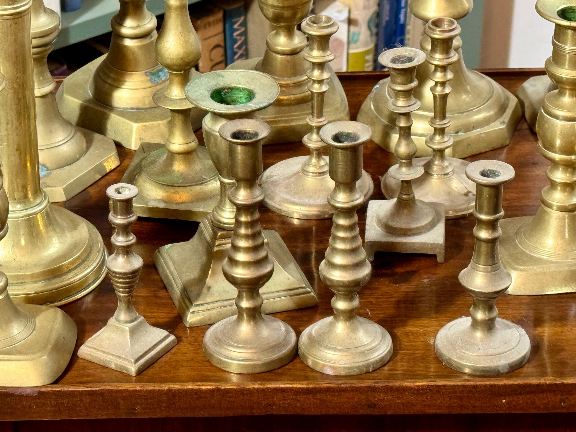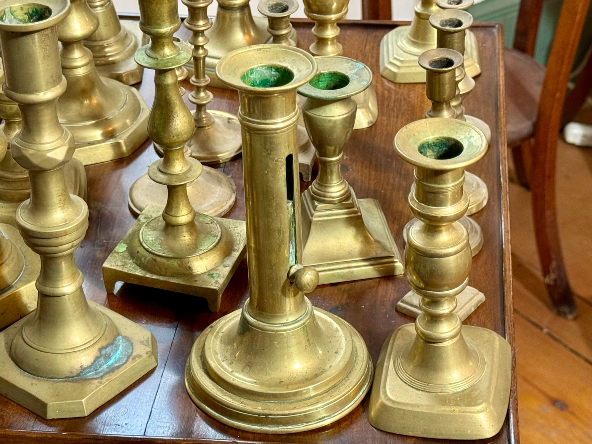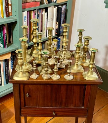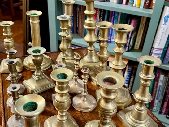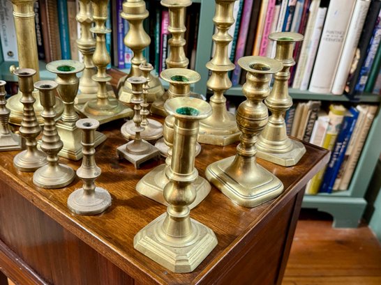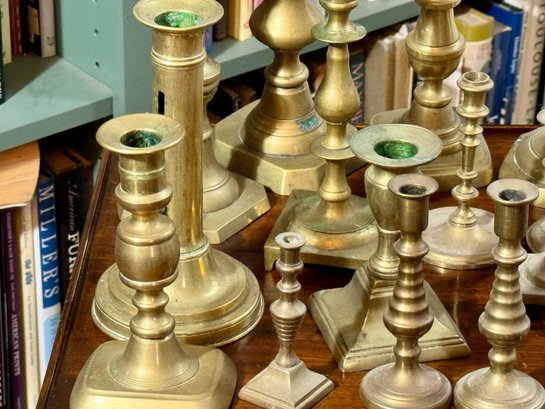 A collection of nineteen antique brass candlesticks, some with push ups, eight smaller, and eleven others. Some are antique, some are newer.