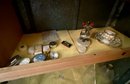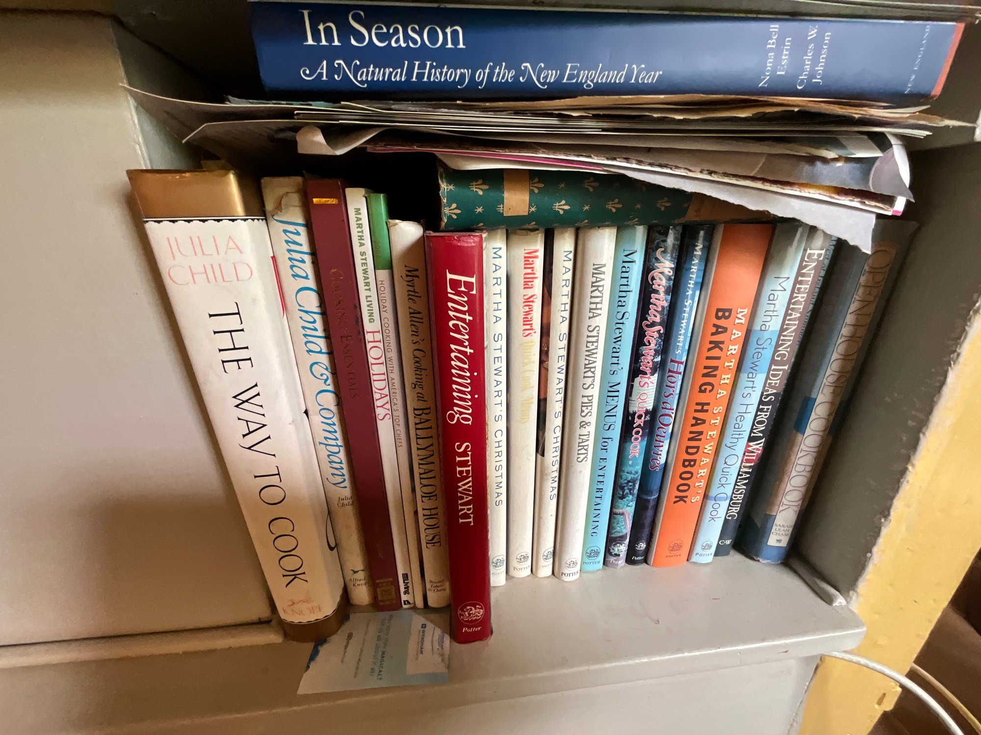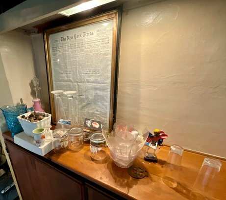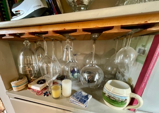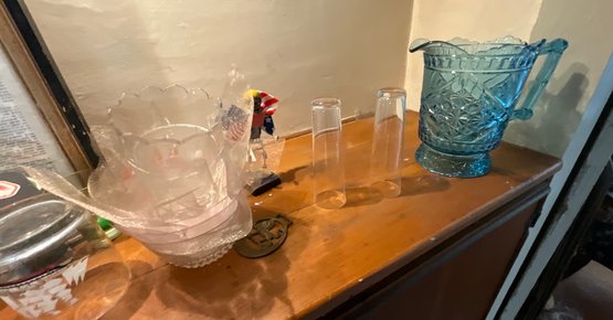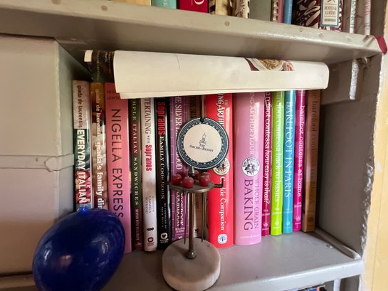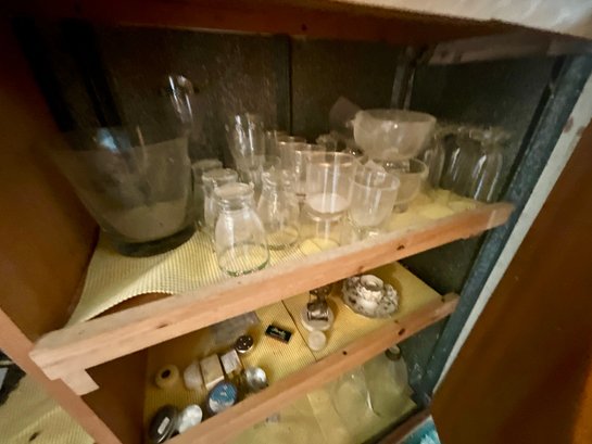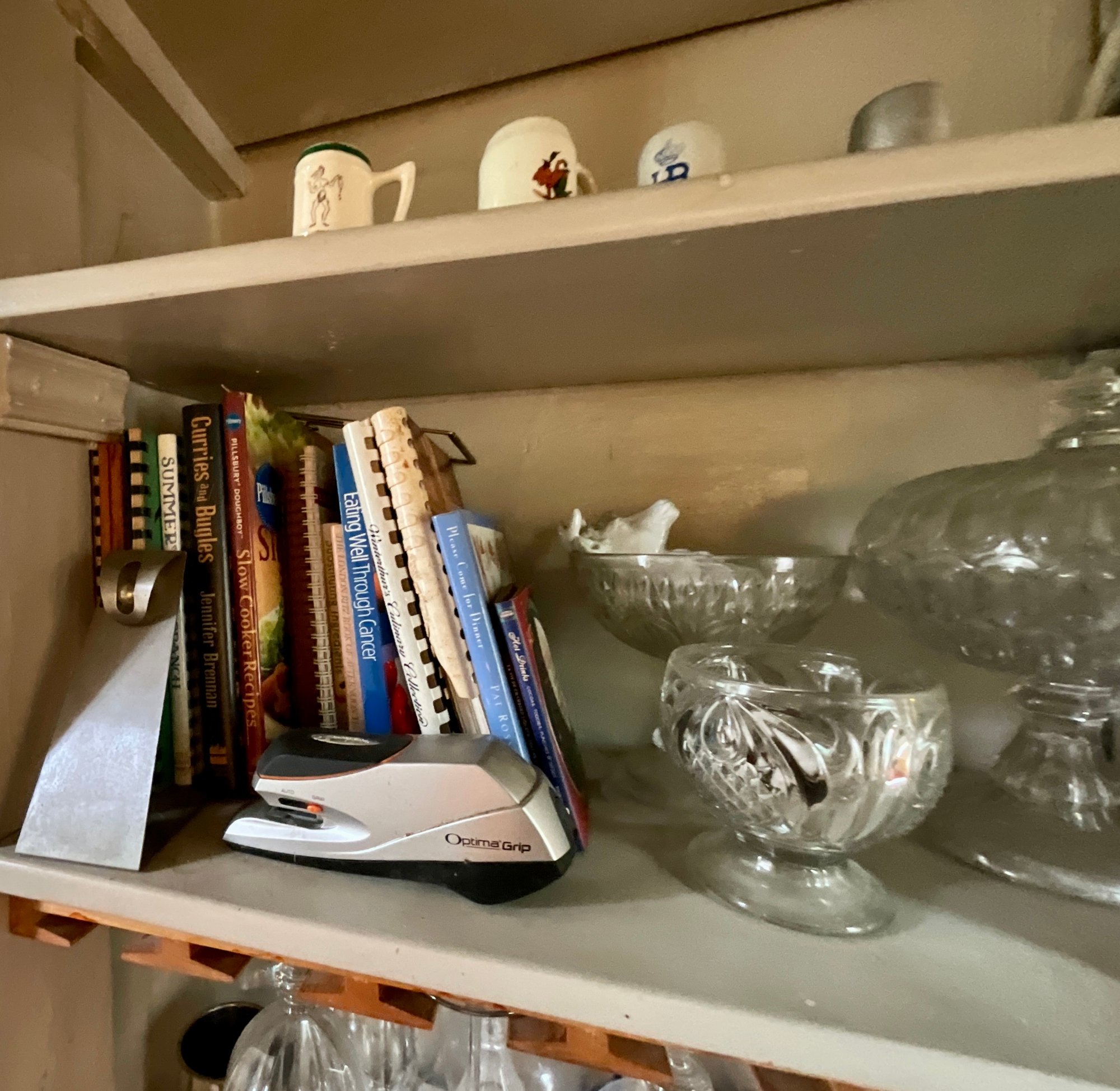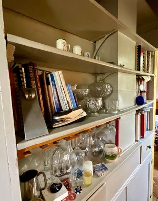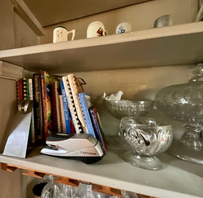 The contents of cabinets, including: cook books, decanters, glassware, pitchers, blue and white tiles, compotes, covered glass candy jars and more.