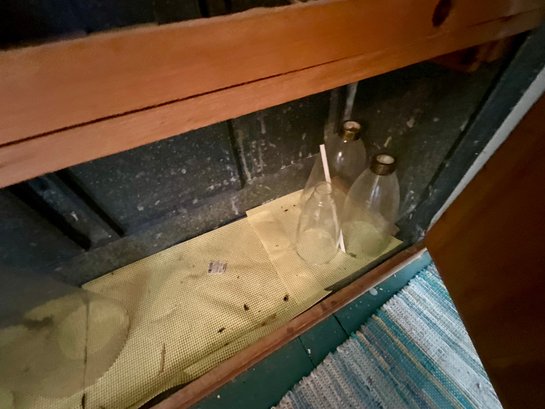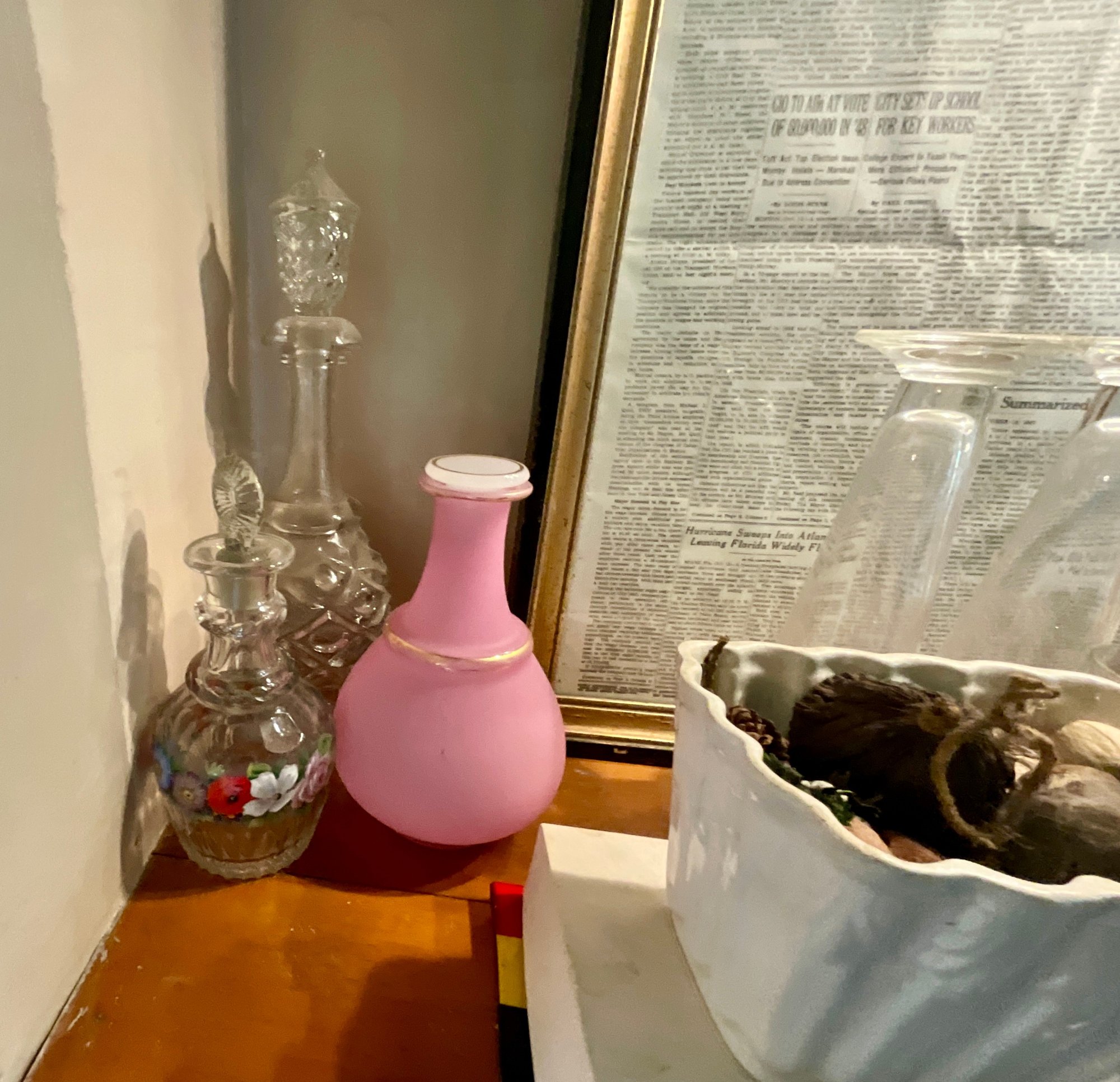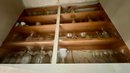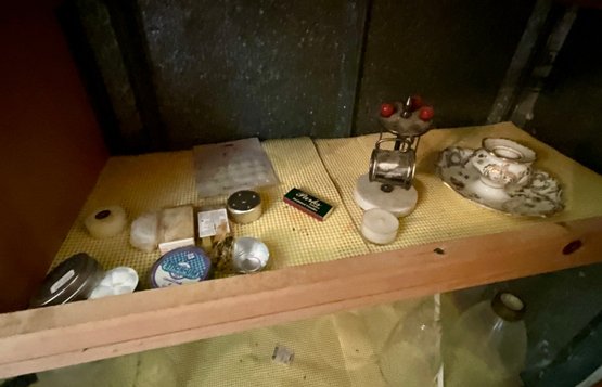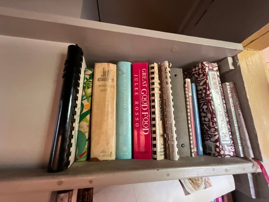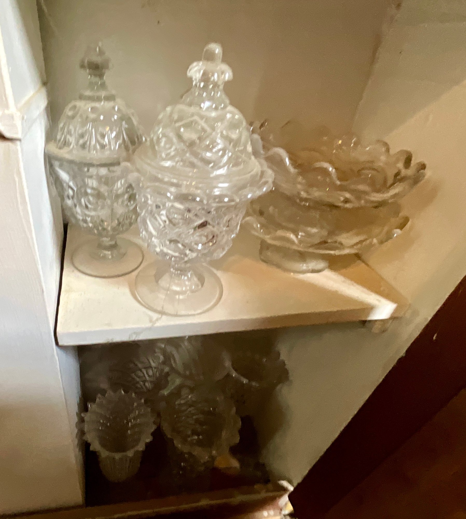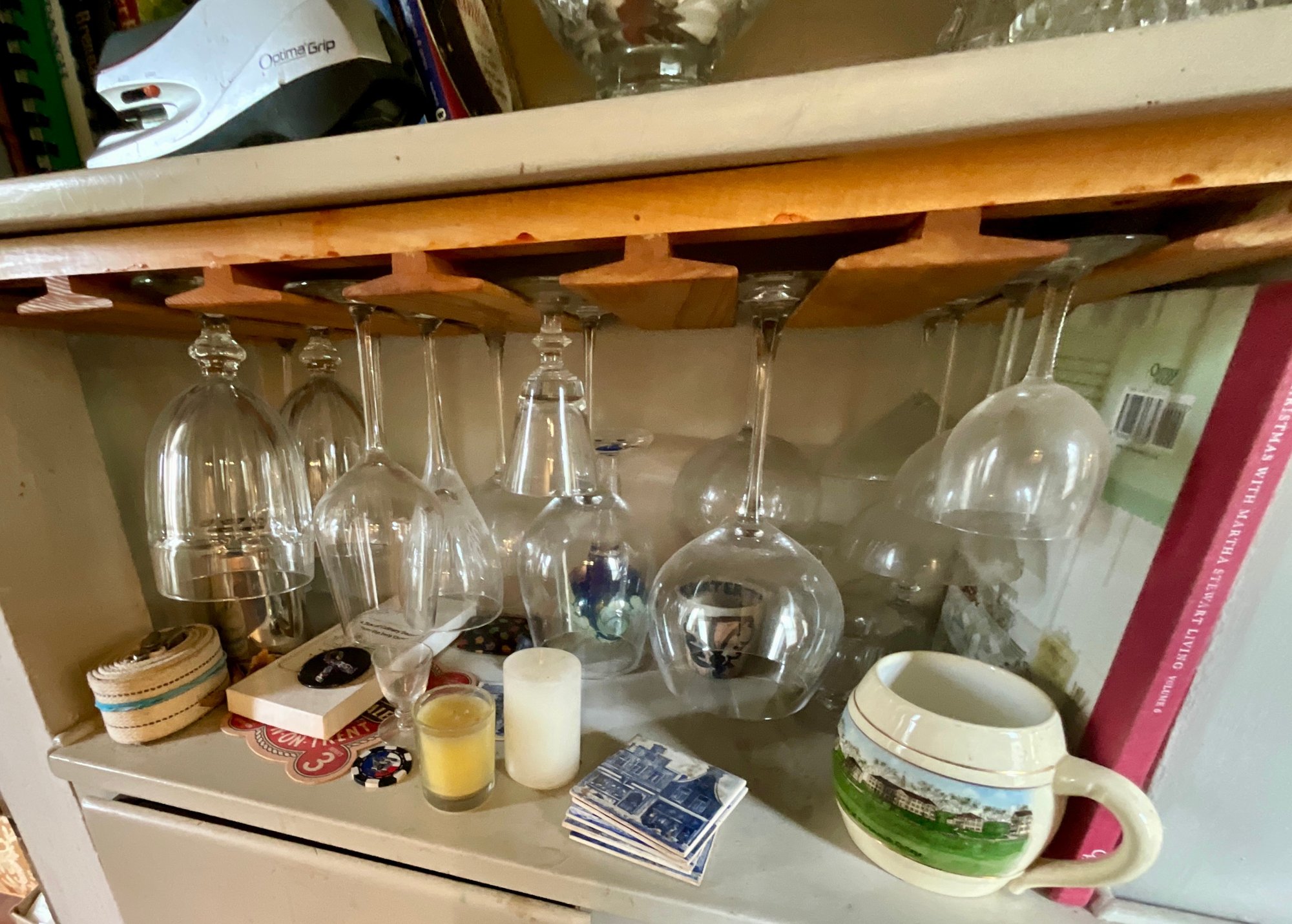 The contents of cabinets, including: cook books, decanters, glassware, pitchers, blue and white tiles, compotes, covered glass candy jars and more.