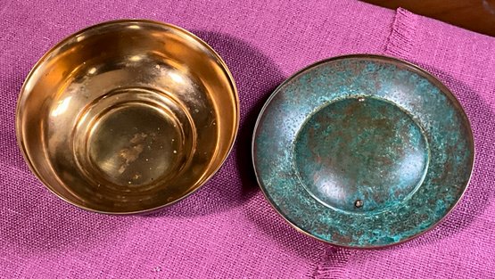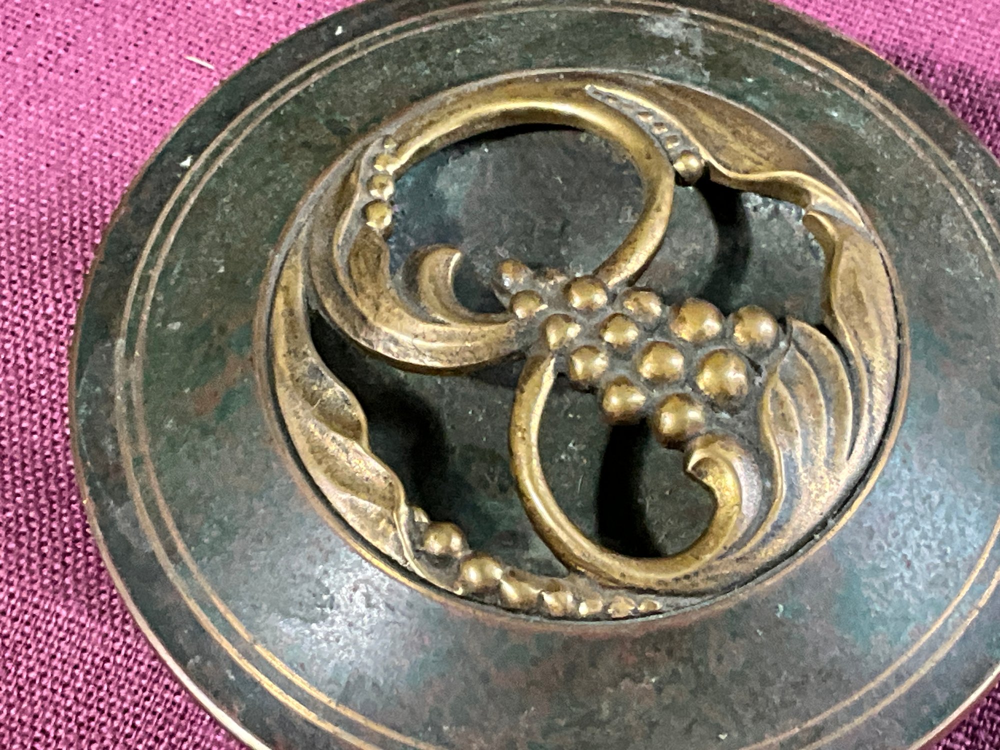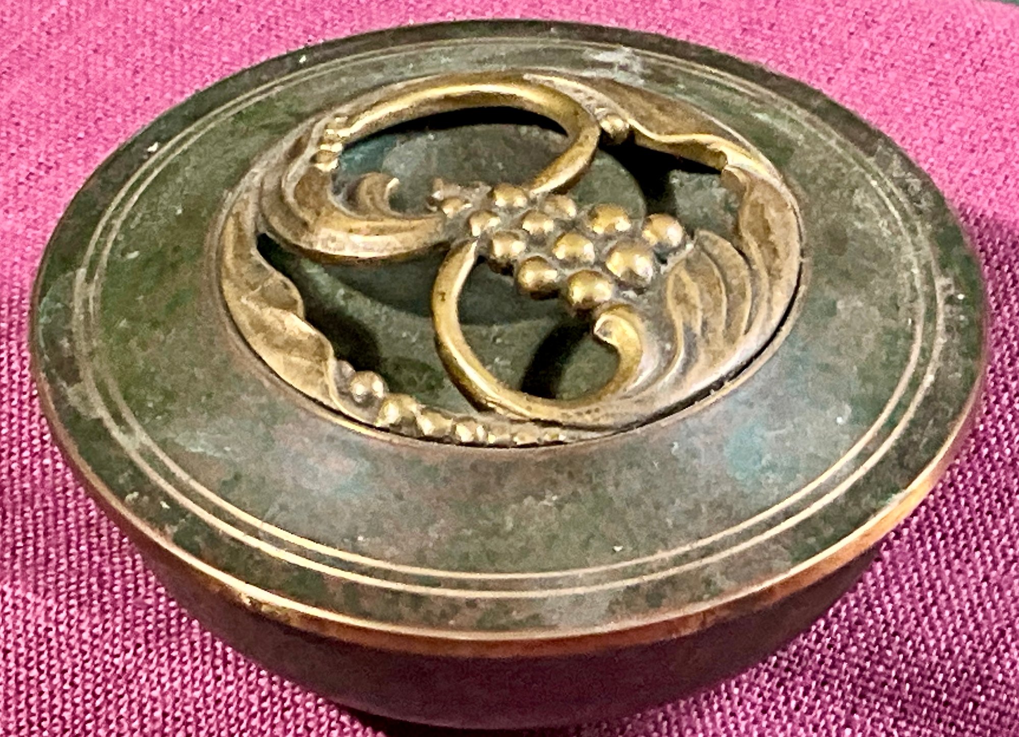 A signed Carl Sorensen Art Deco bronze bowl with a grape design lid.