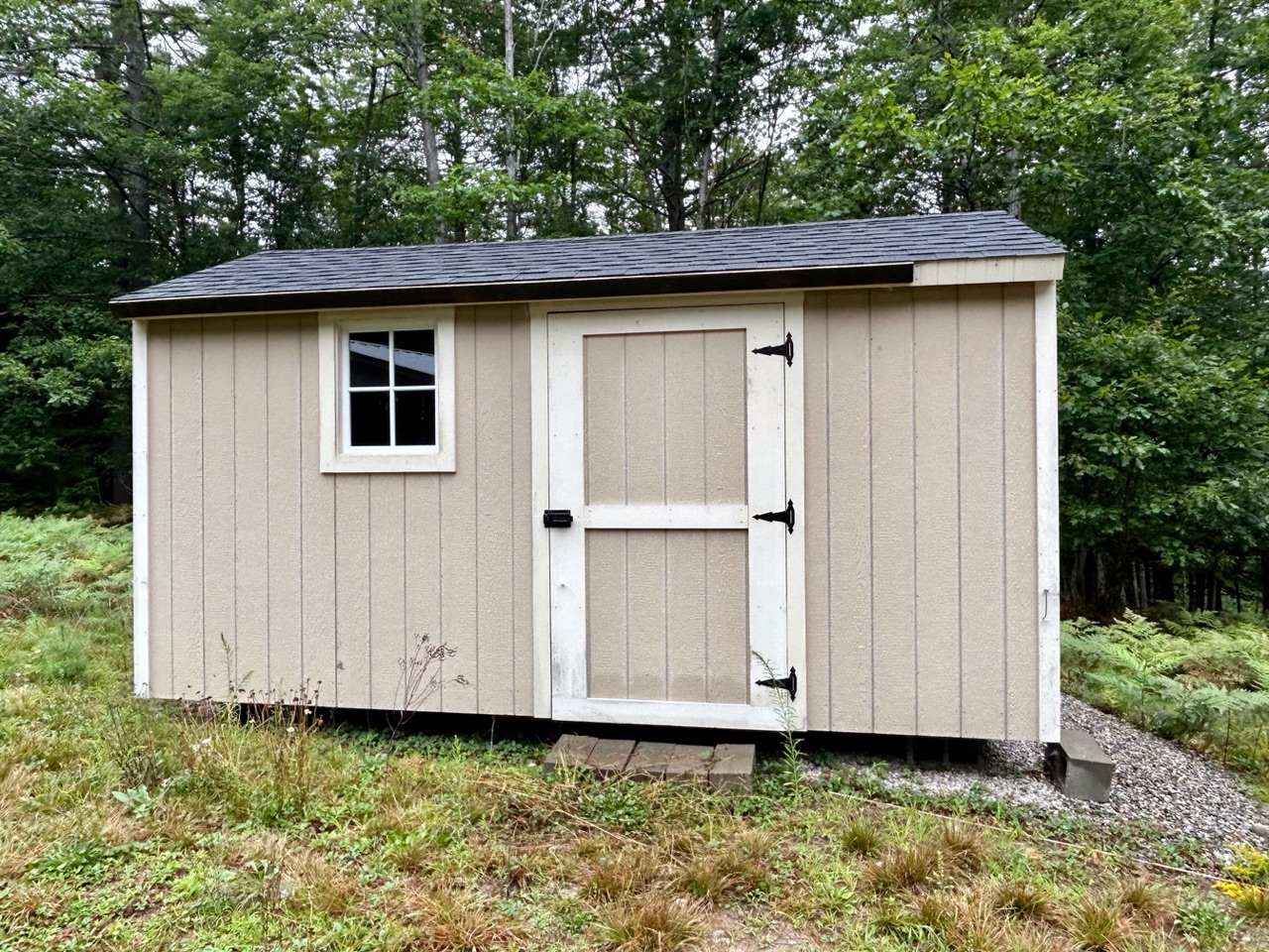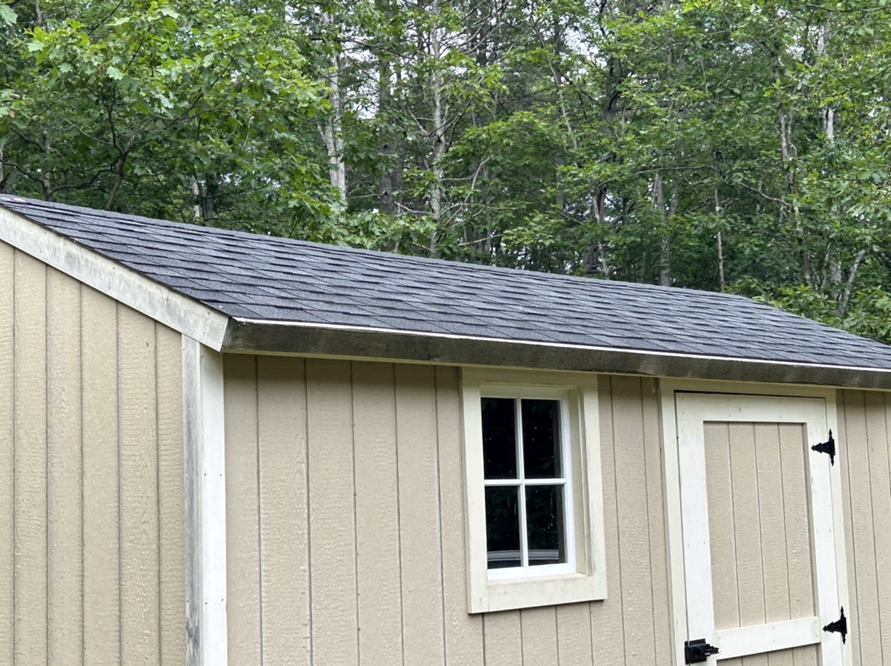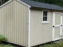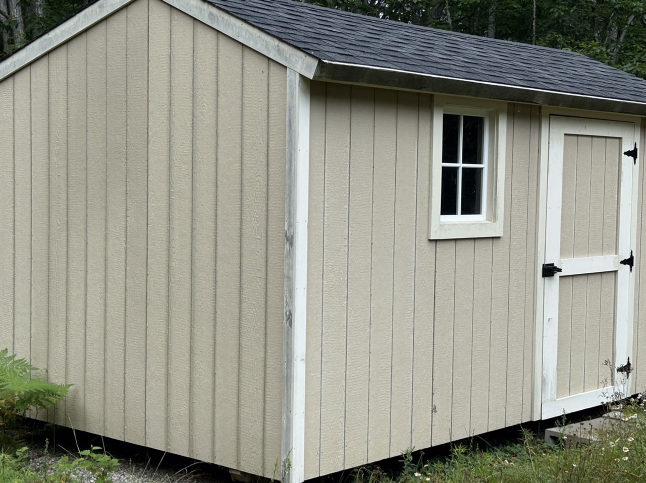 A one door wood carriage/garden shed, LP Smart Panel siding, asphalt shingle roof.