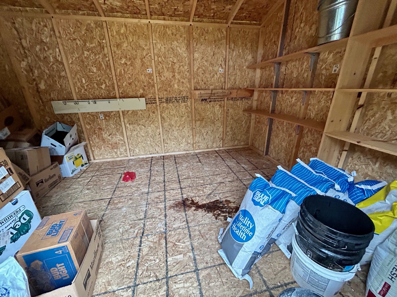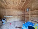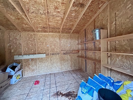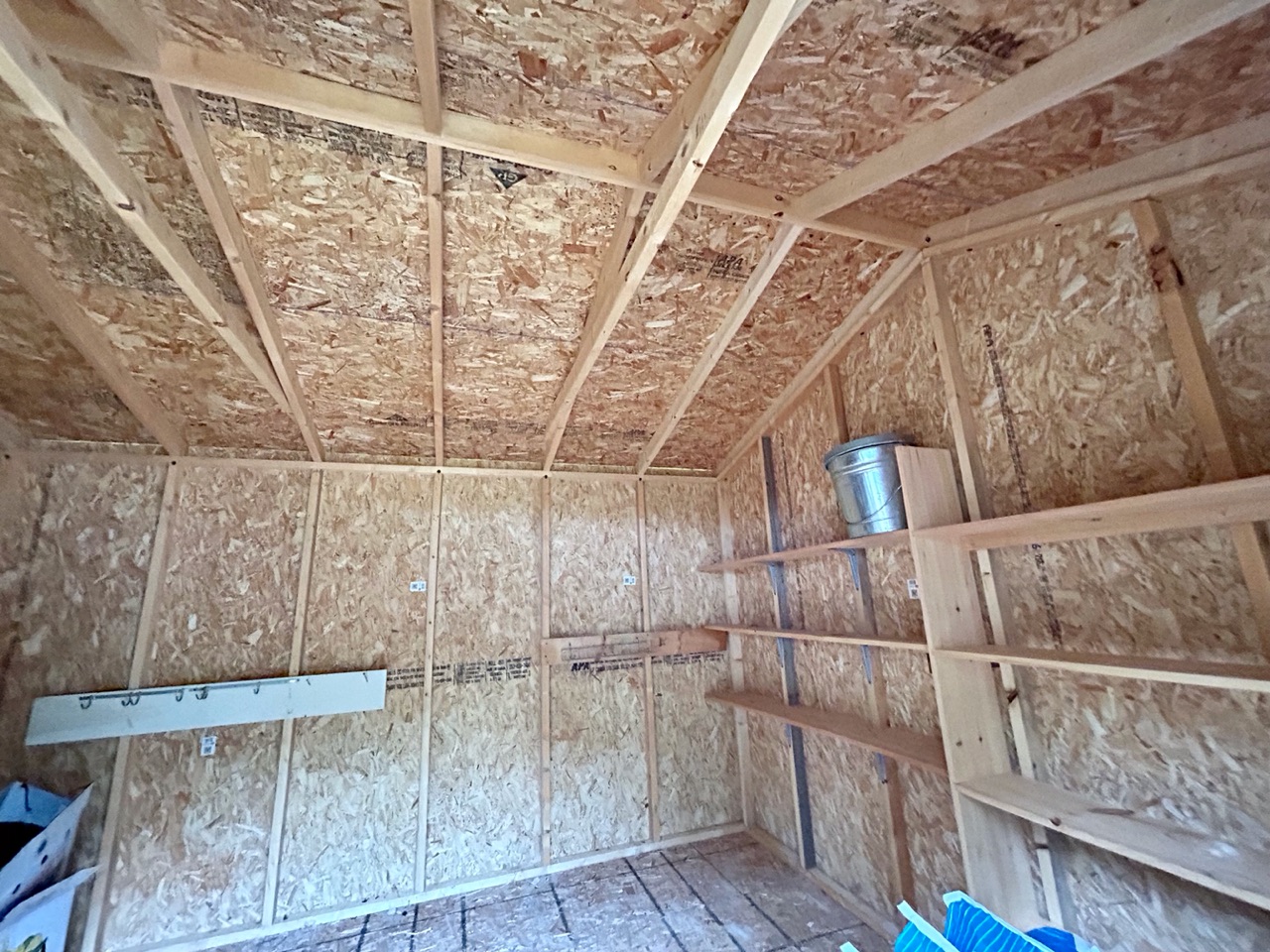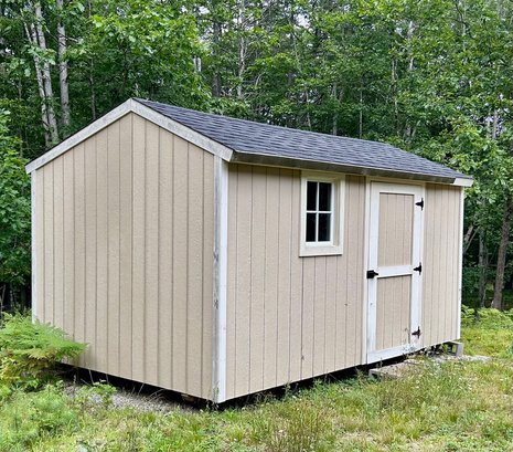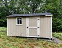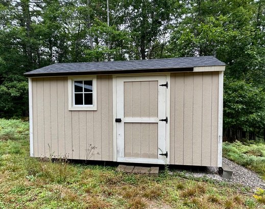 A one door wood carriage/garden shed, LP Smart Panel siding, asphalt shingle roof.