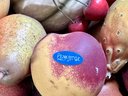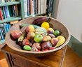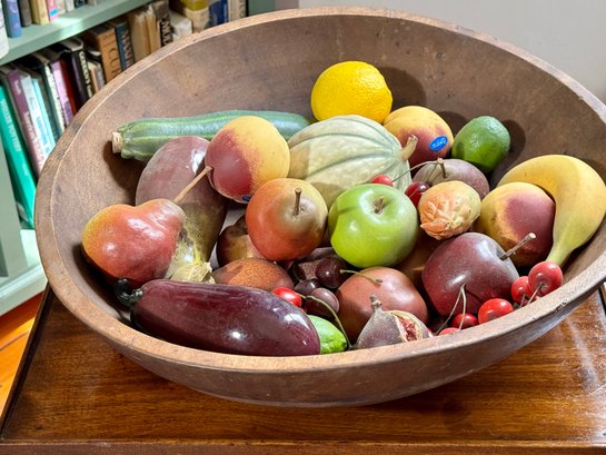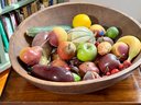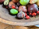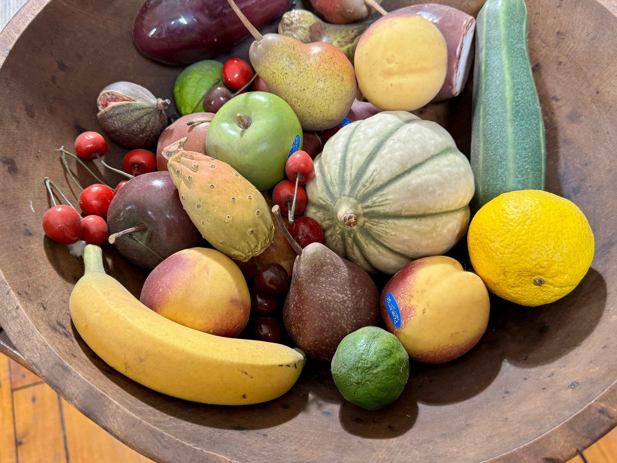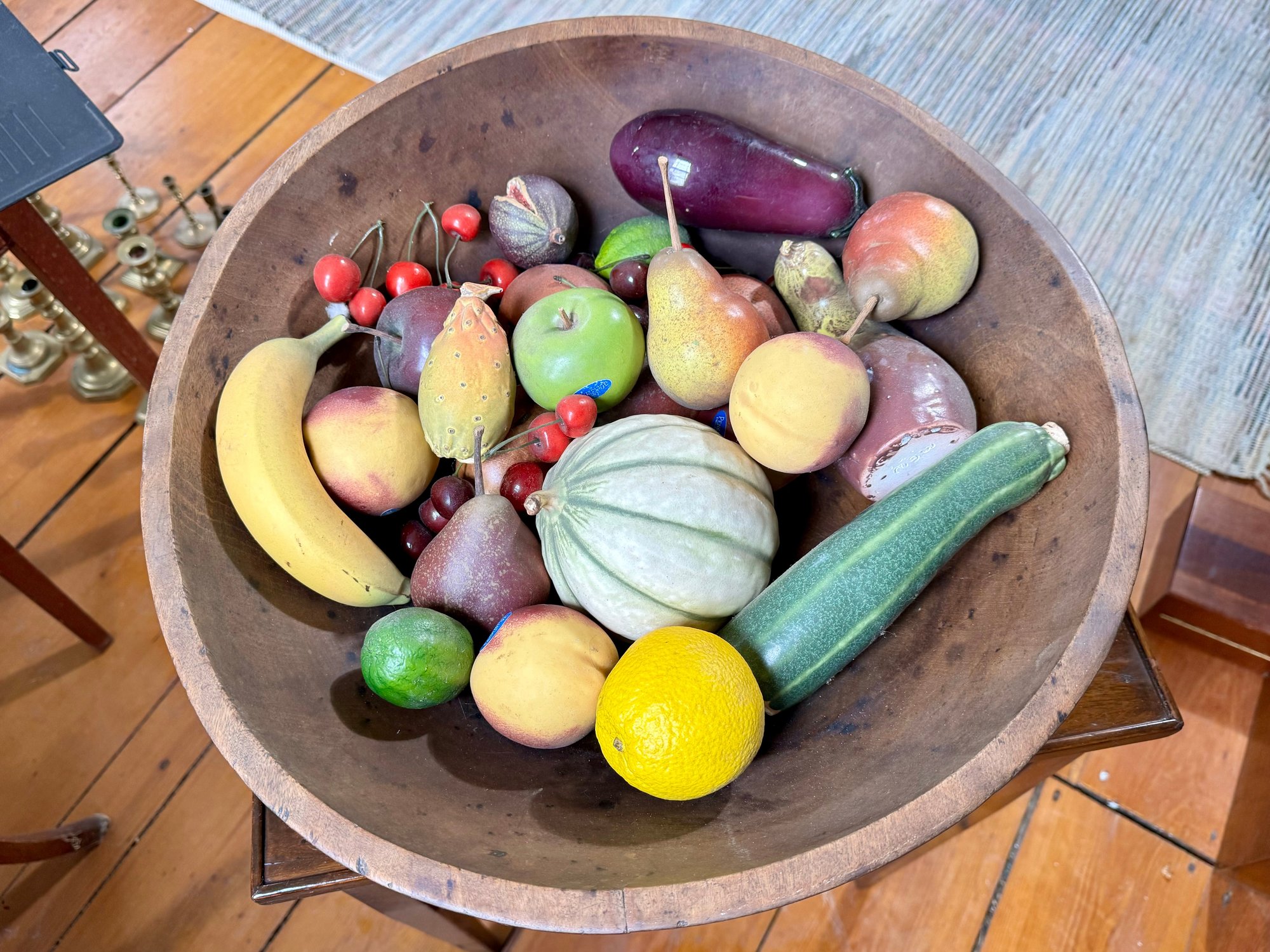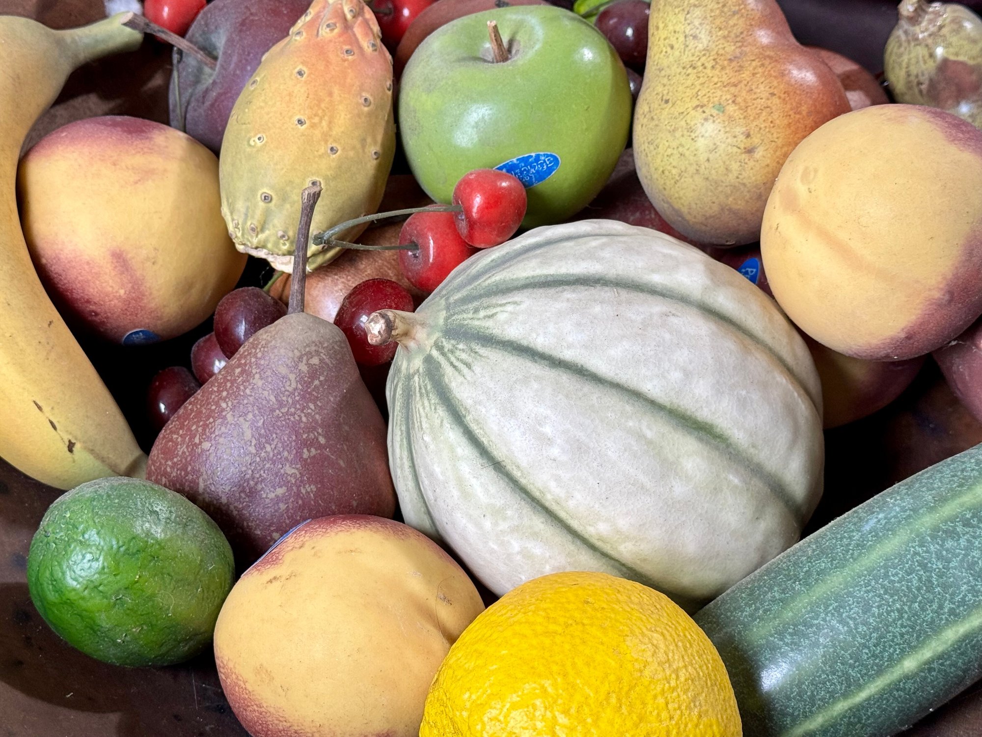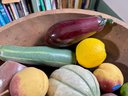 Contemporary decorative fruit and vegetables, including: glass eggplant, zucchini, bananas, pears, cherries, limes and lemons.