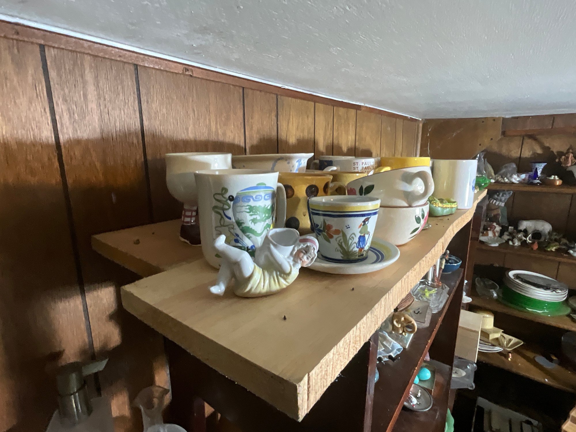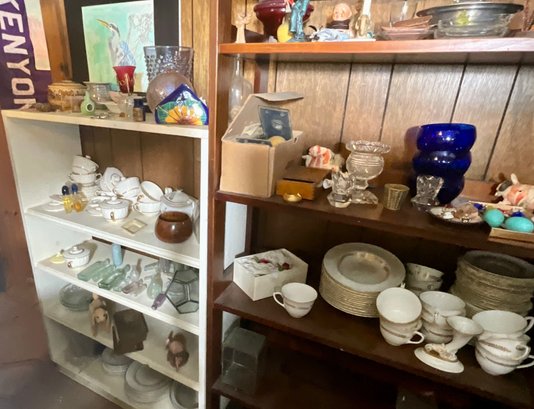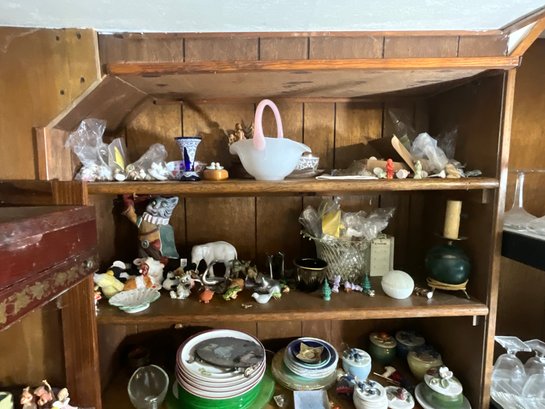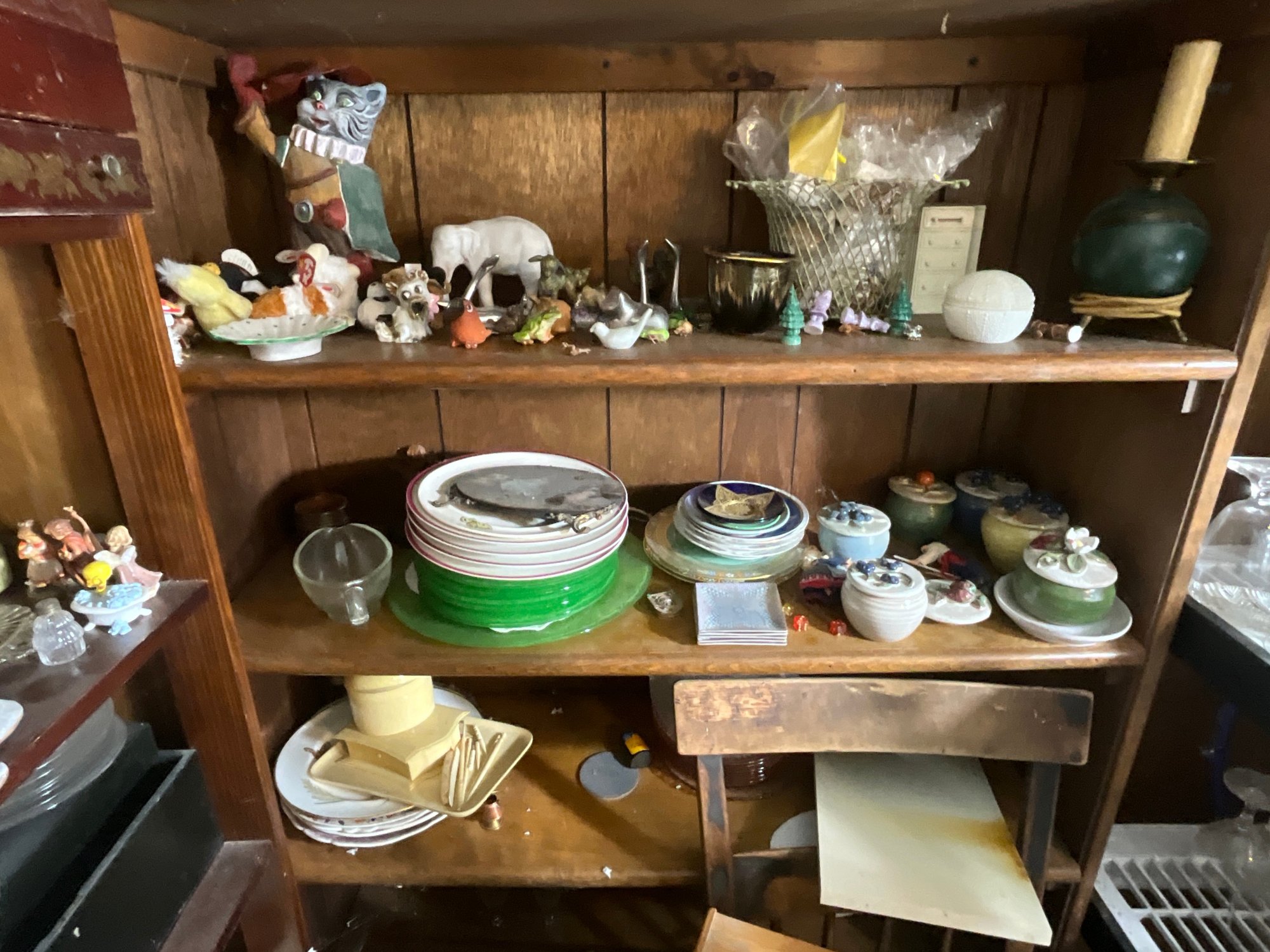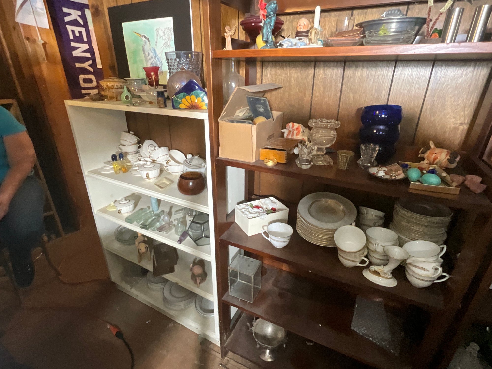 A basement treasure hunt, four book cases full of collectibles, including hand blown glass, china, celluloid and more.