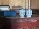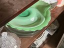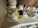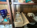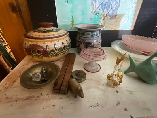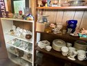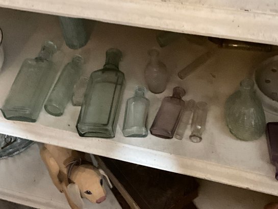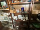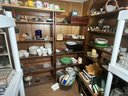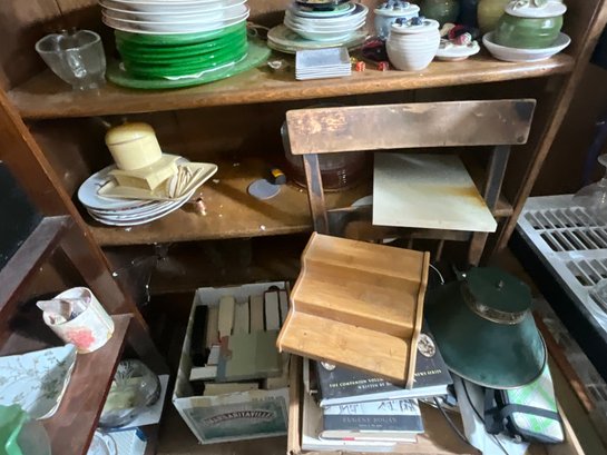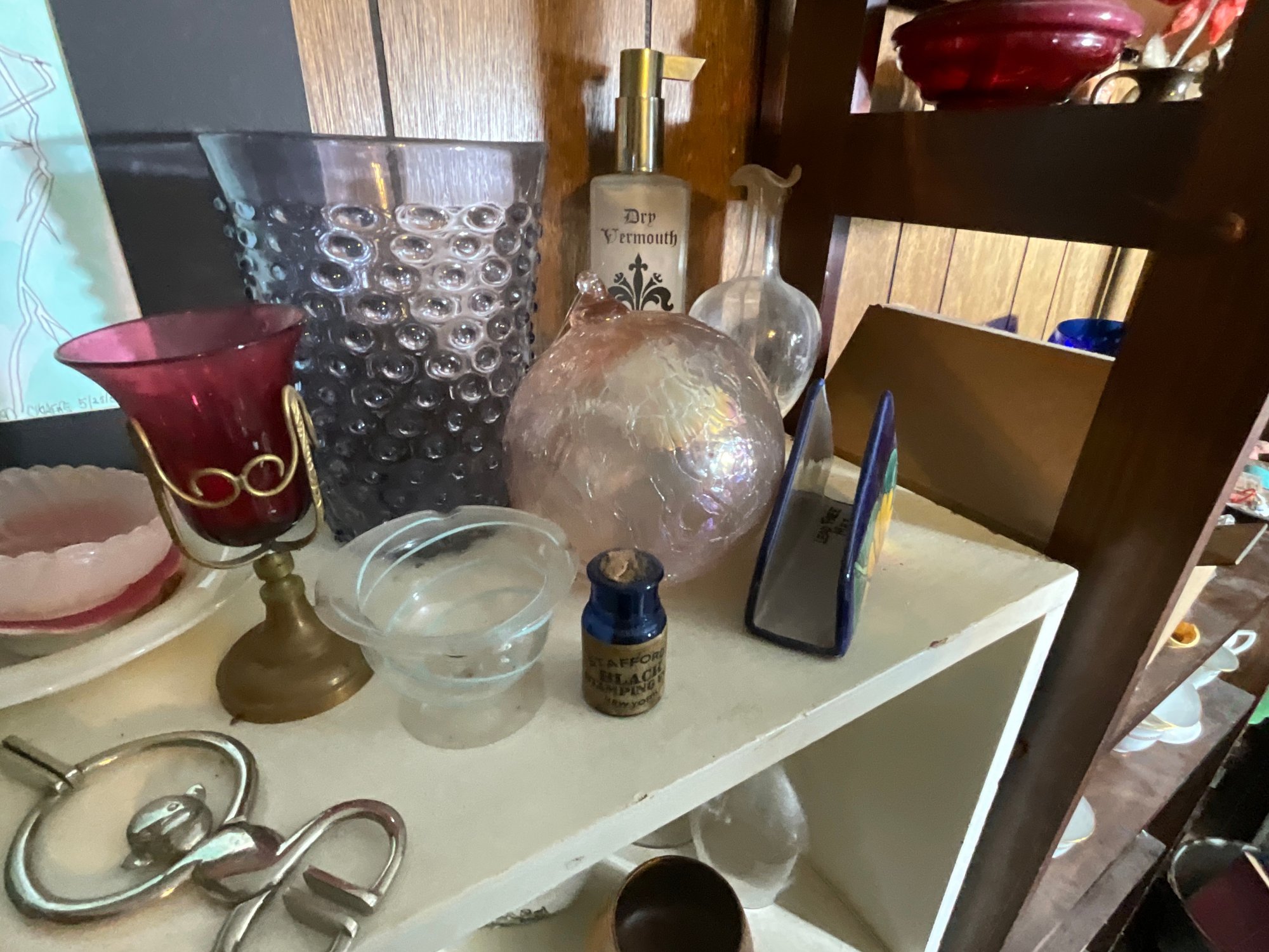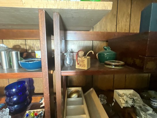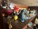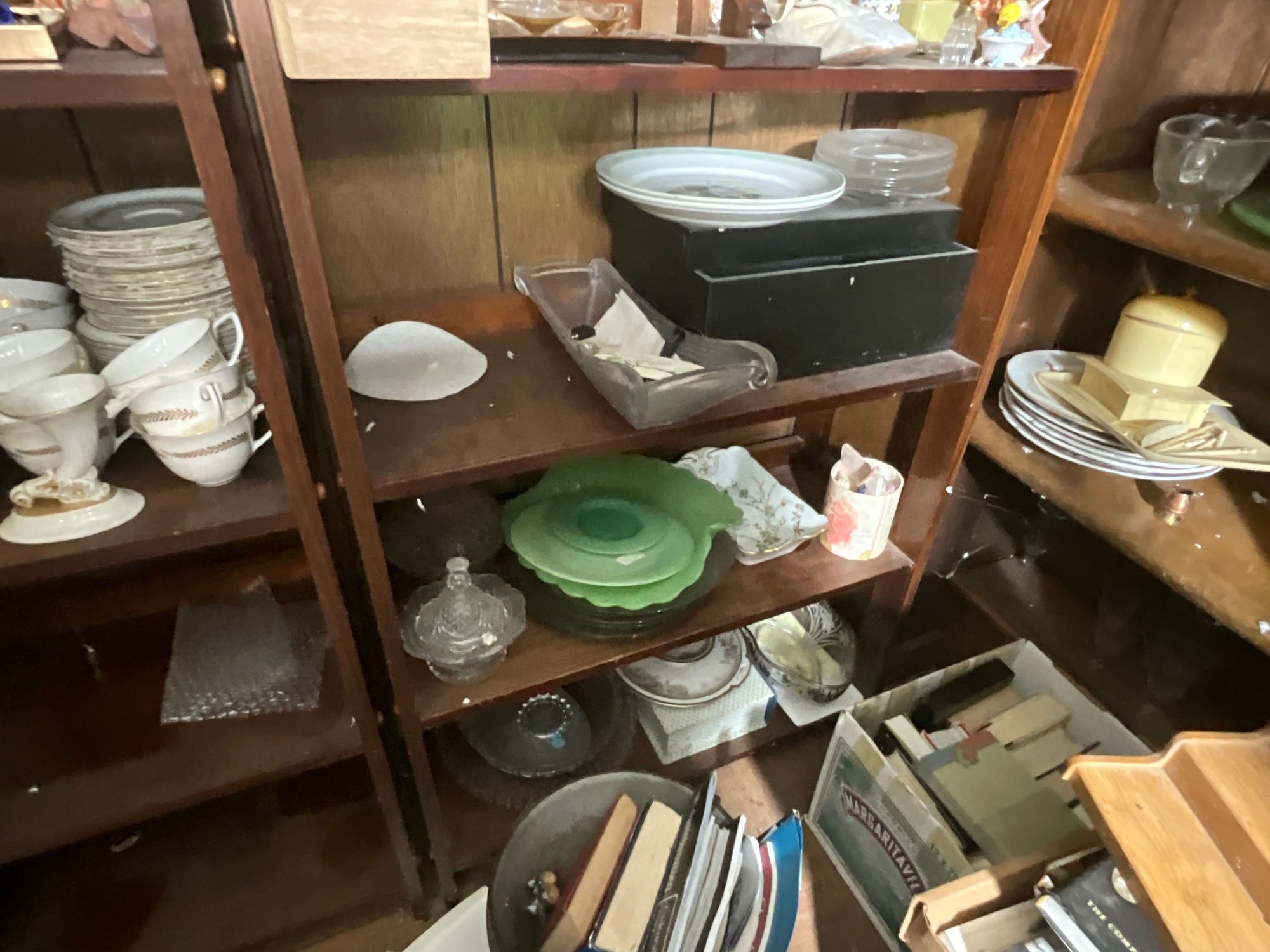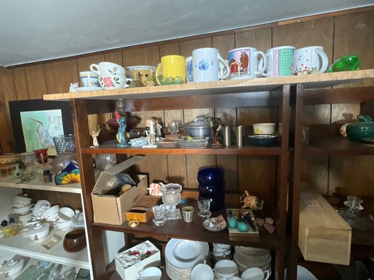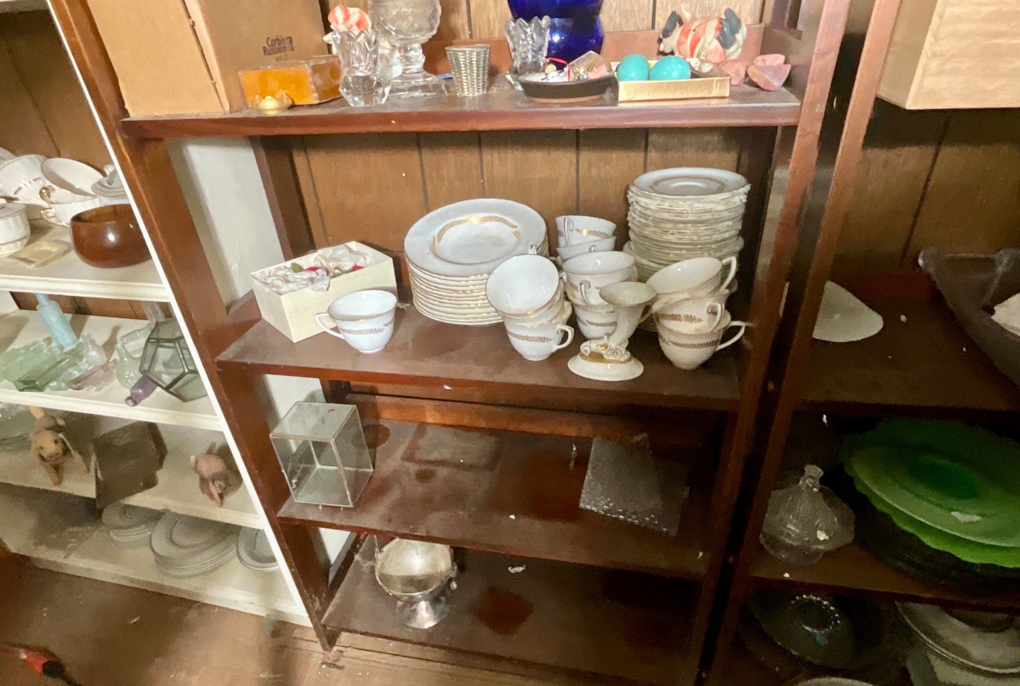 A basement treasure hunt, four book cases full of collectibles, including hand blown glass, china, celluloid and more.