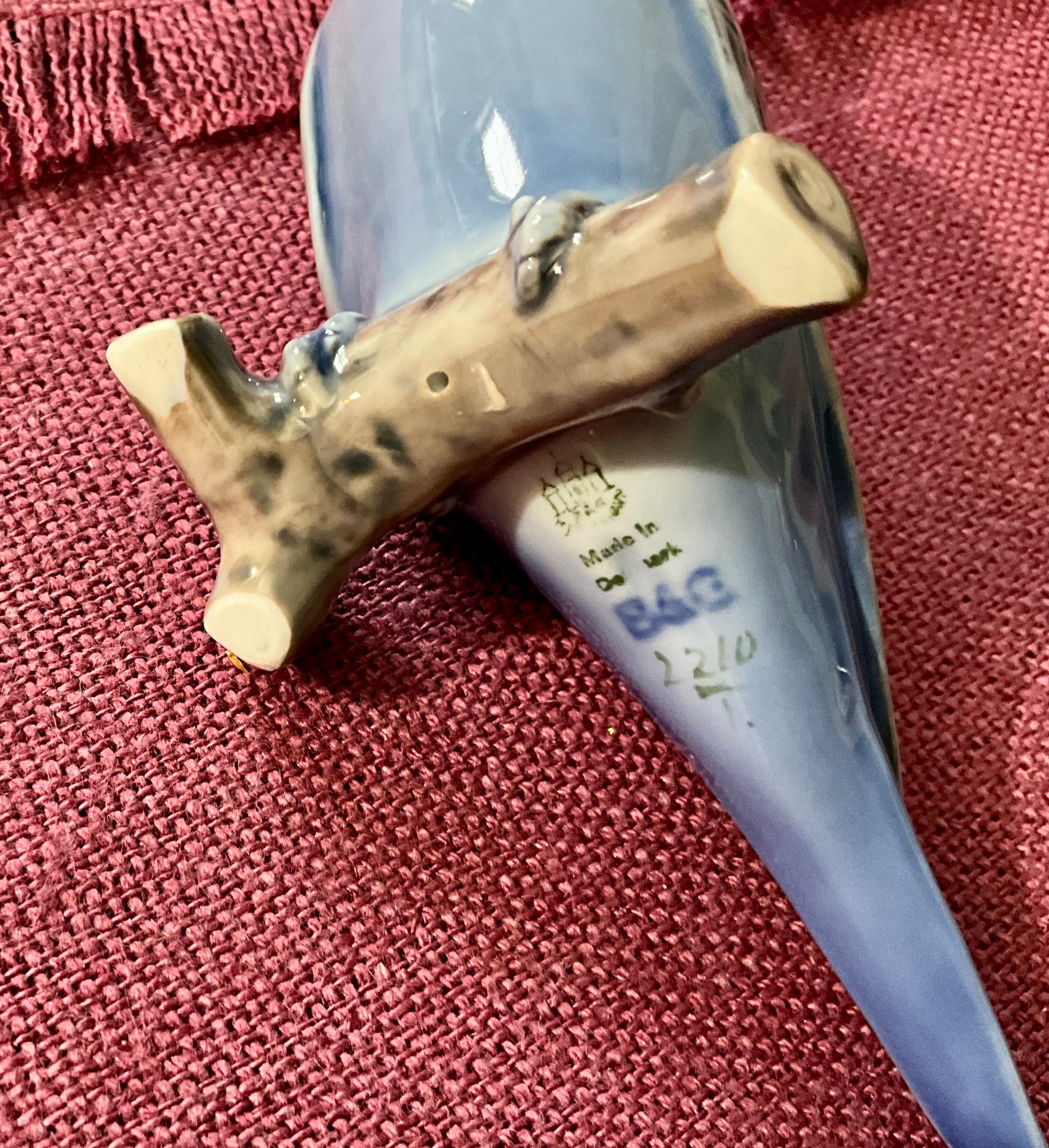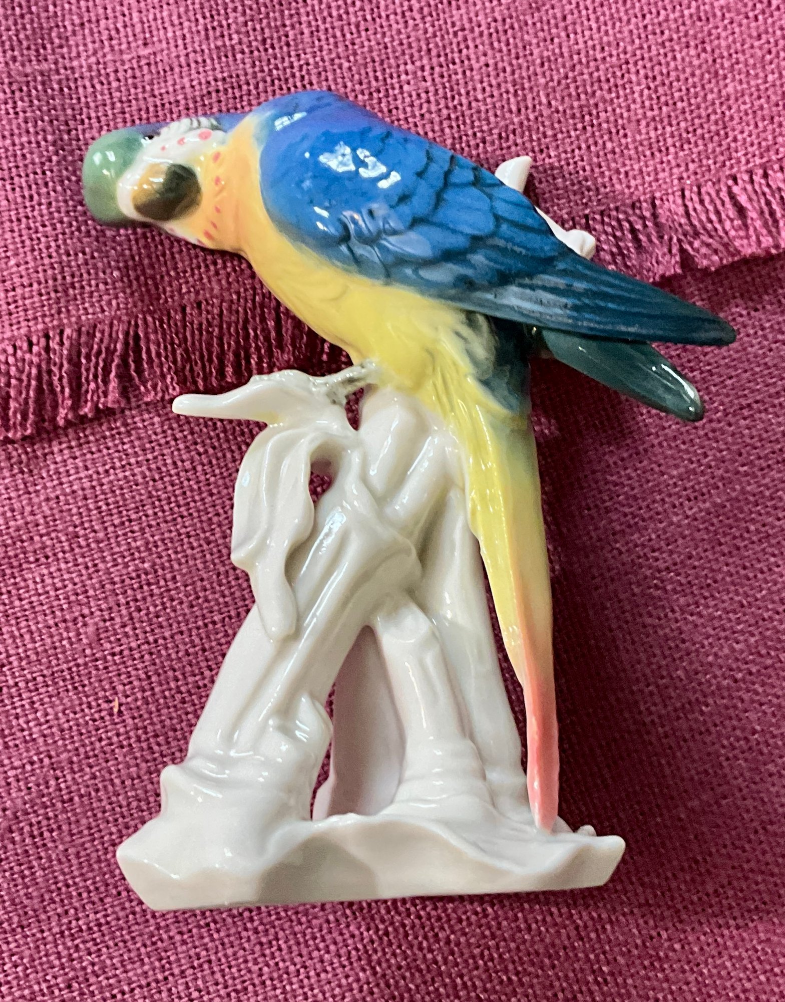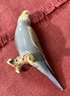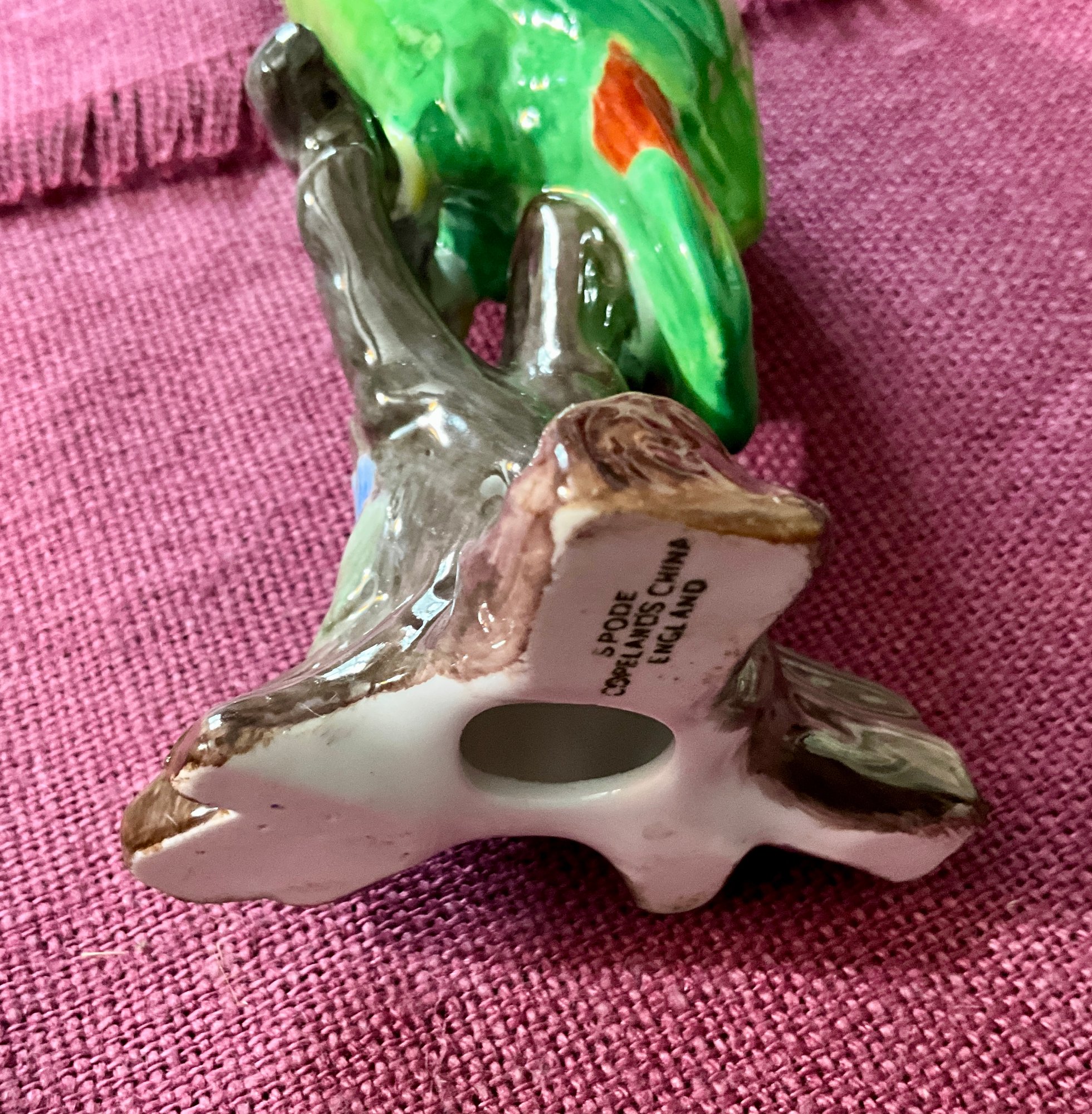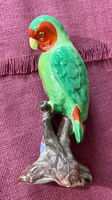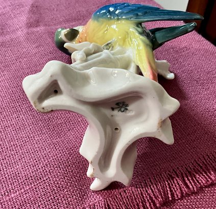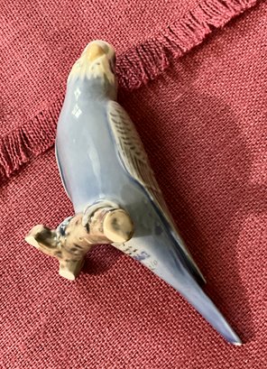 A Copeland Spode parrot figurine, a Denmark bird figurine, a panda with marks on bottom, two other birds. 5 total.