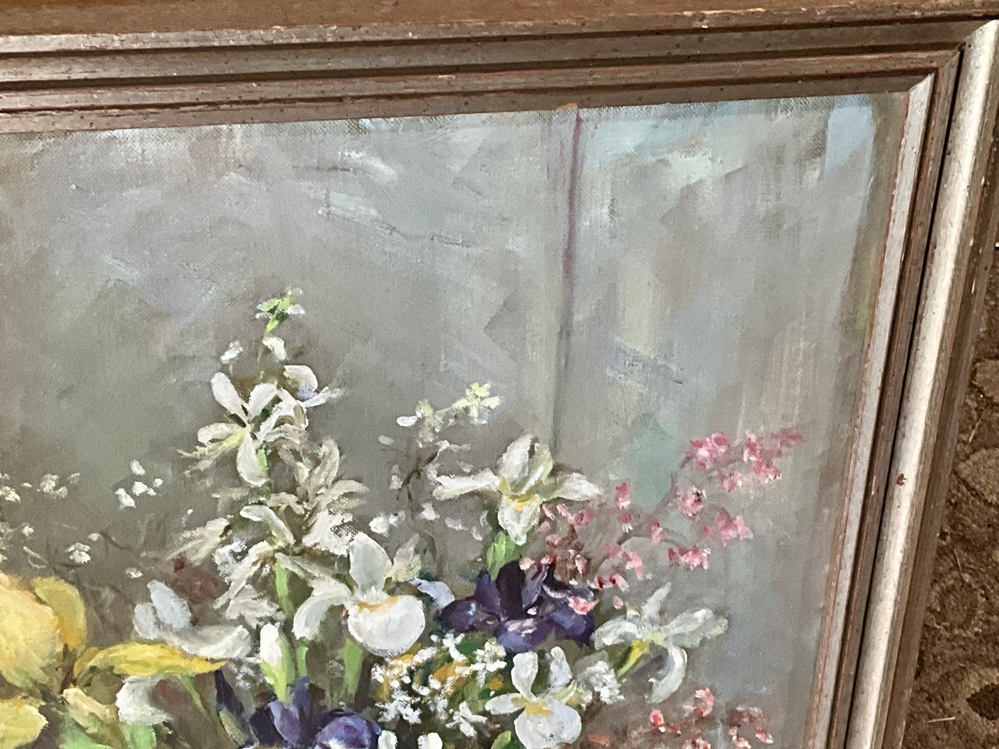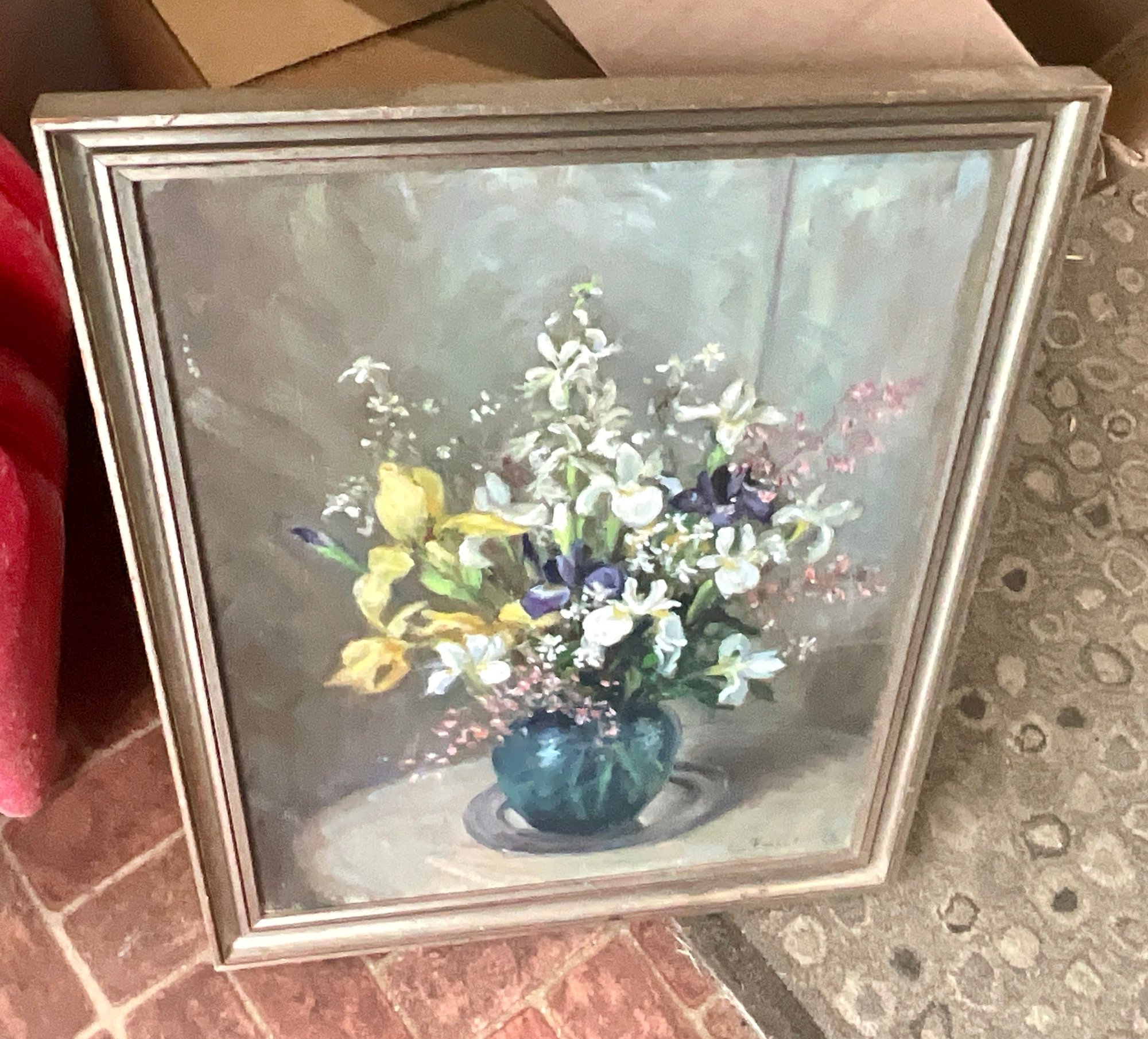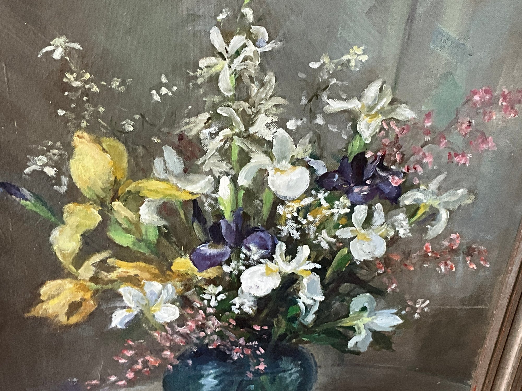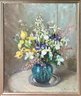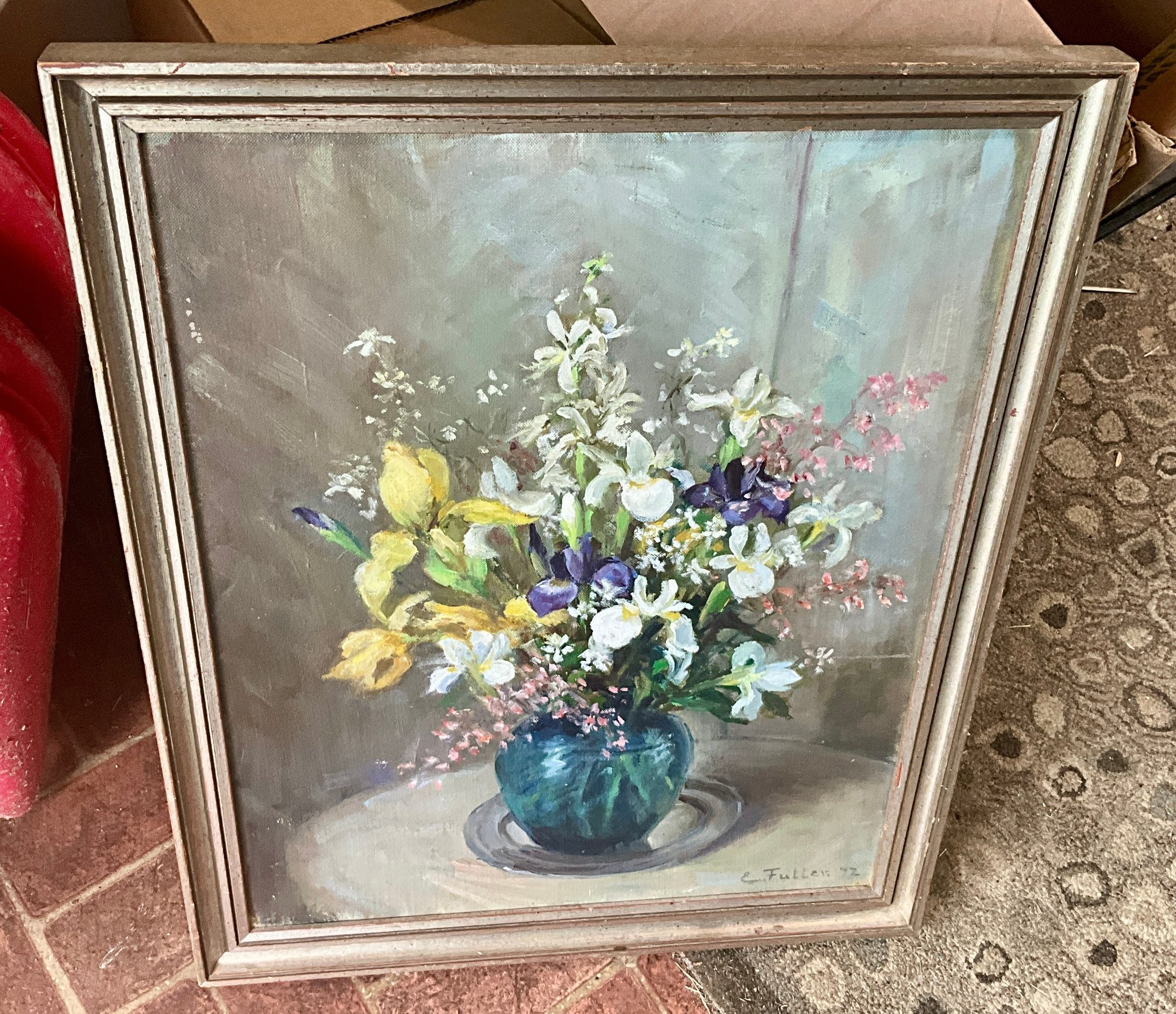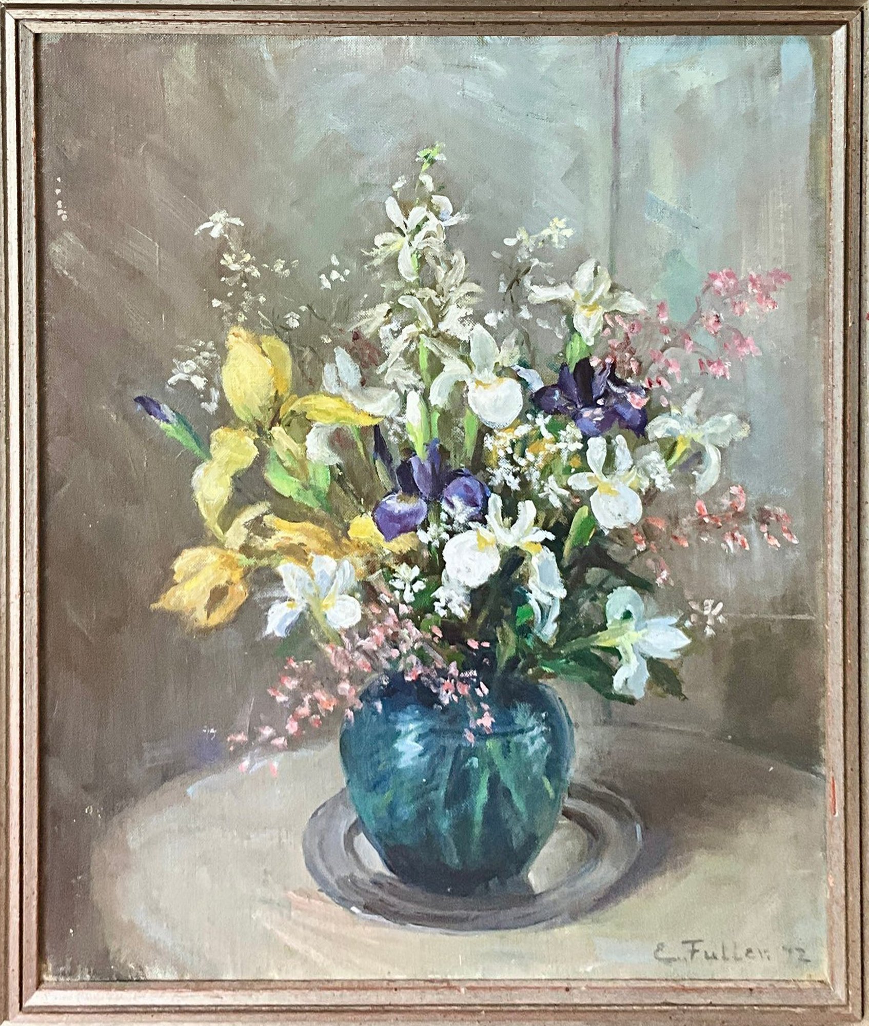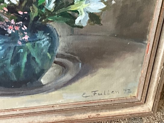 An oil on board still life, bouquet of flowers in a vase, signed lower right, E Fuller ‘72.