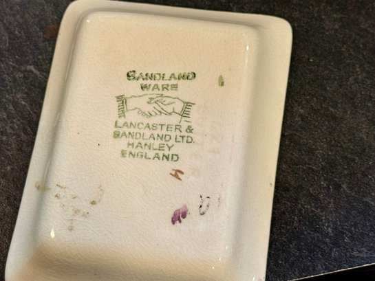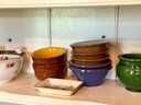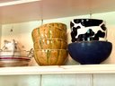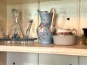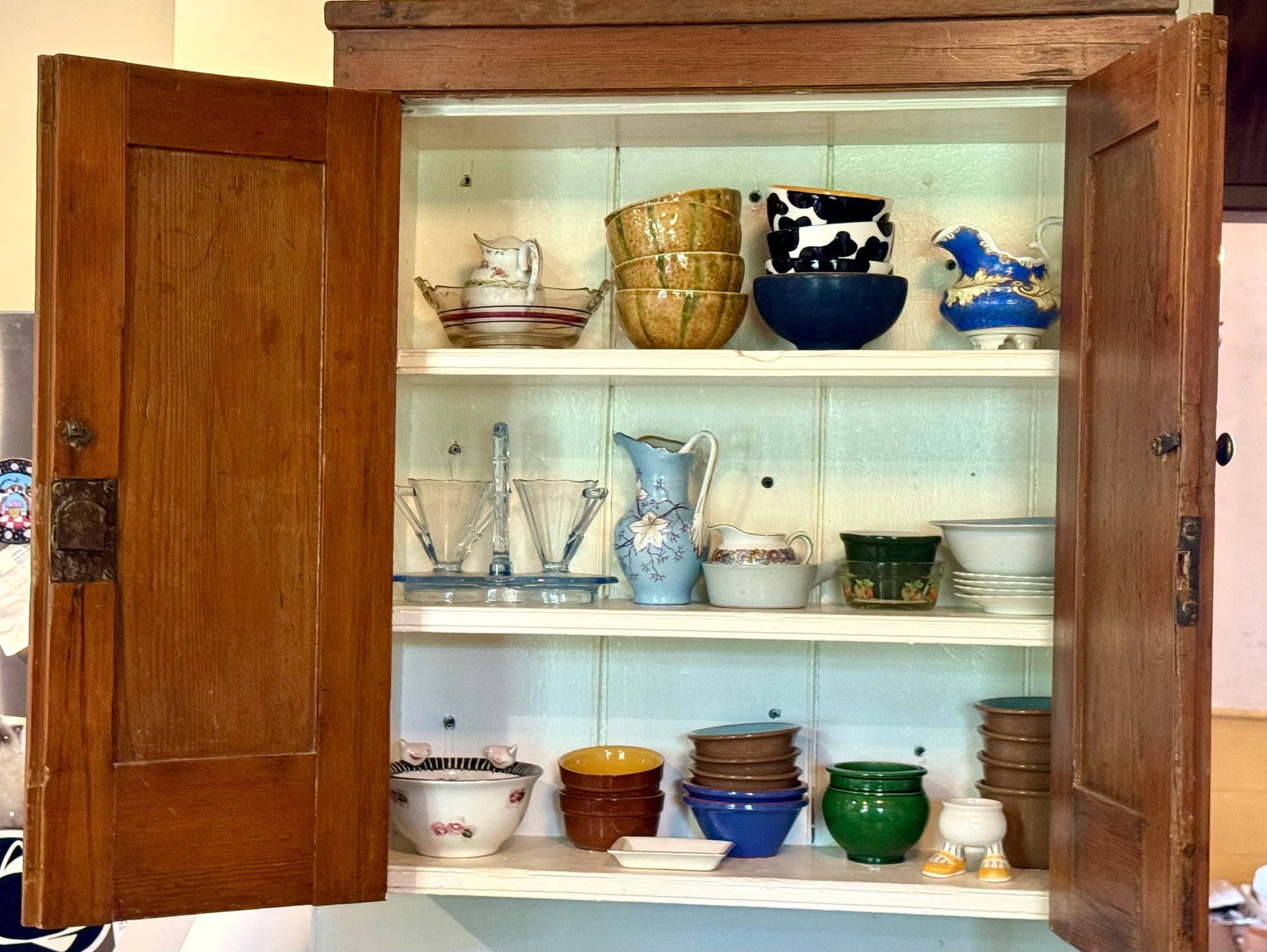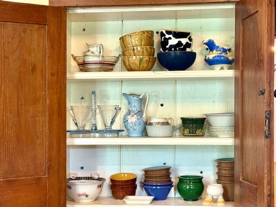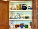 The contents of a hanging cabinet, includes: English china, pottery, unmarked china and glass.