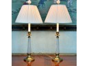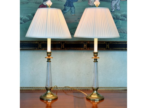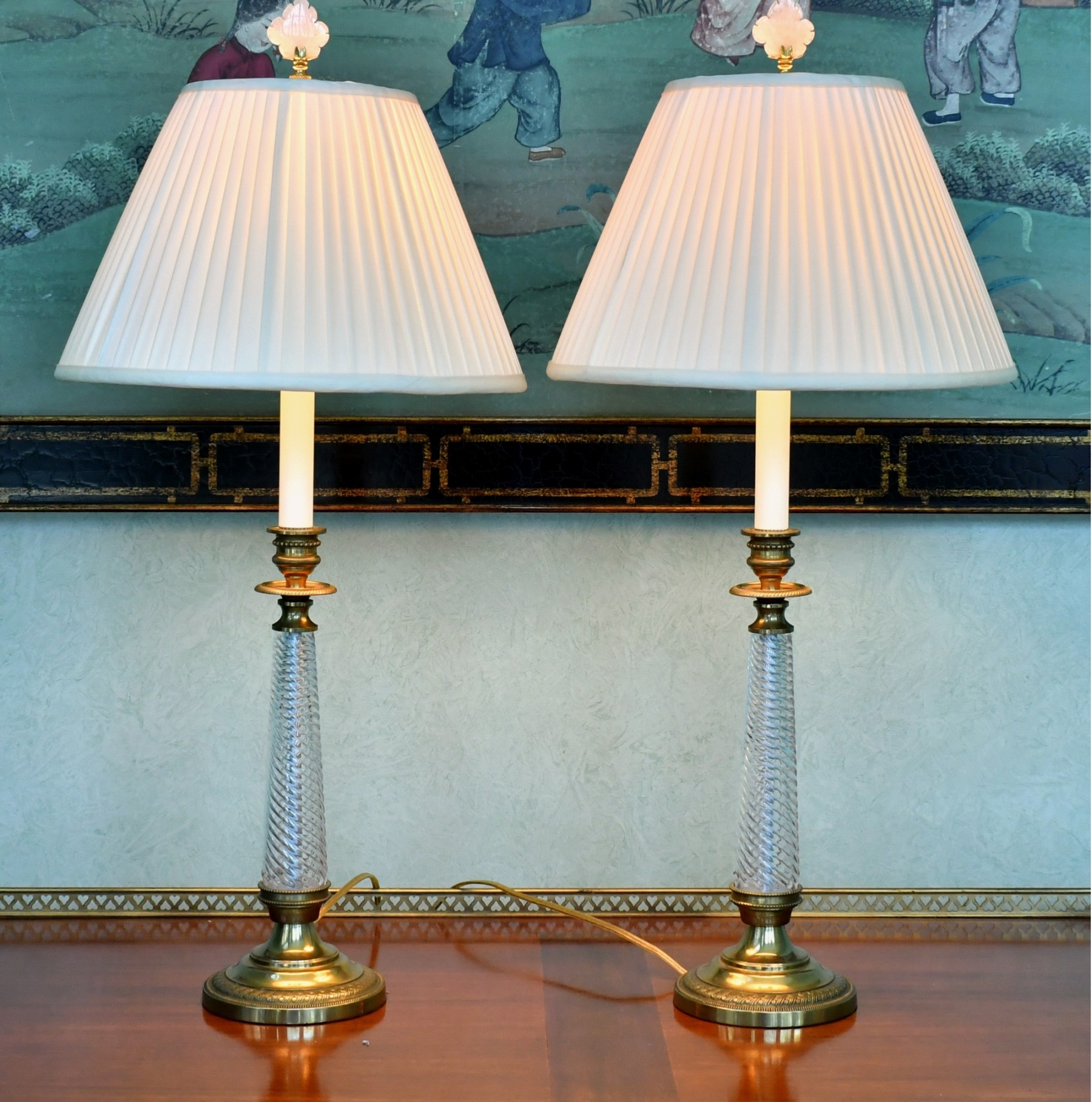 A pair of French style crystal and brass table lamps with carved rose quartz finials, baccarat style crystal stem on embossed circular brass base, with ivory folded fabric shades, by Portable Lamp Co.