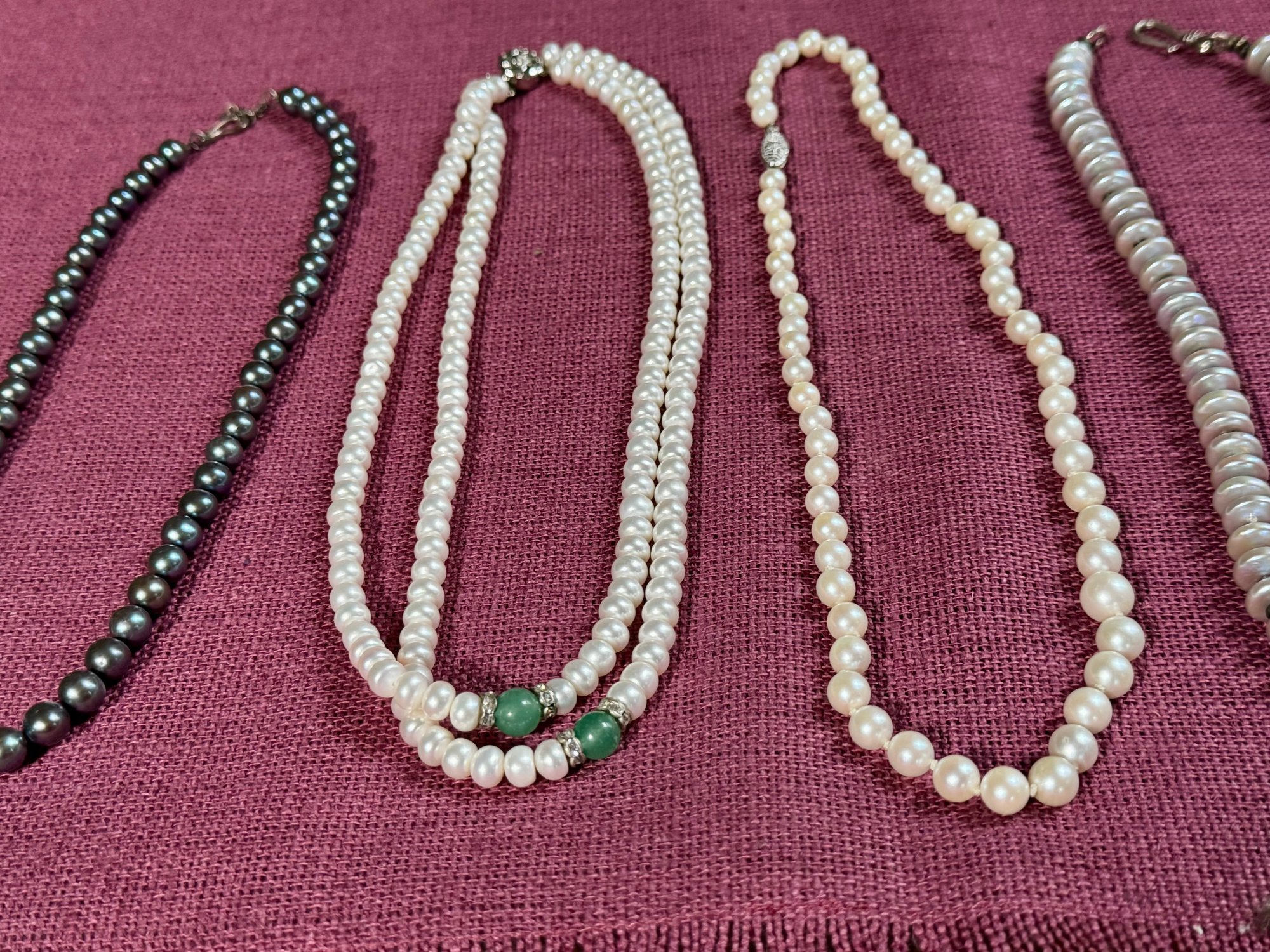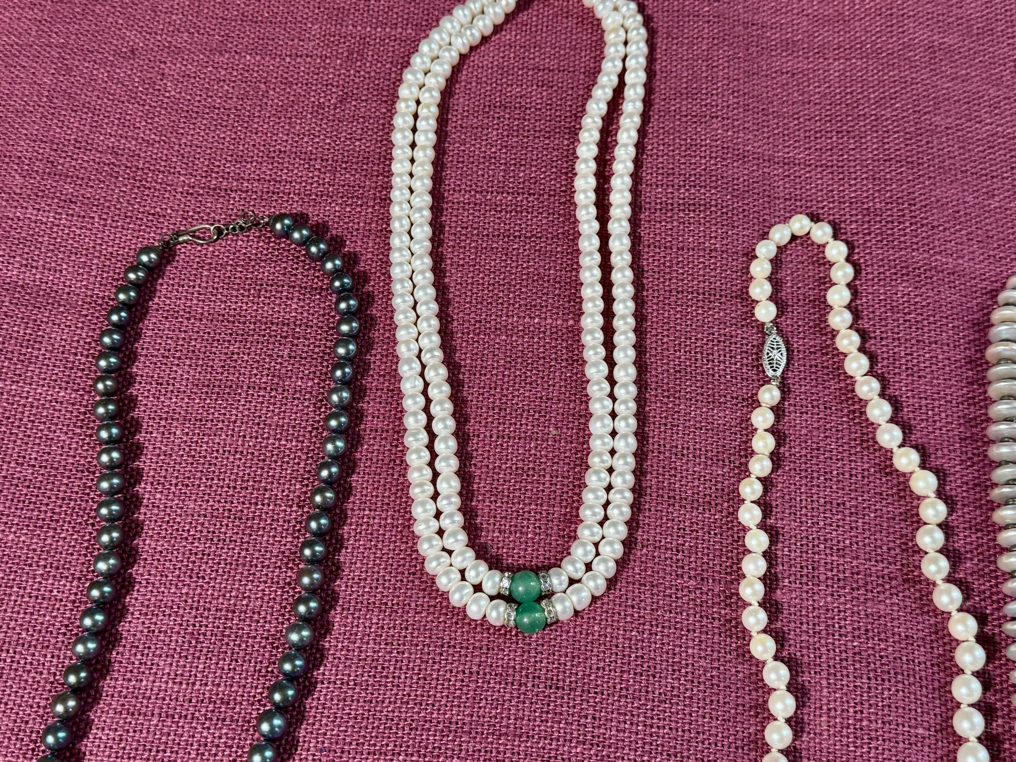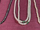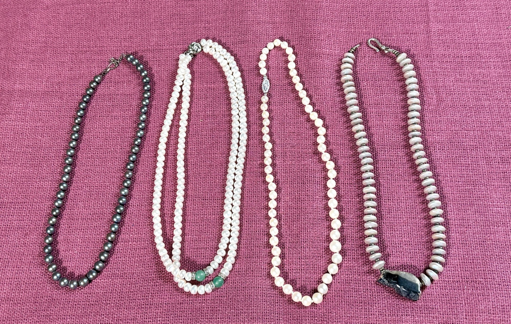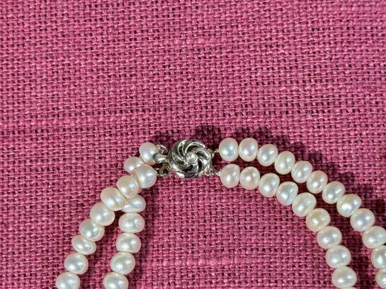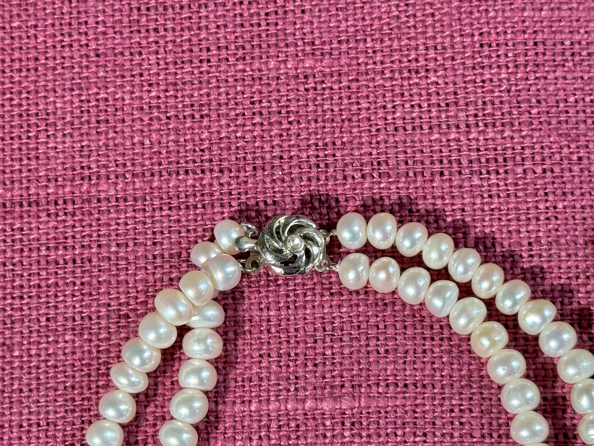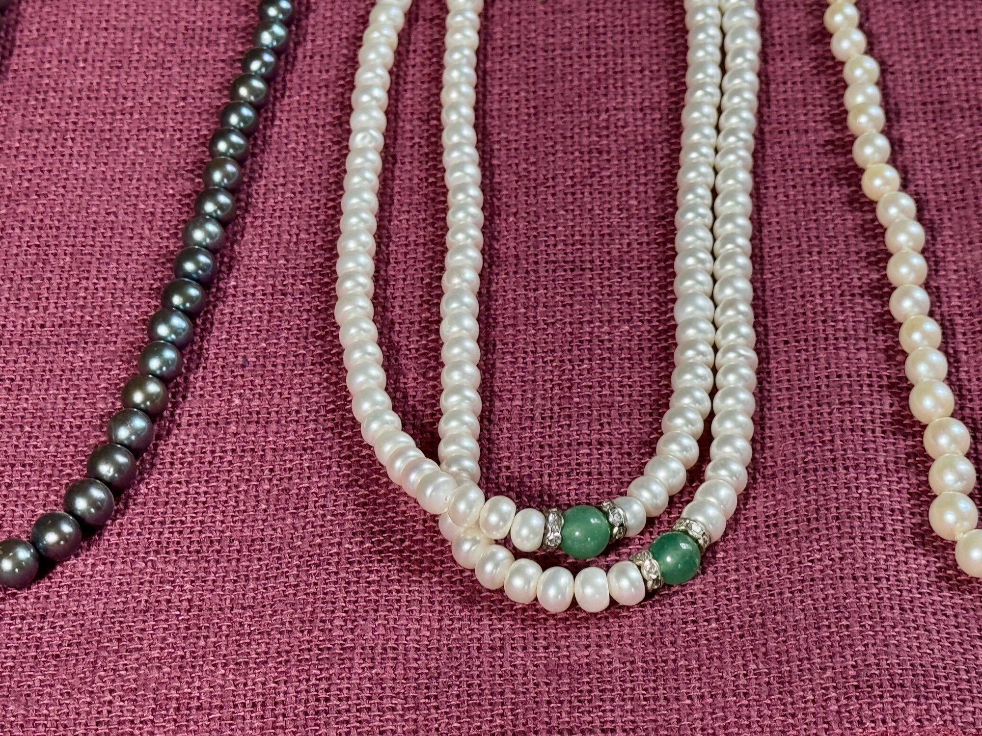 a double strand of freshwater pearls with button quartz green stones and a silver clasp,