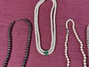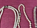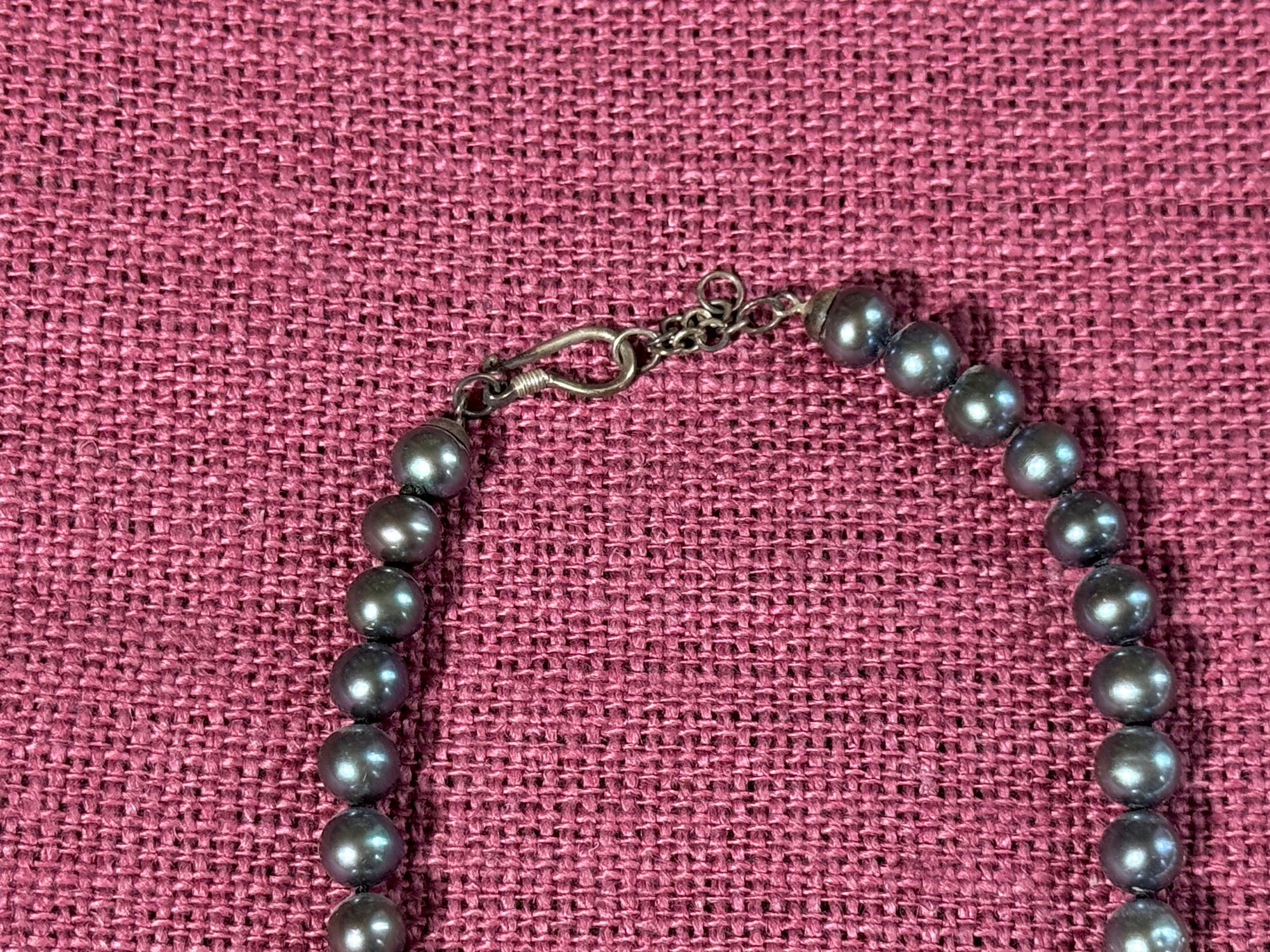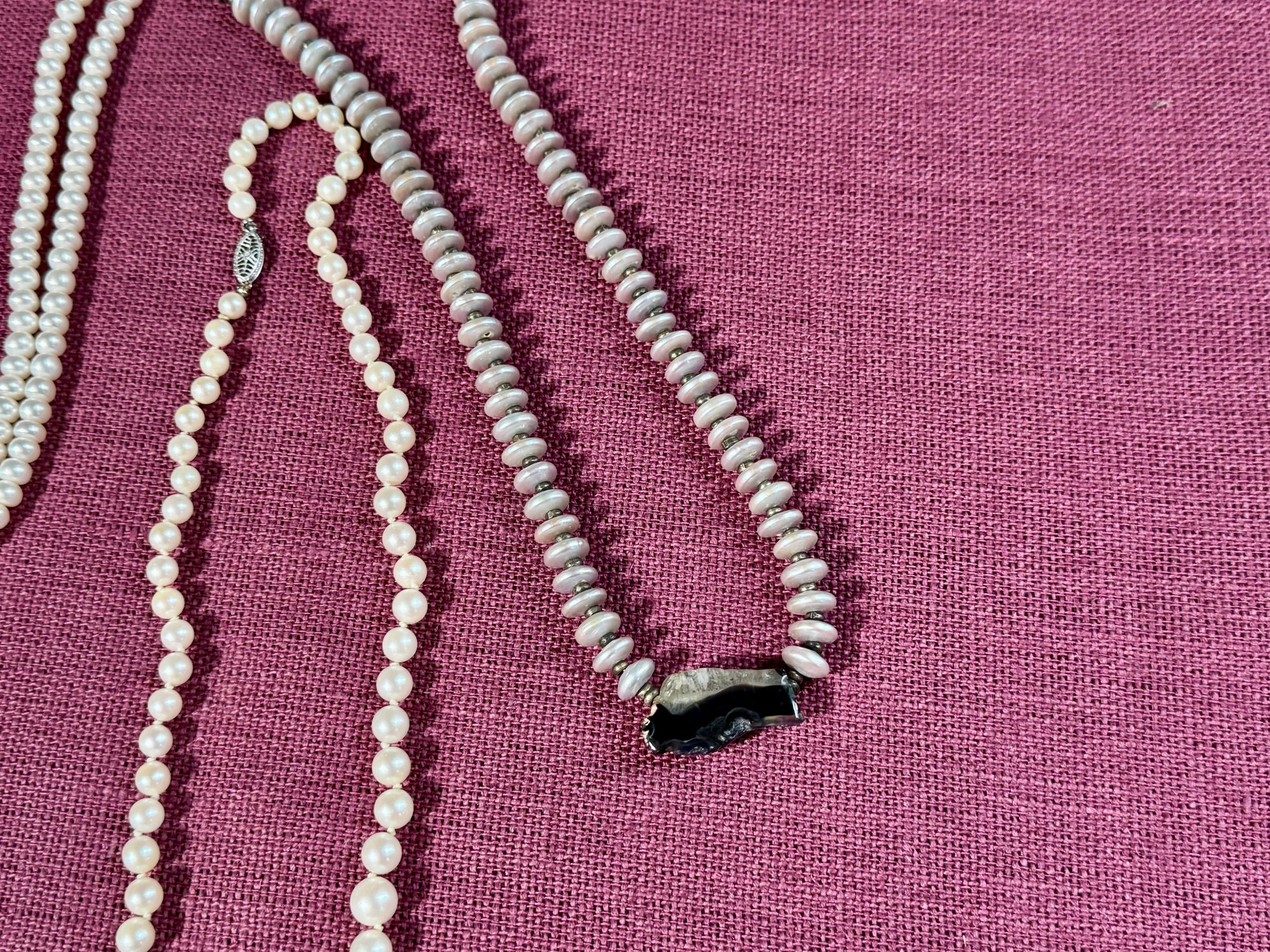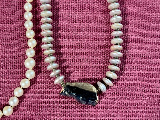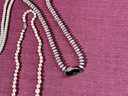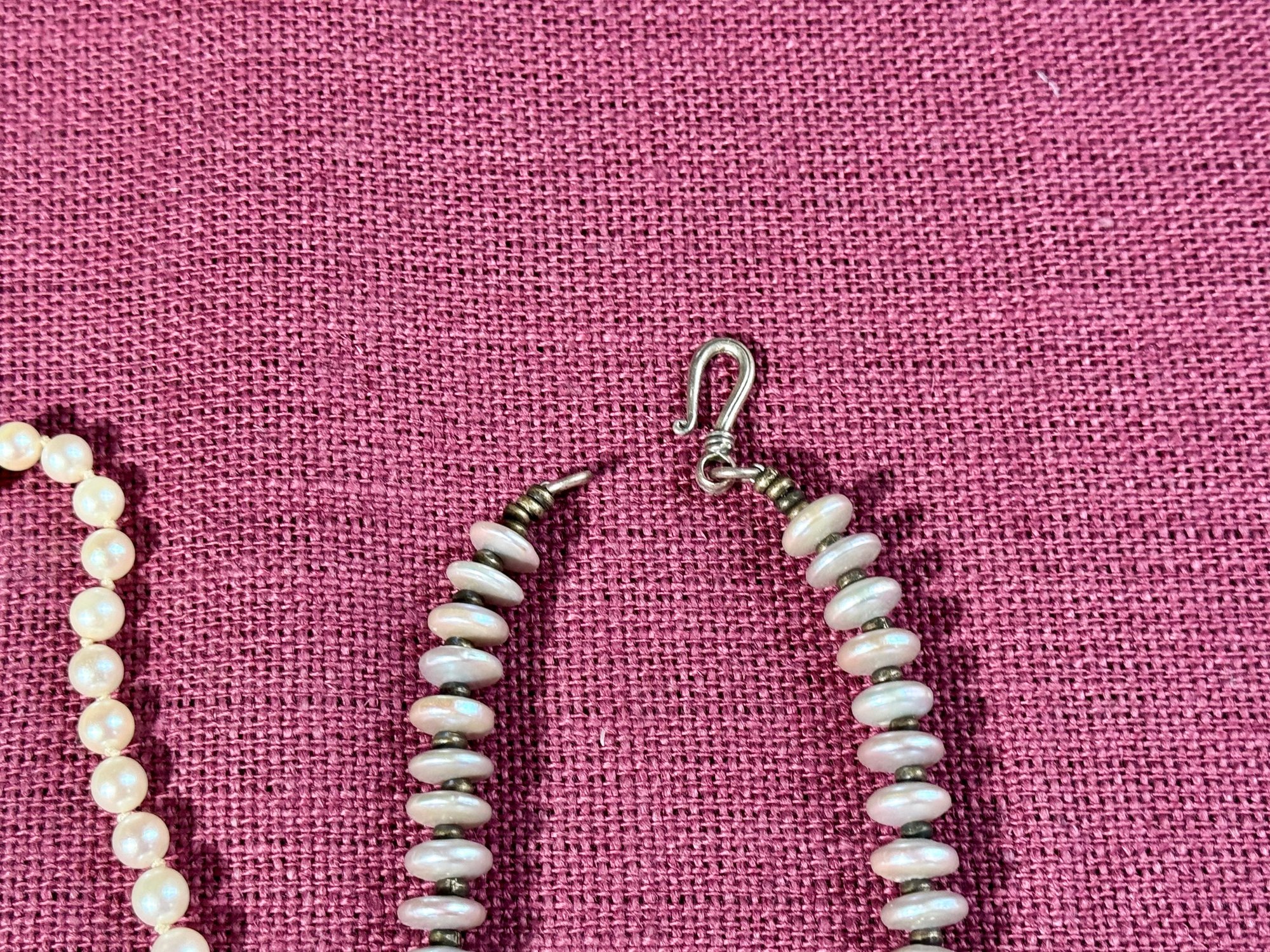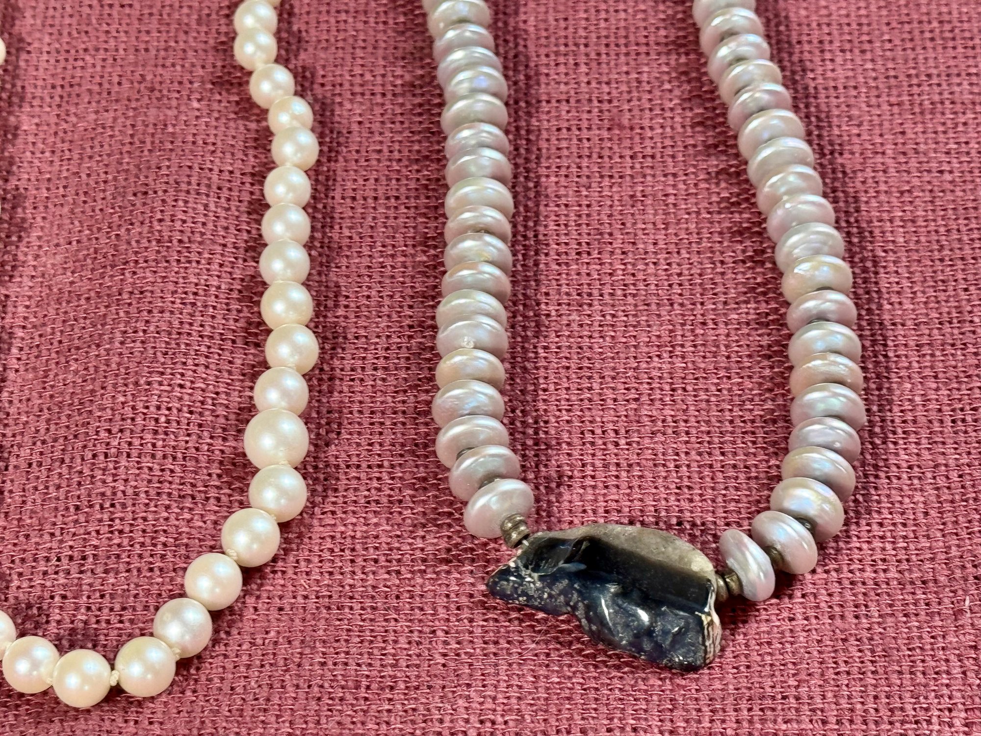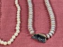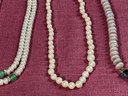 a double strand of freshwater pearls with button quartz green stones and a silver clasp,