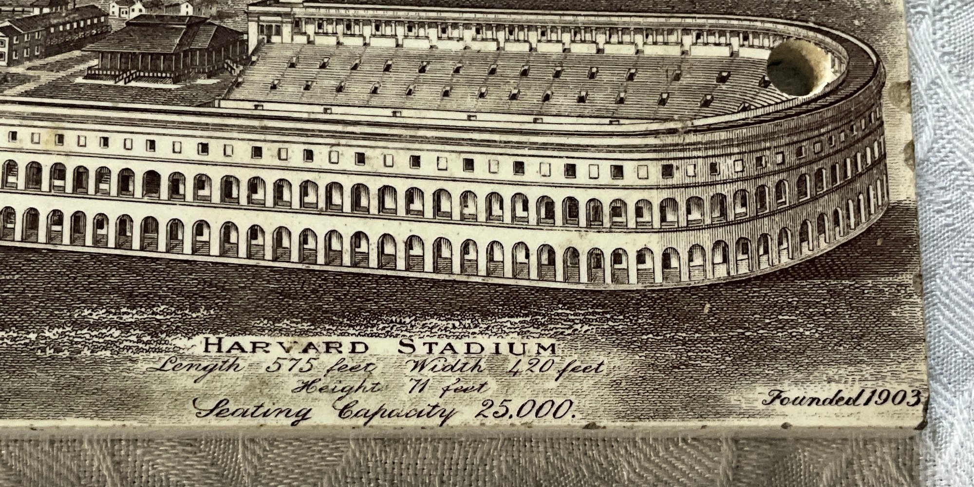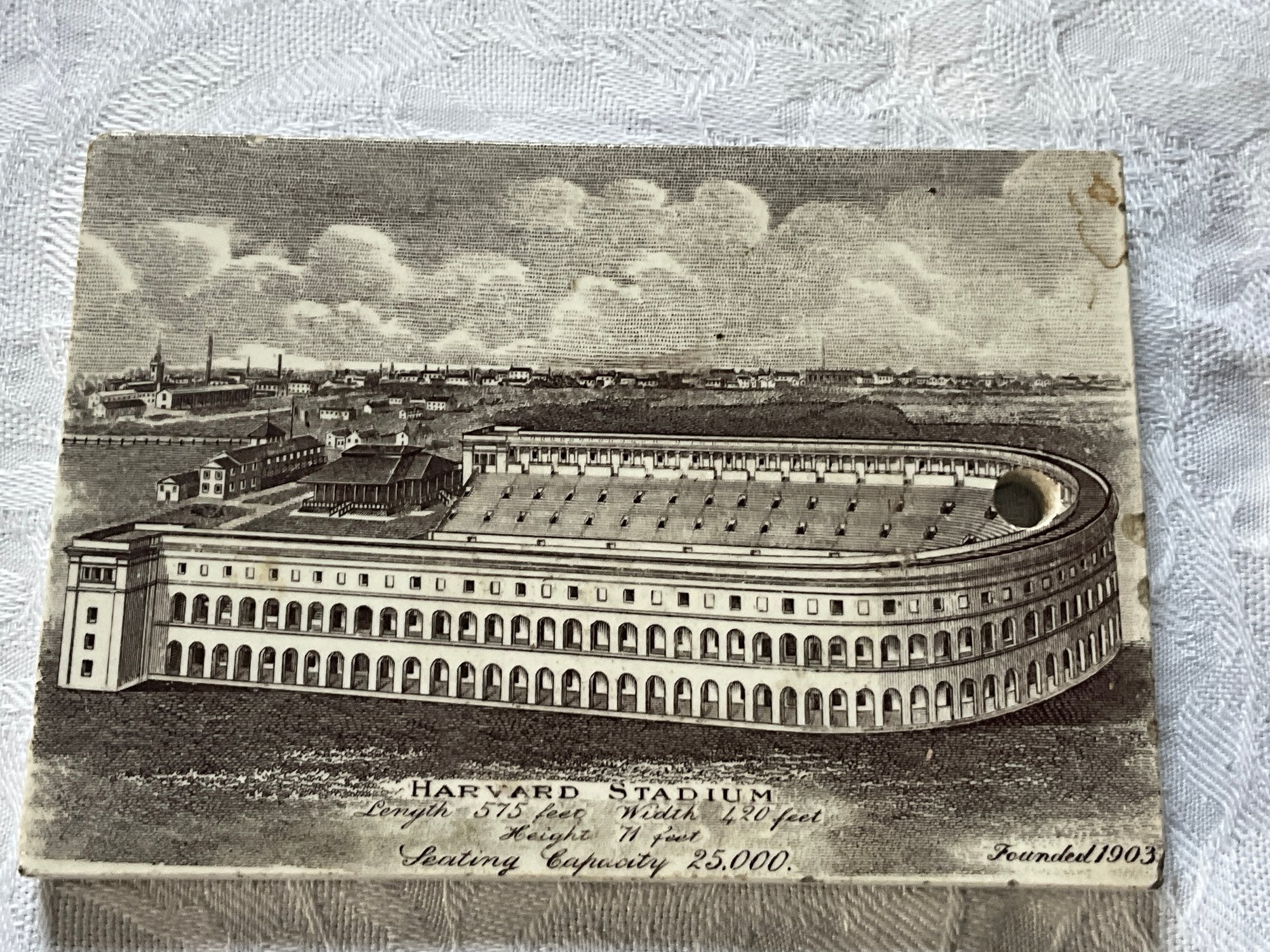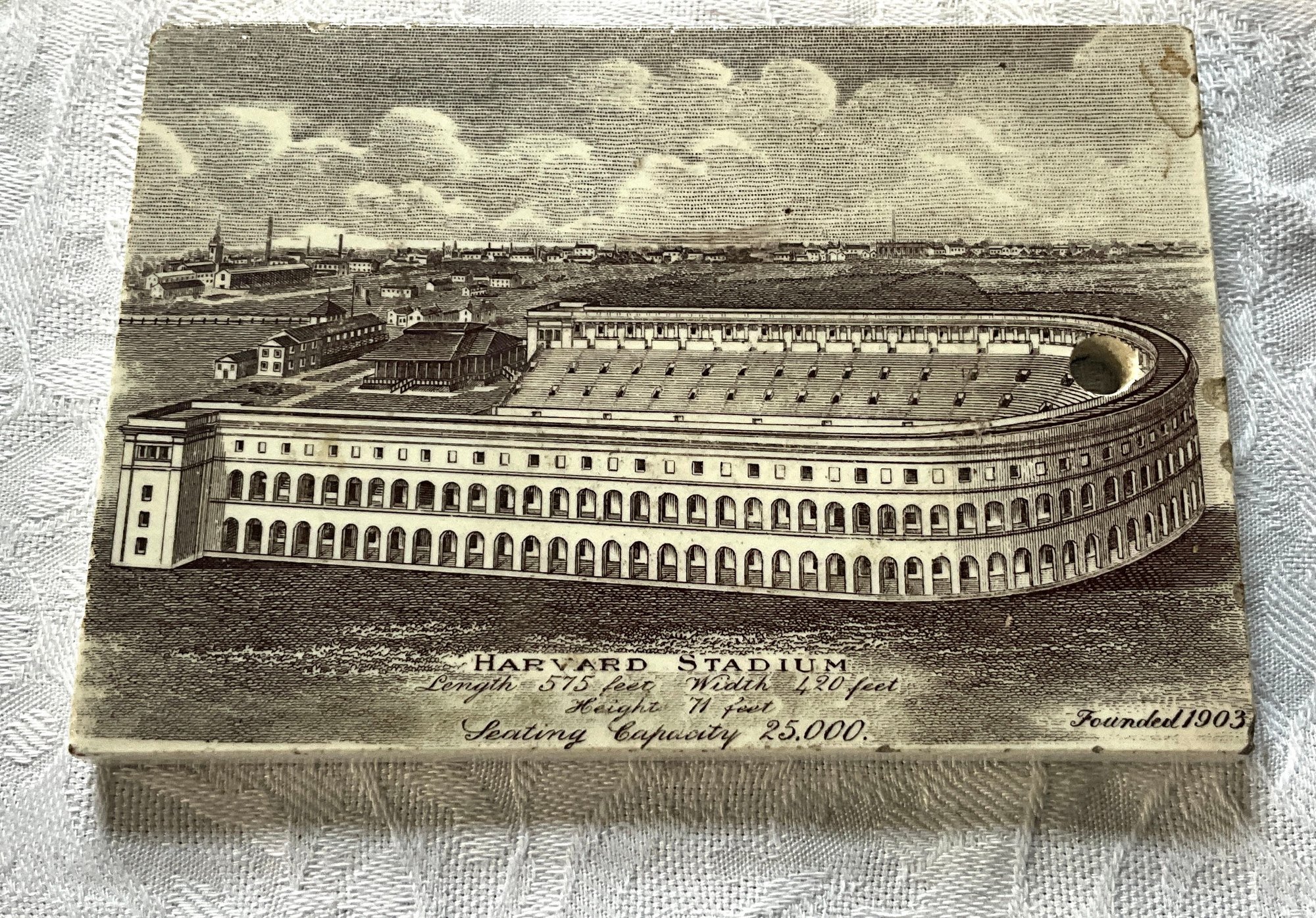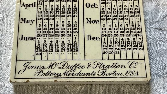 An antique pottery tile, Harvard Stadium 1907 calendar, Jones McDuffee Stratton Co. Pottery Merchants Boston MA.