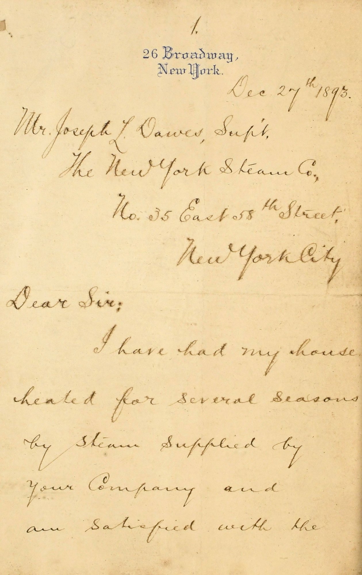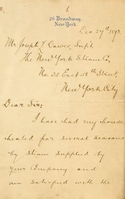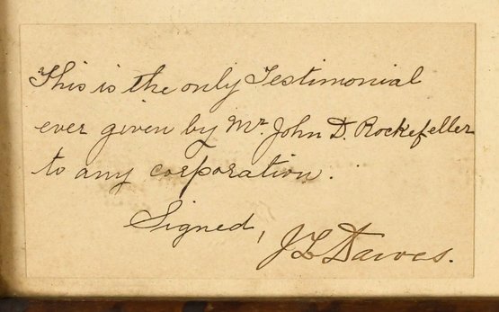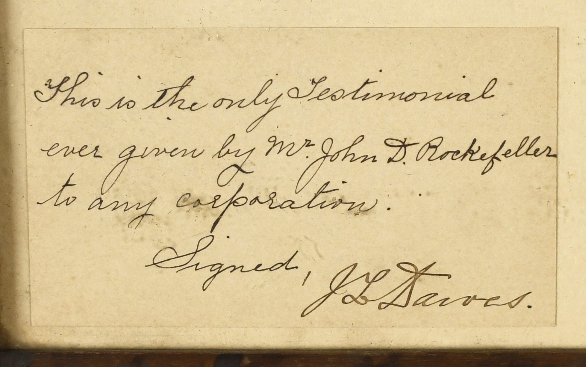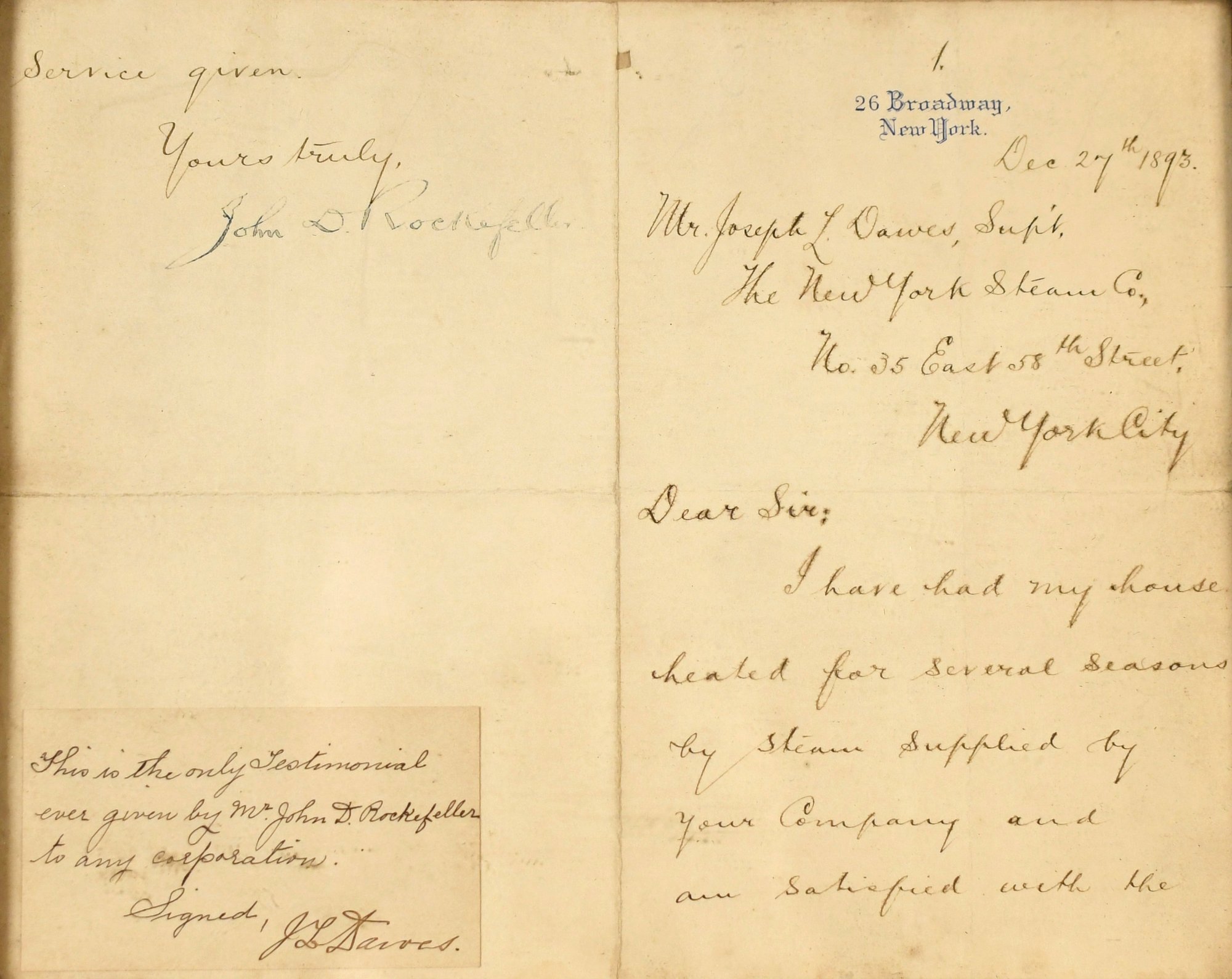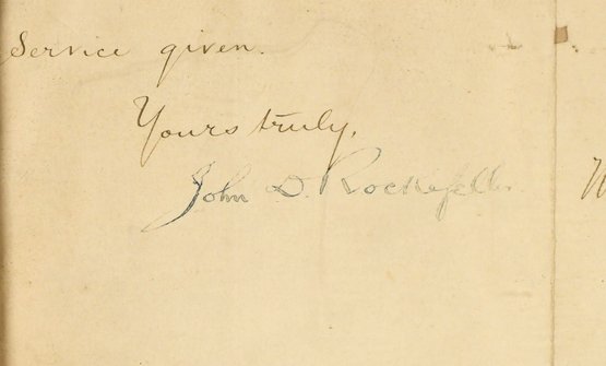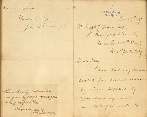 A framed hand written note from John D. Rockefeller to the NY Steam Co., signed John D. Rockefeller and dated Dec. 27th 1893.
