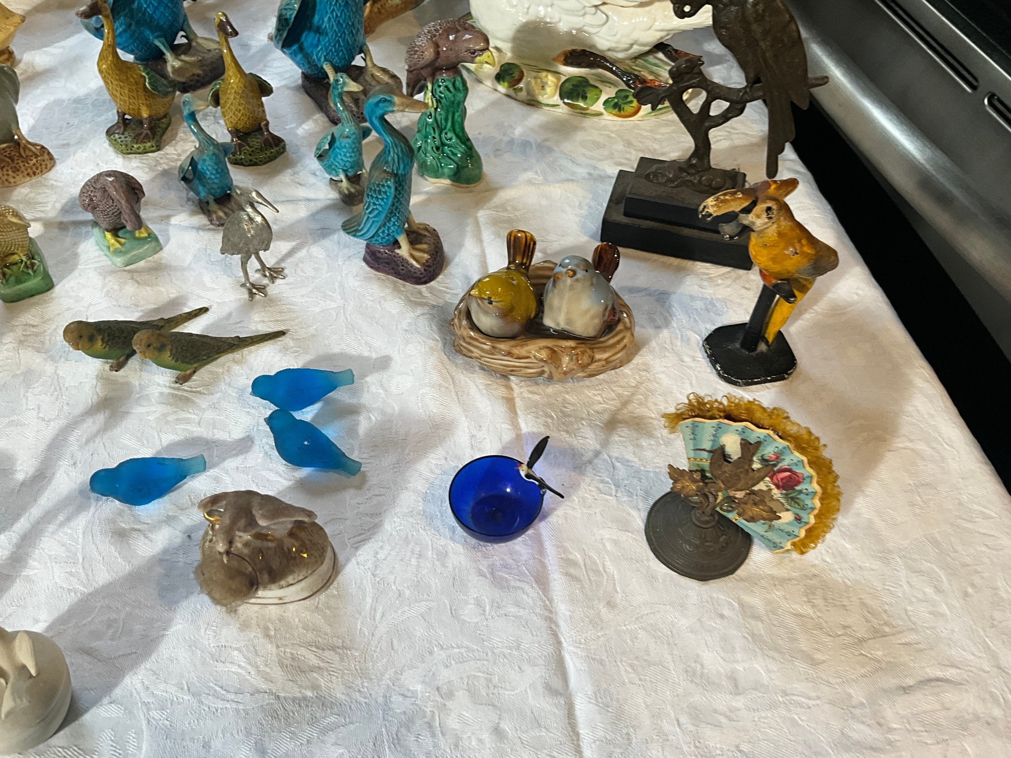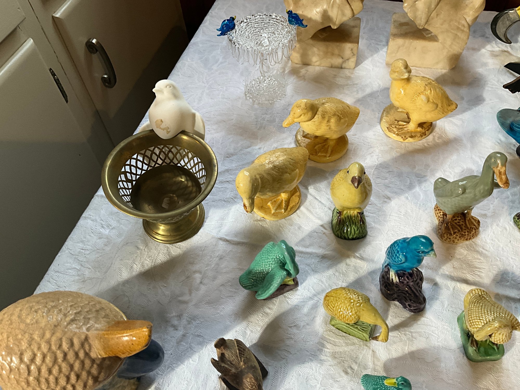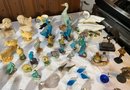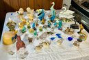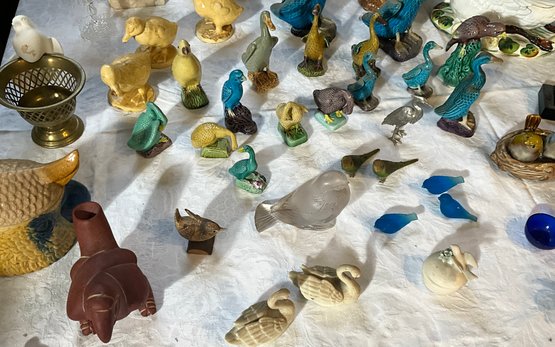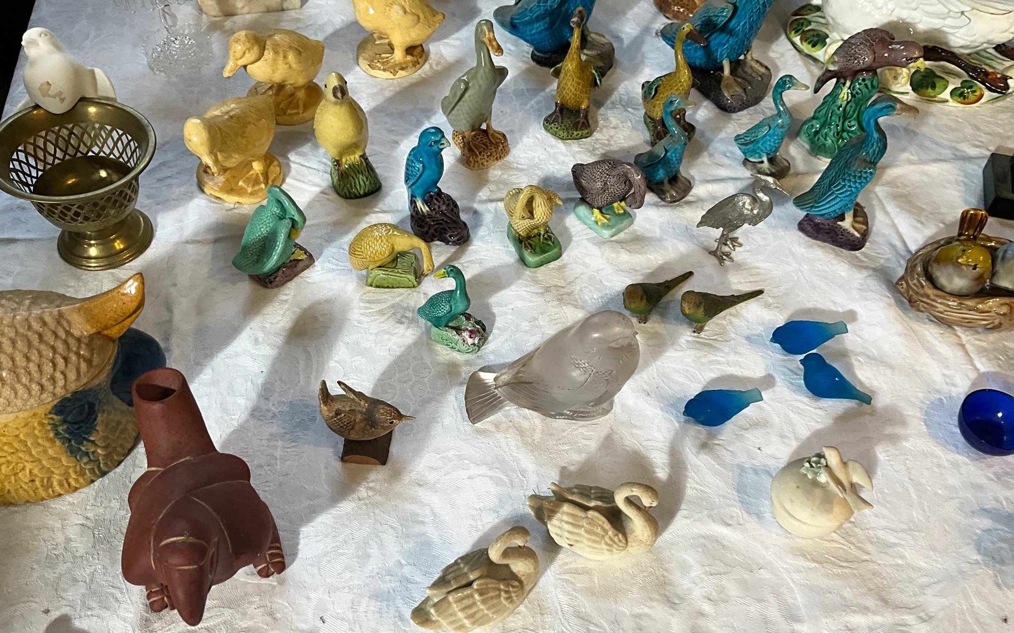 A collection of glass, china and metal bird figurines including Lalique and Lennox. 30 pcs.