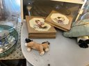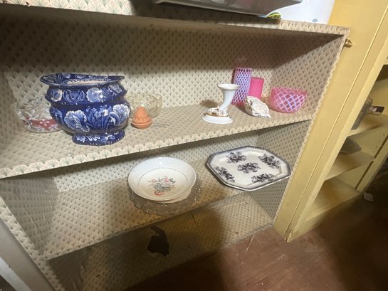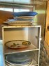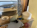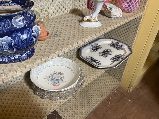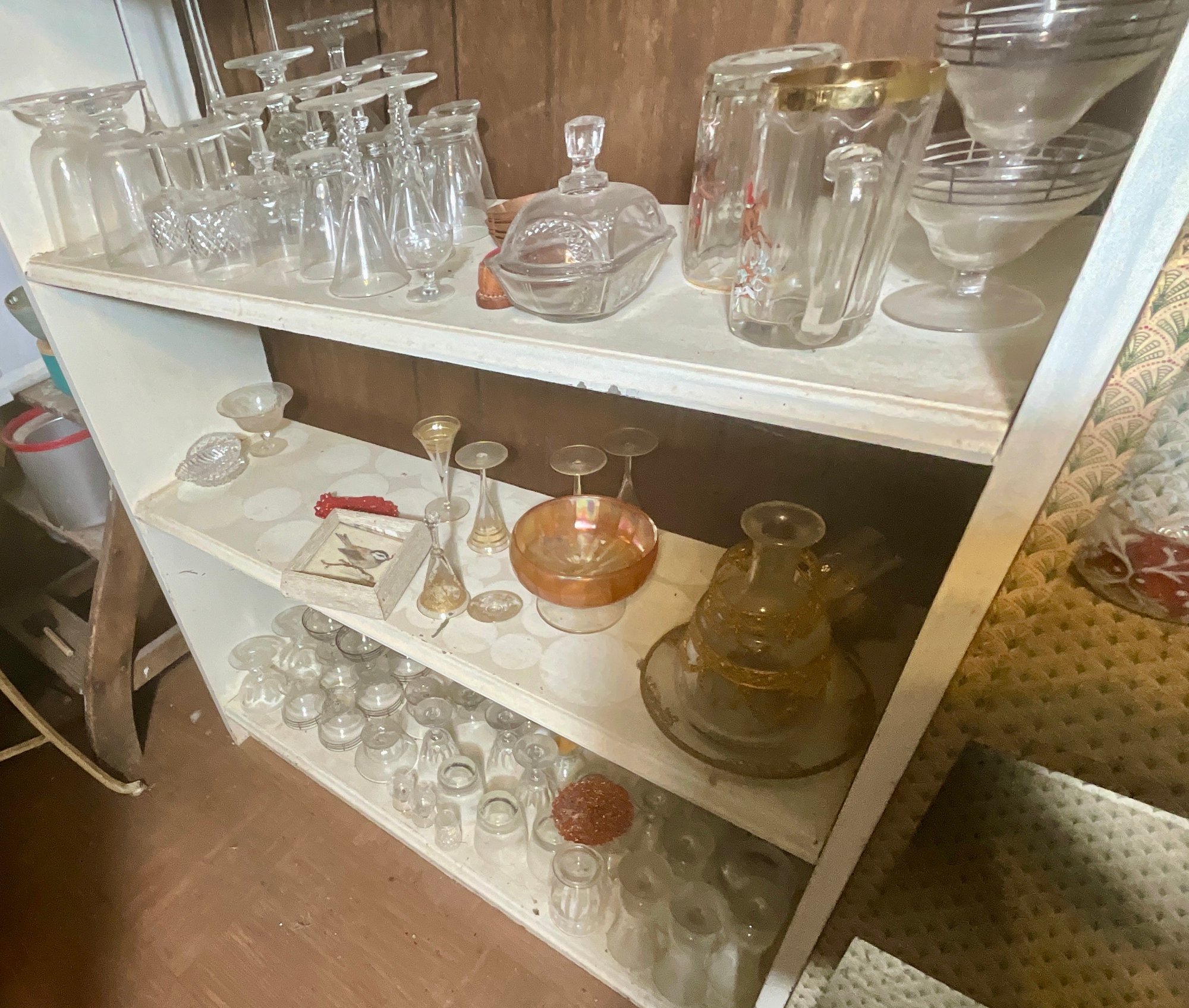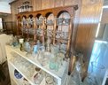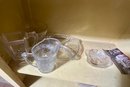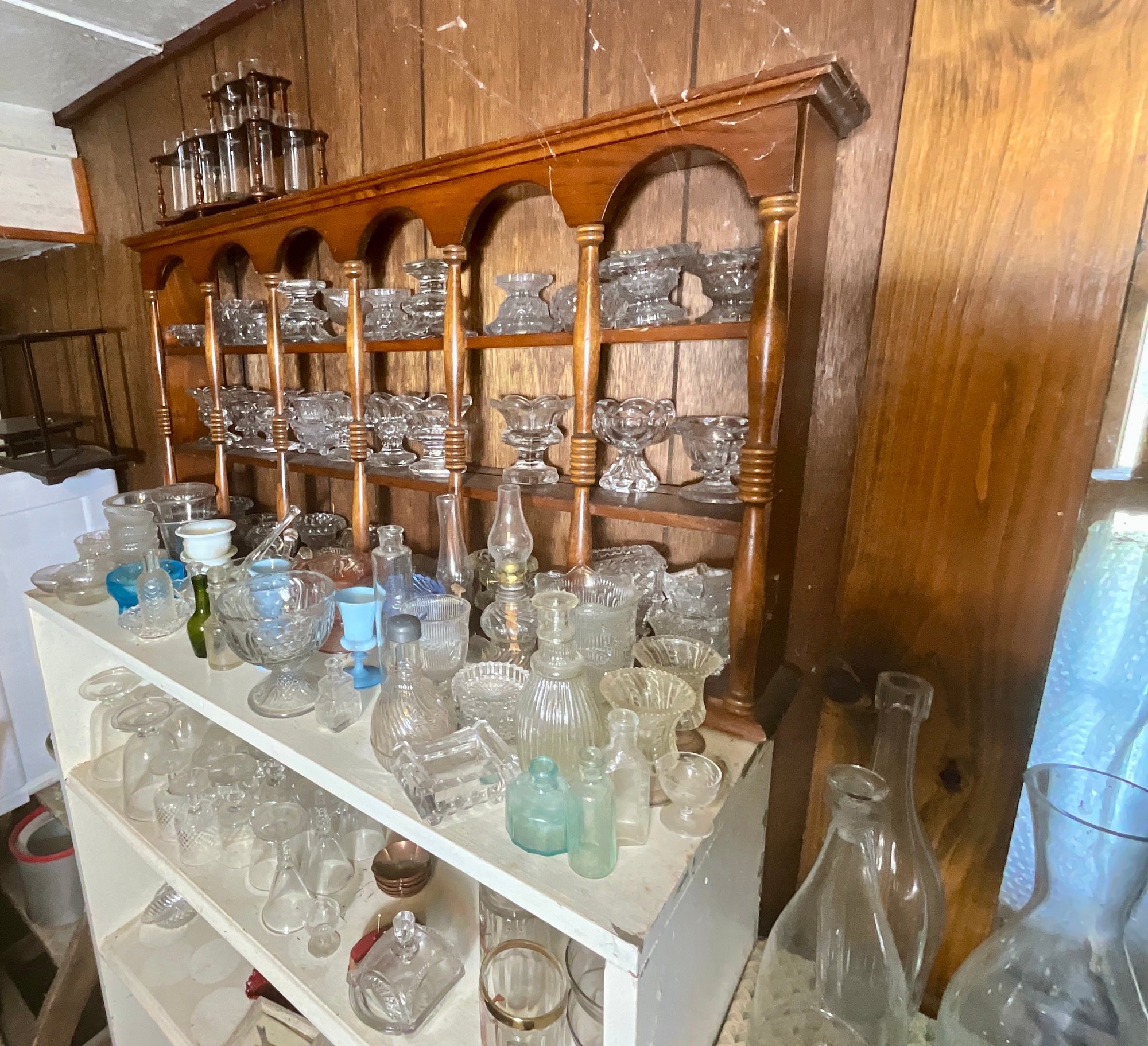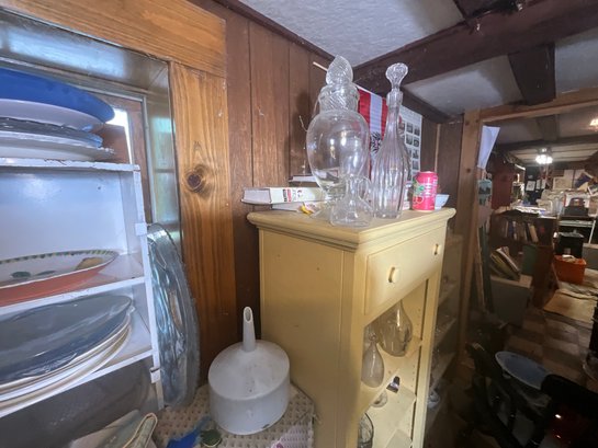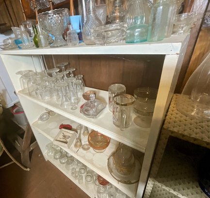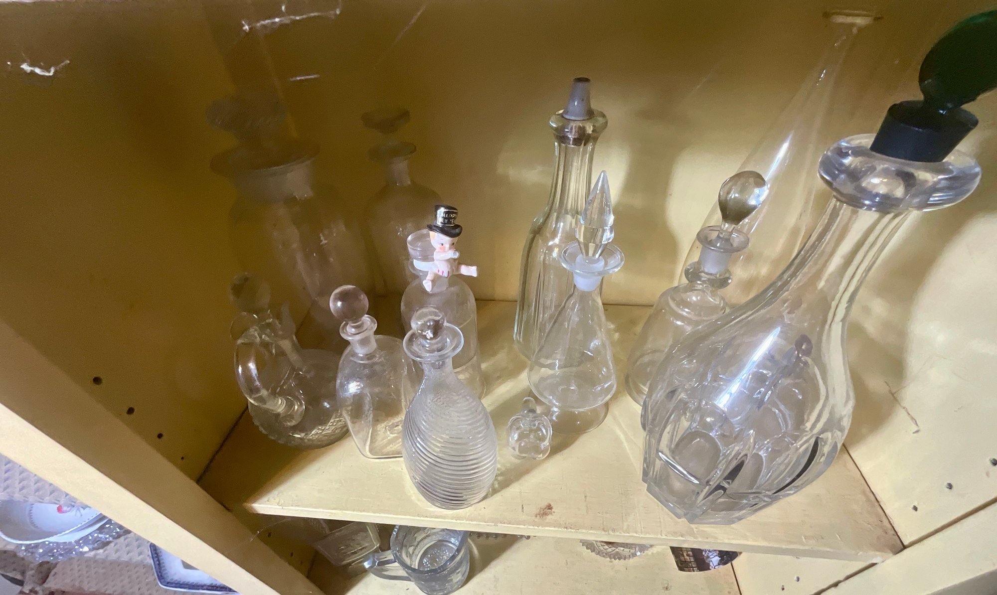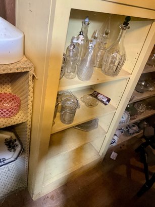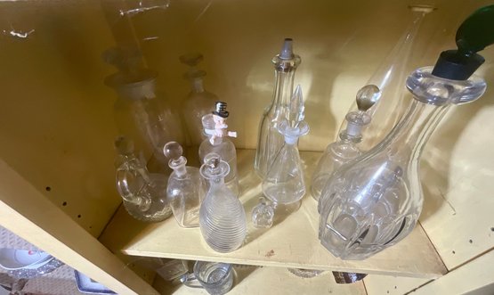 A large collection of glass decanters, platters, small clear glass dishes, cordial glasses, wines and more.