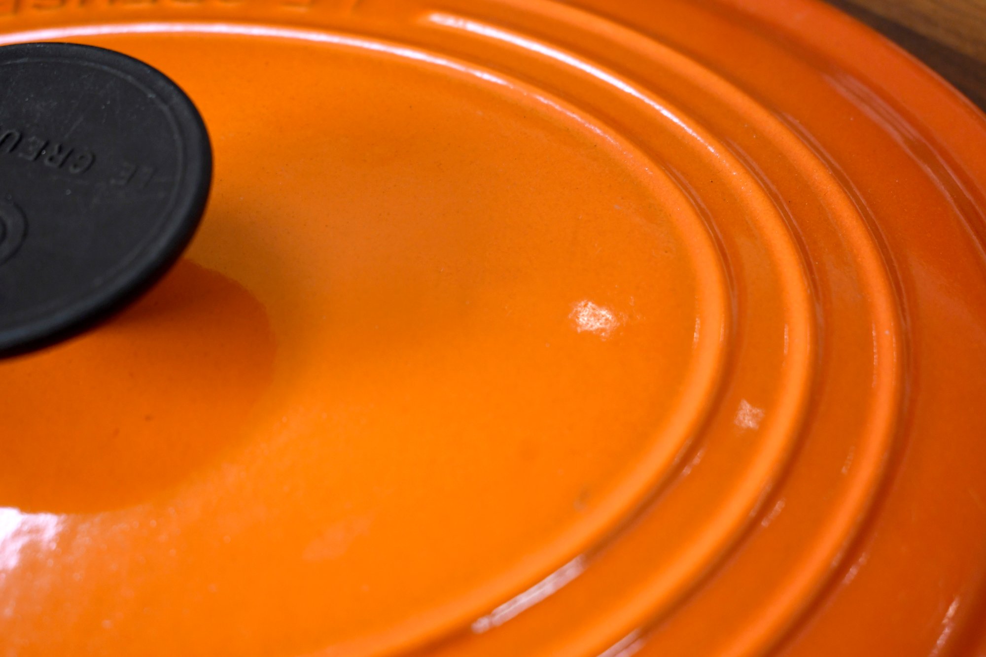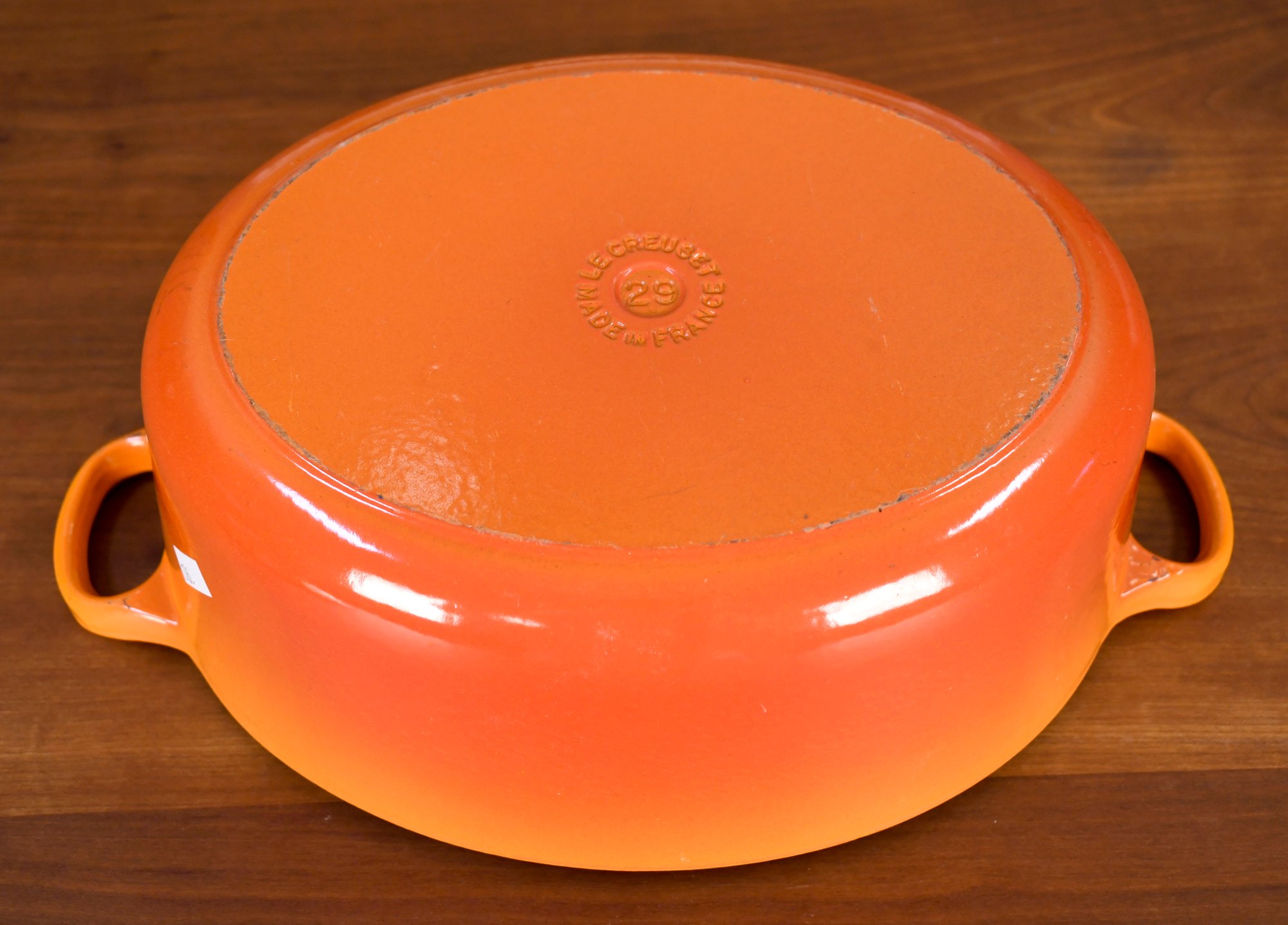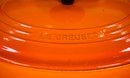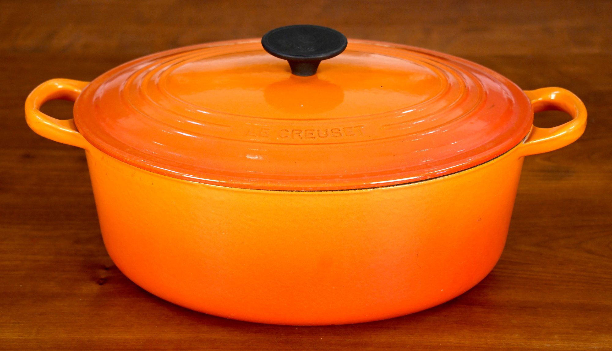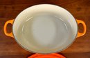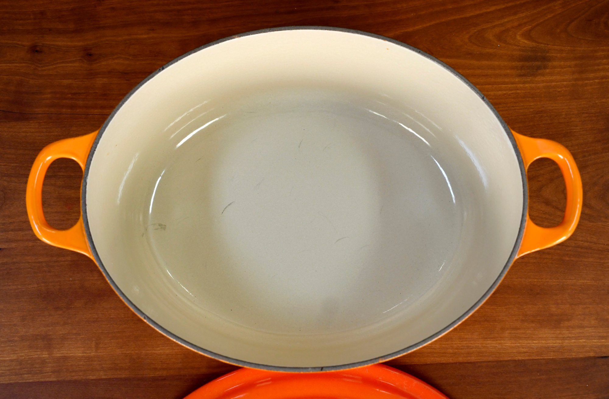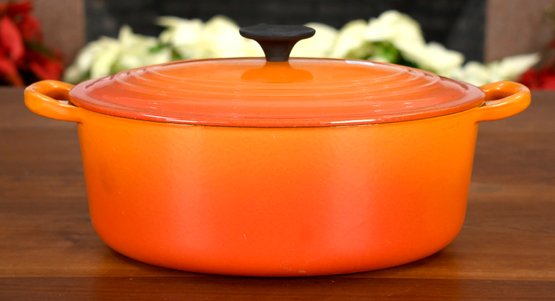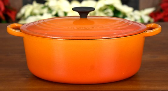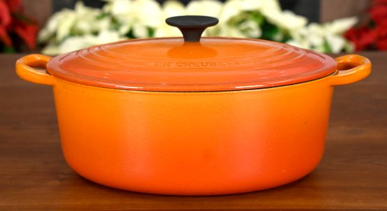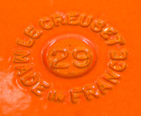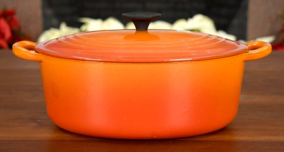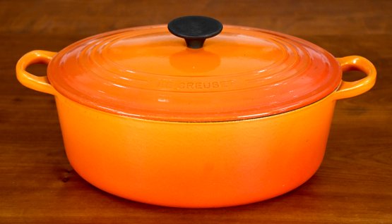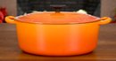Le Creuset enameled cast iron oval dutch oven, color Flame, size #29 = 5 quarts.