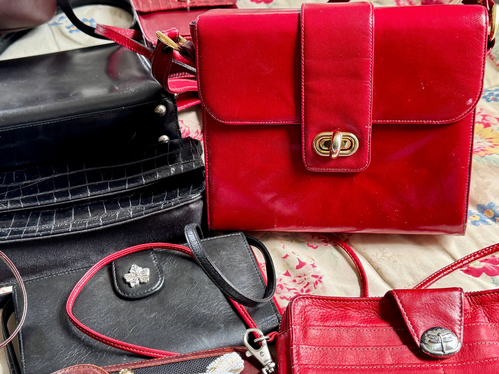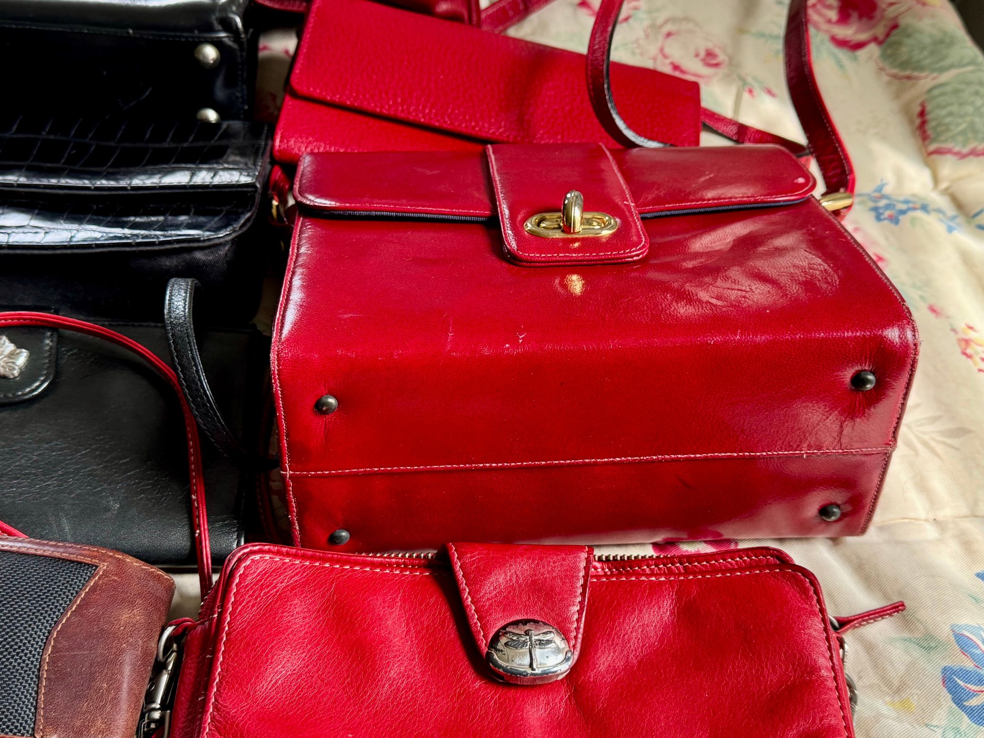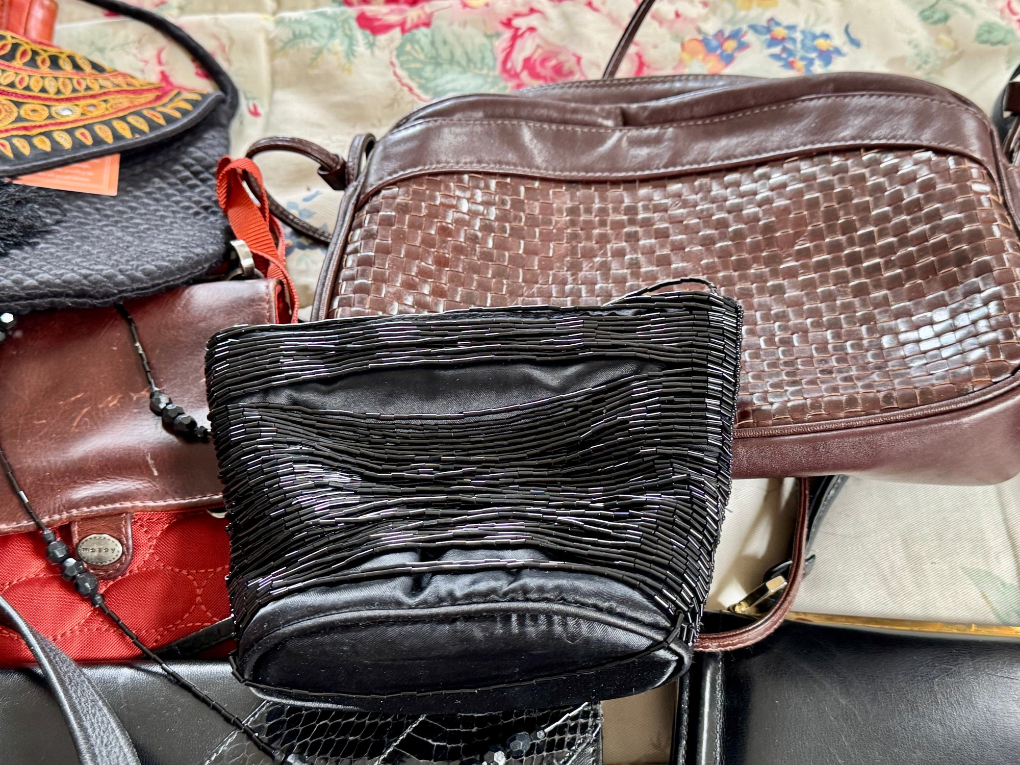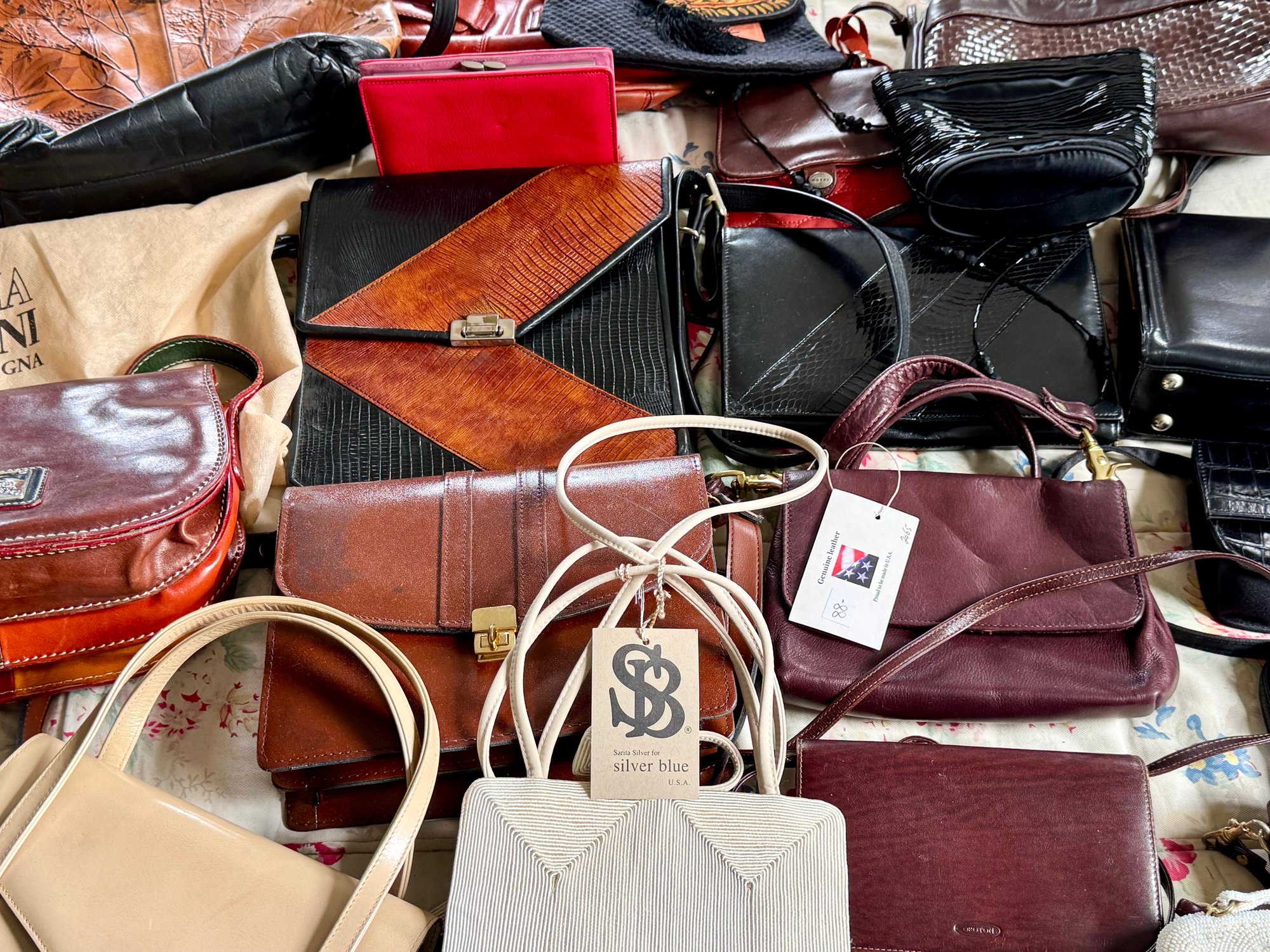 A nice variety of twenty four hand bags, purses and clutches, evening purses with beading, leather Italian hand bags, red leather clutches and more.
