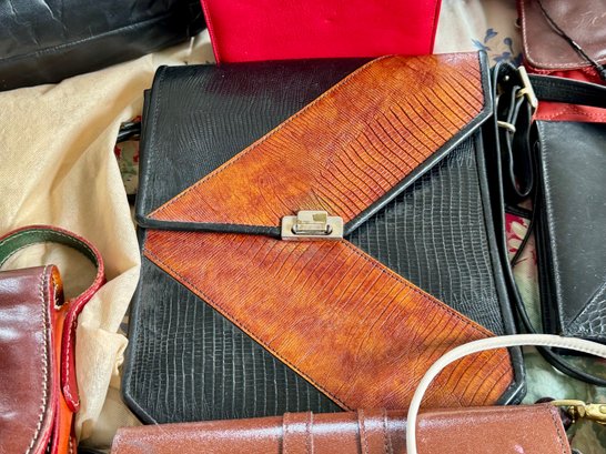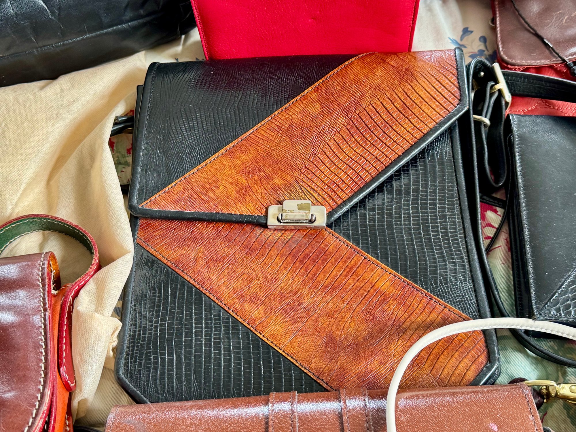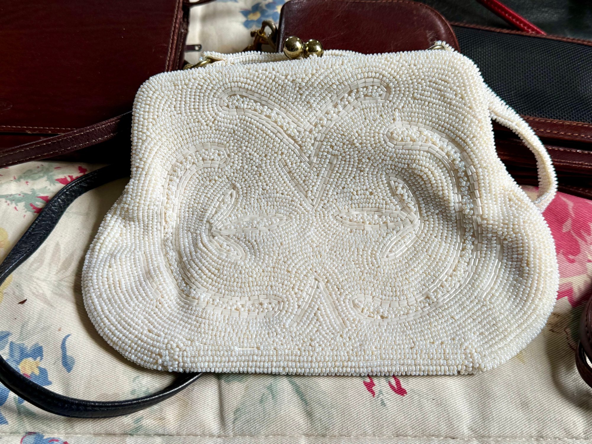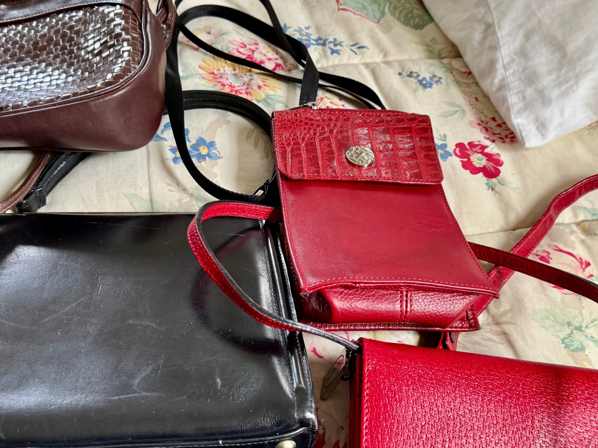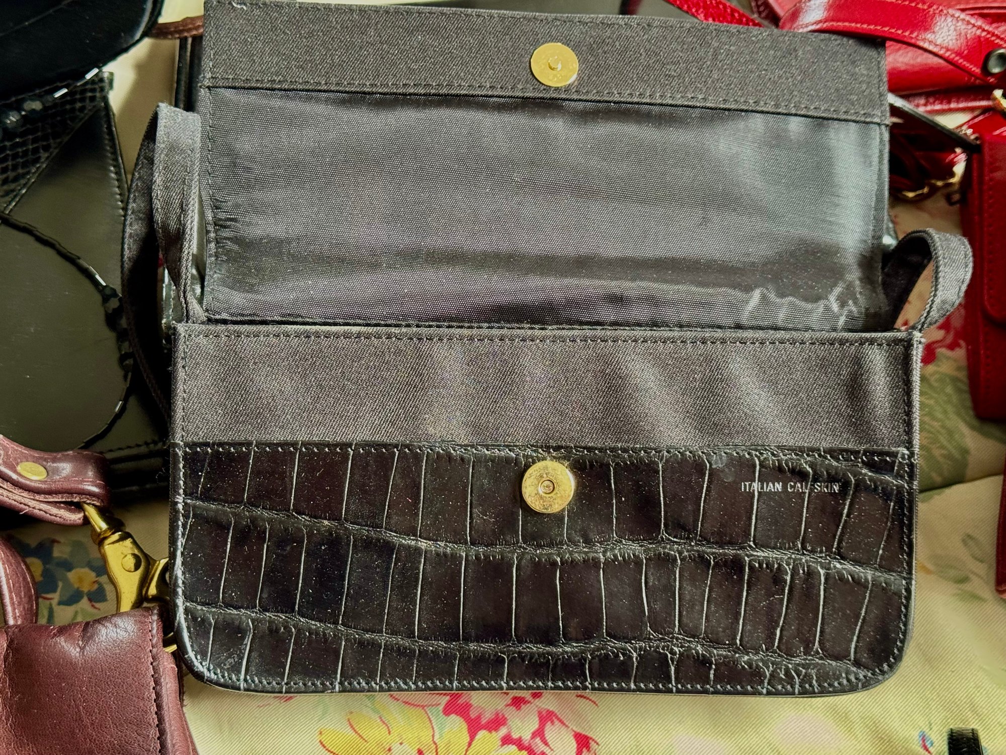 A nice variety of twenty four hand bags, purses and clutches, evening purses with beading, leather Italian hand bags, red leather clutches and more.