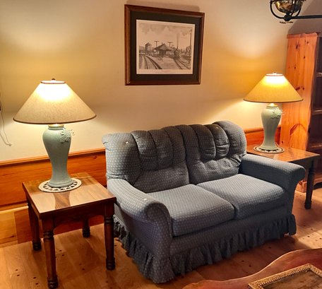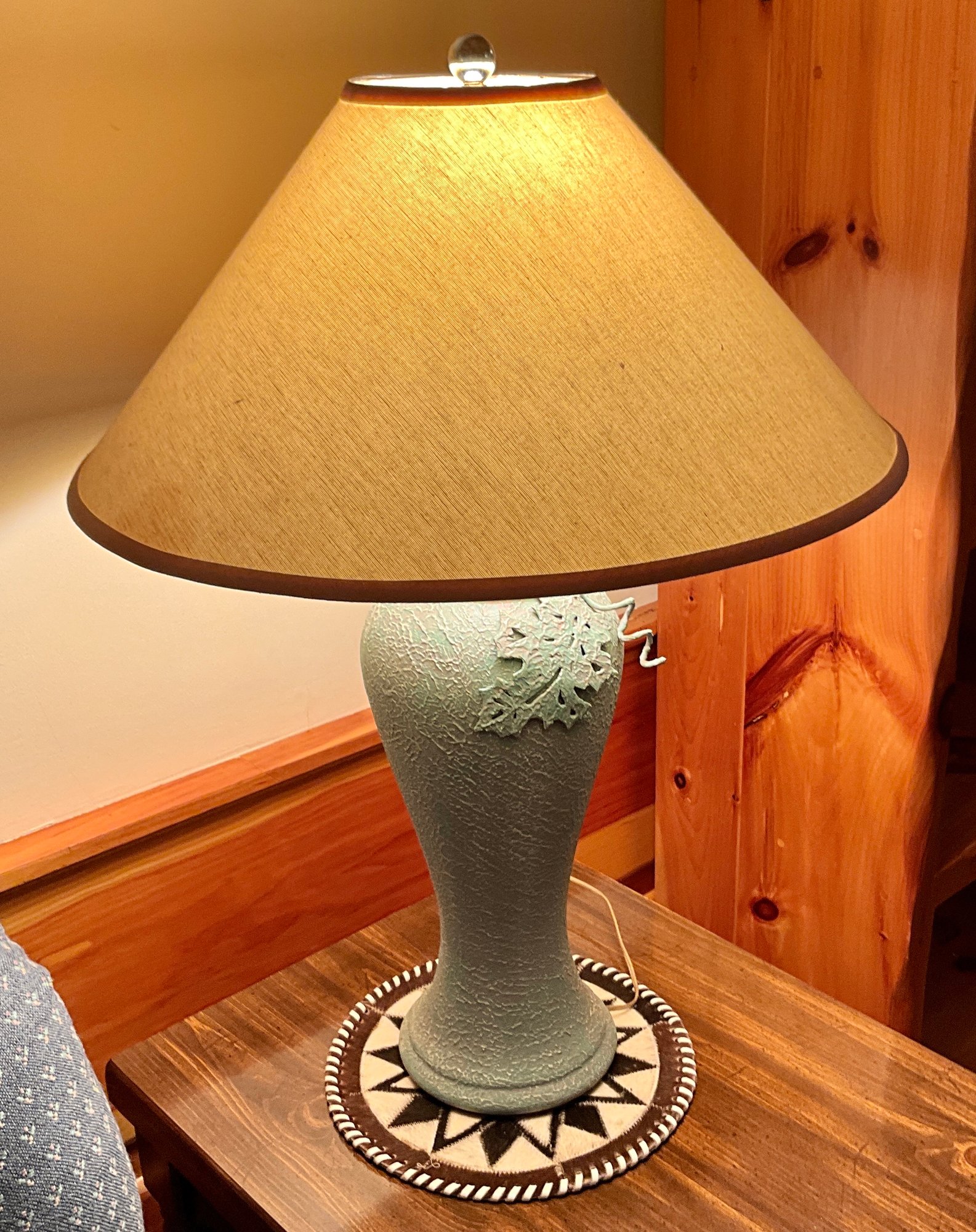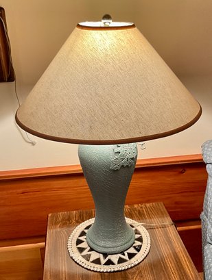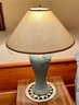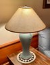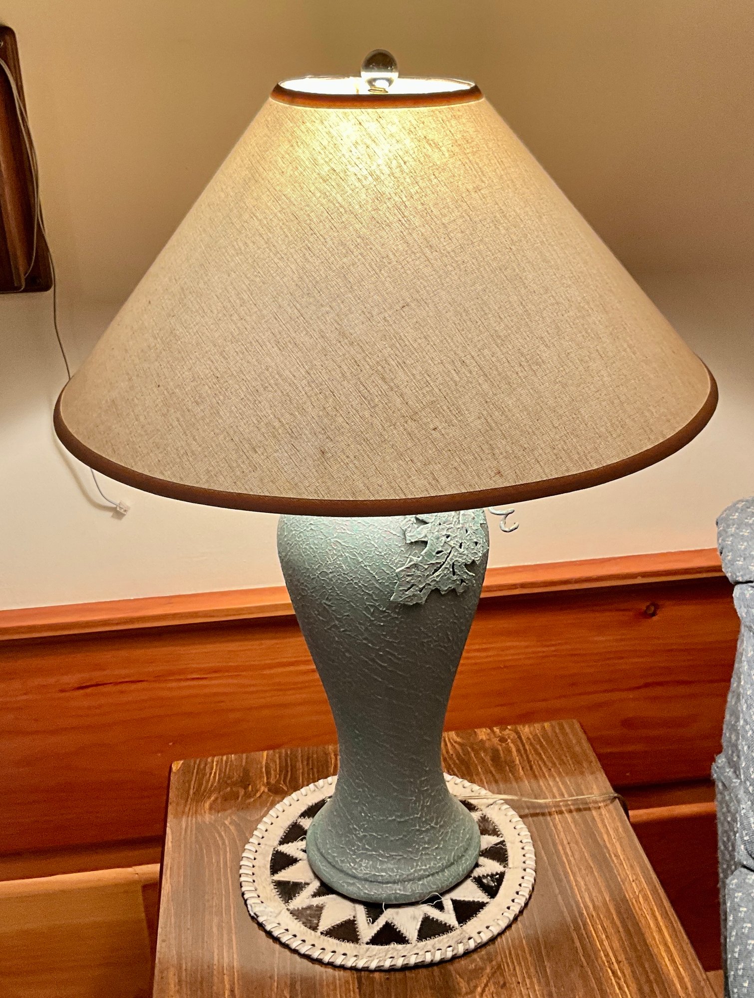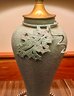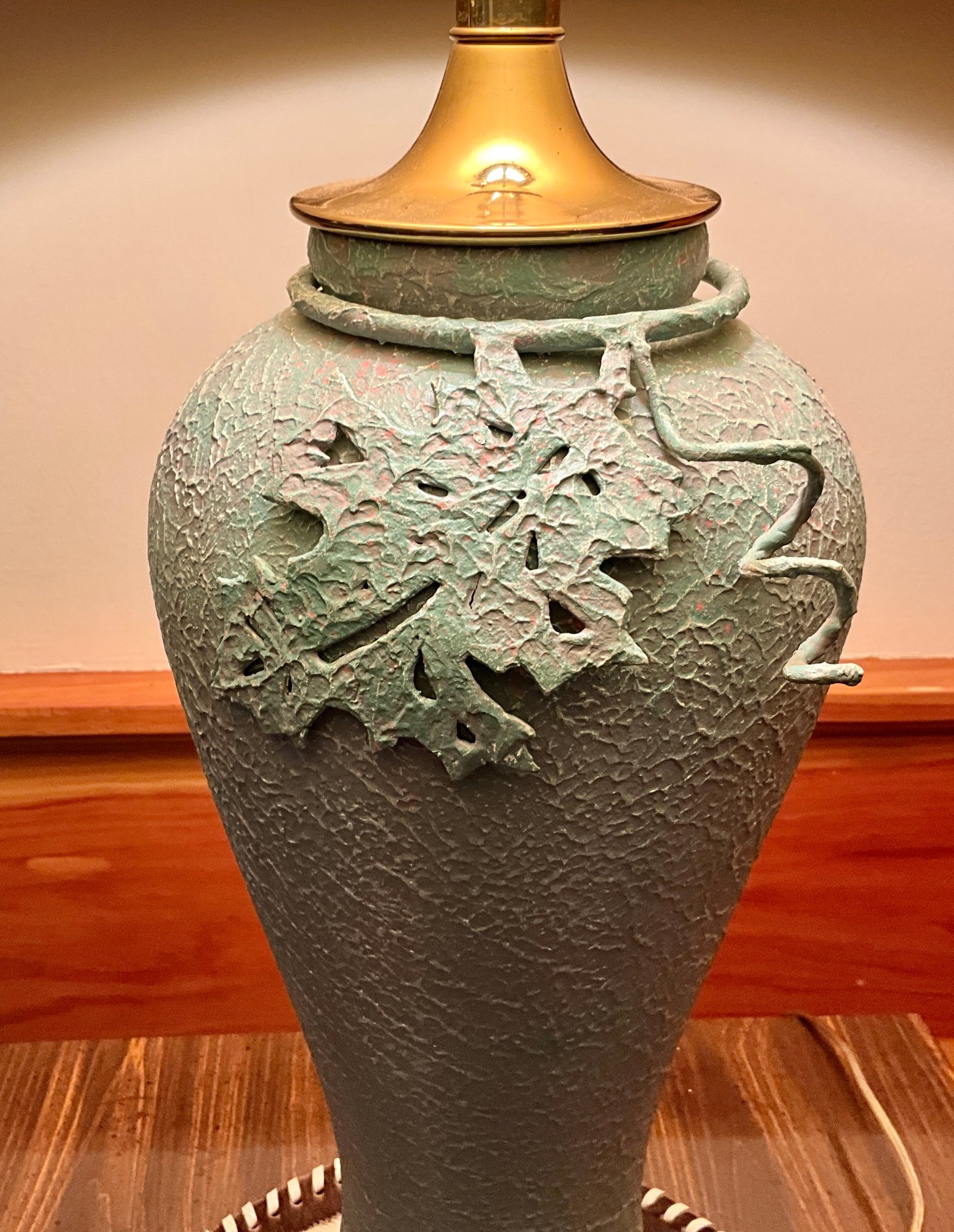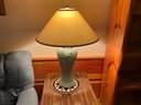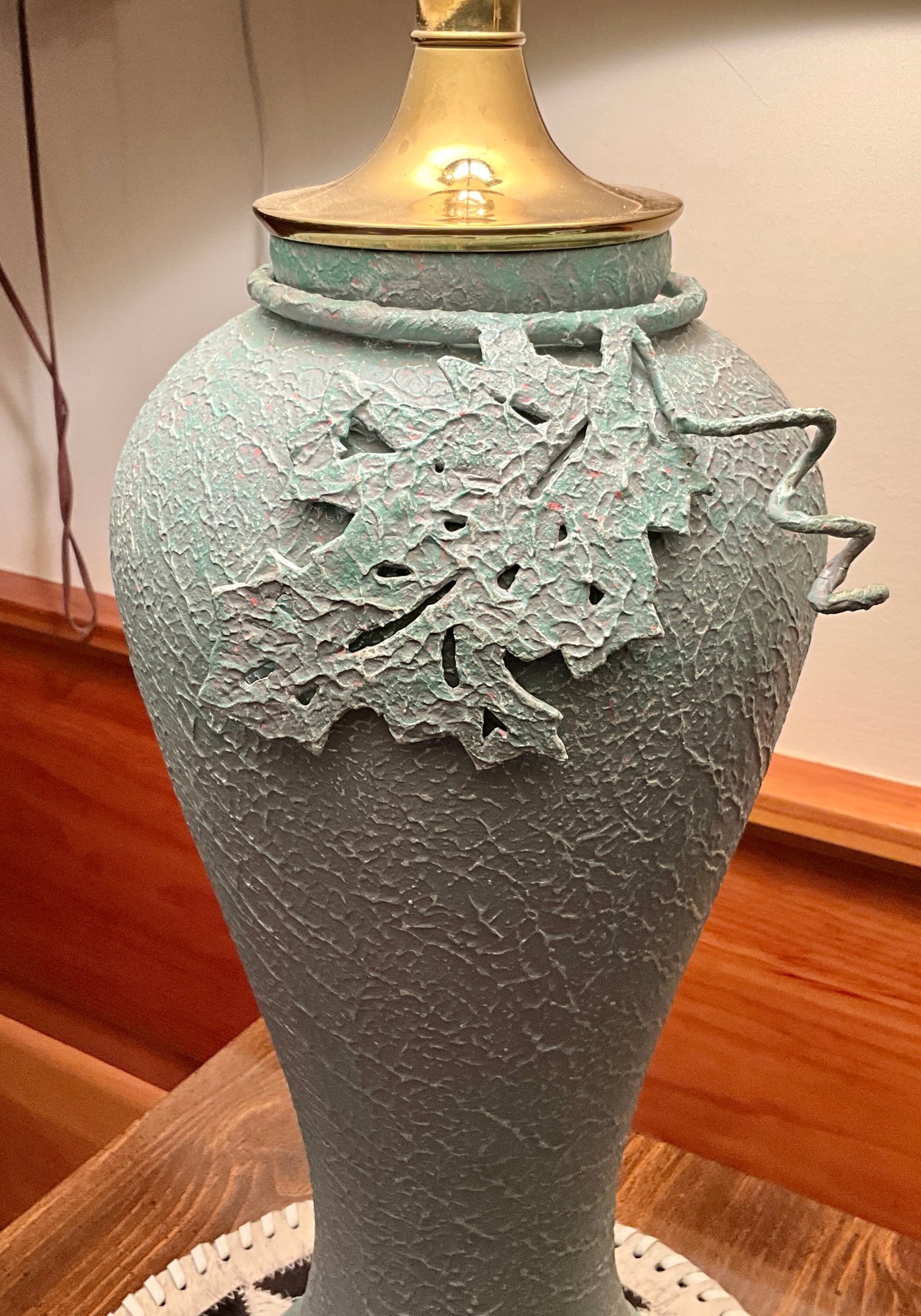 A pair of ceramic blue table lamps with metal leaf accents, with shades.