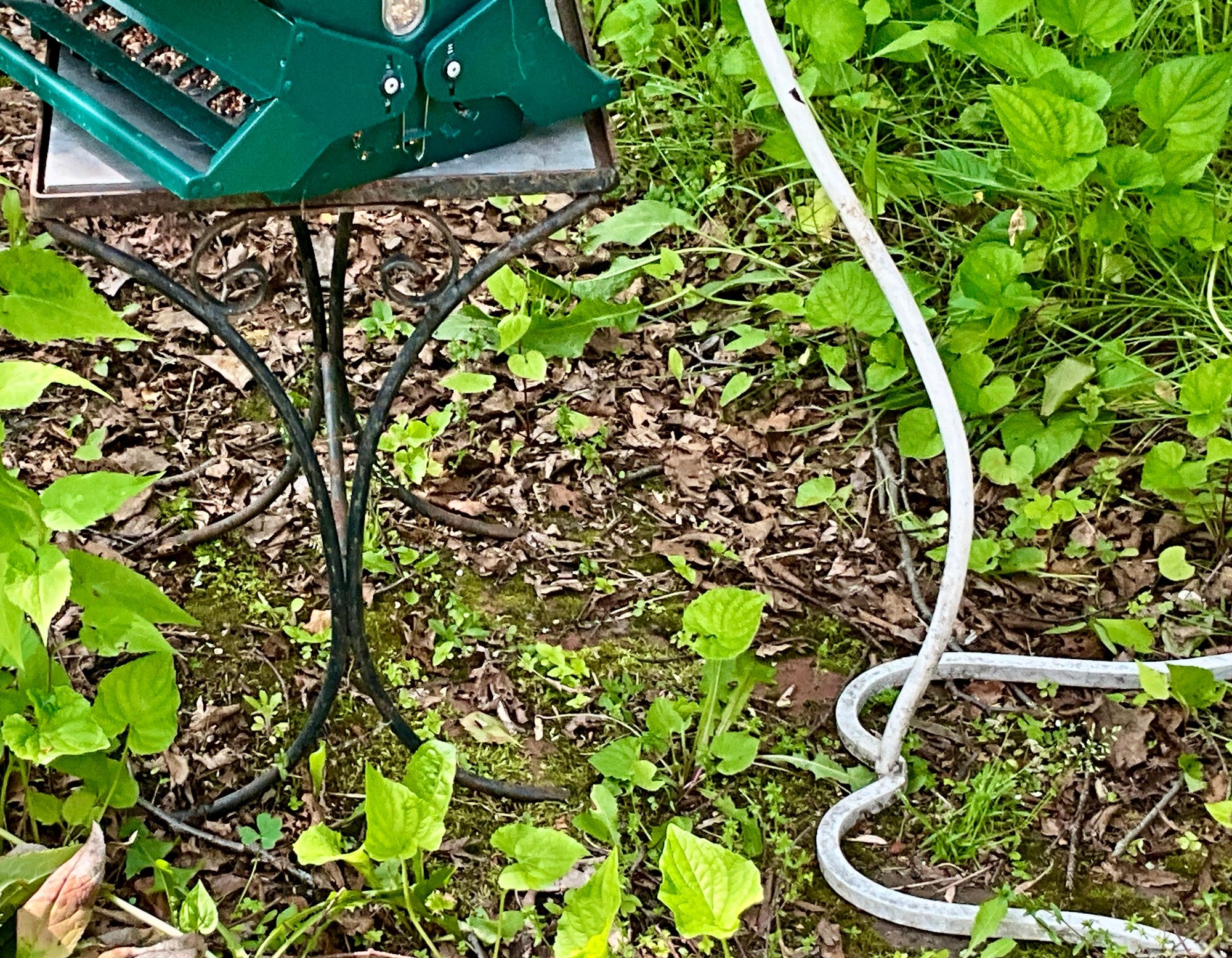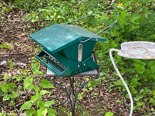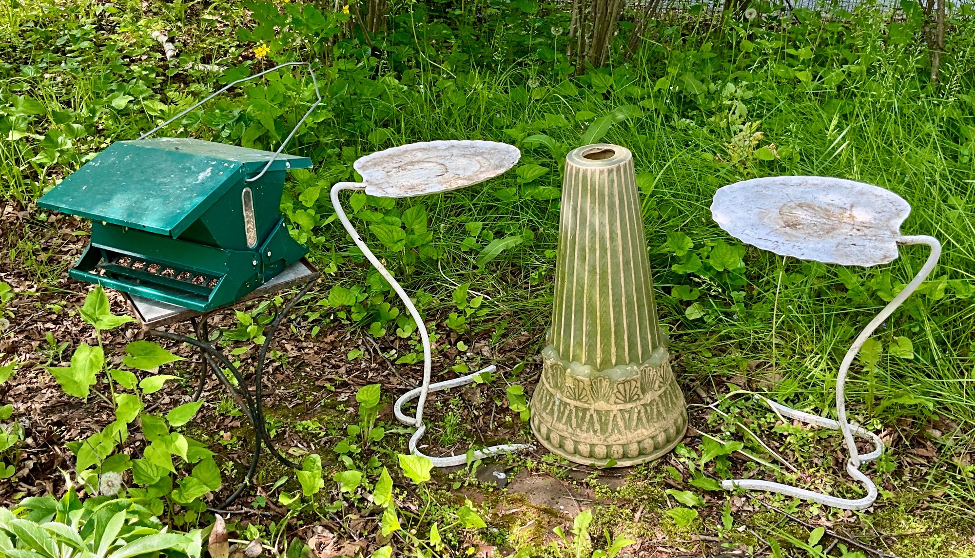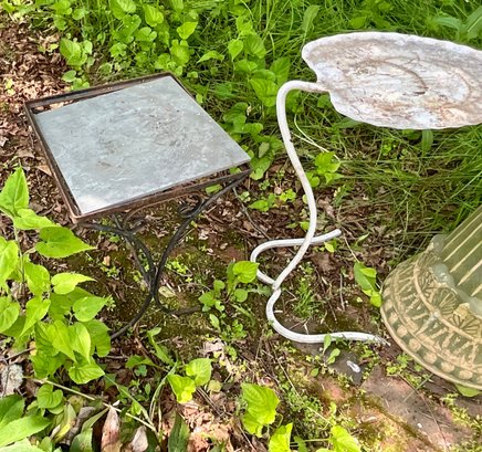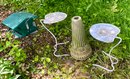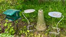 A tile top patio table, bird feeder, and bird bath base with no top.