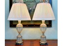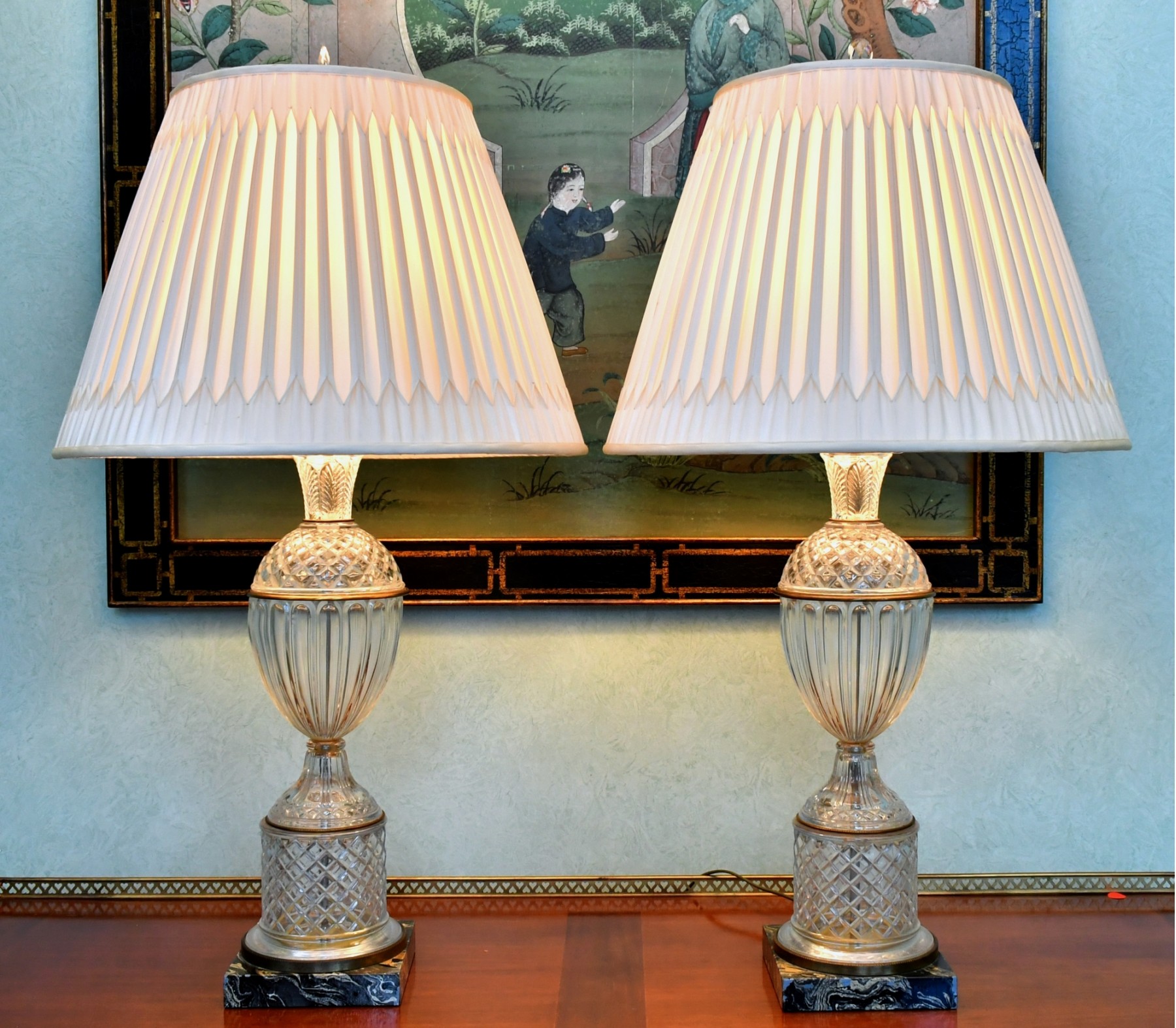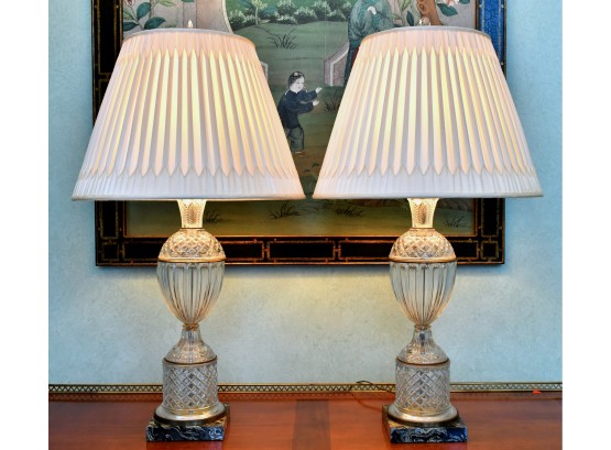 A pair of signed Paul Hanson Empire style crystal lamps acanthus leaf, diamond and fluted design, with brass trim on faux marble painted wood bases with beautiful ivory pleated shades.