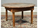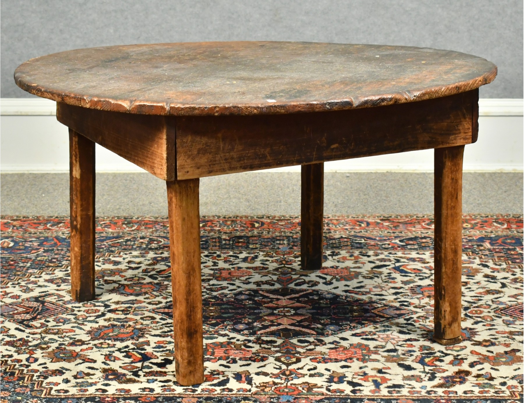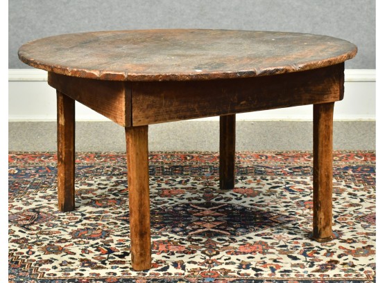 A primitive two board scrub pine top with four square chamfered legs, apron applied with square head nails