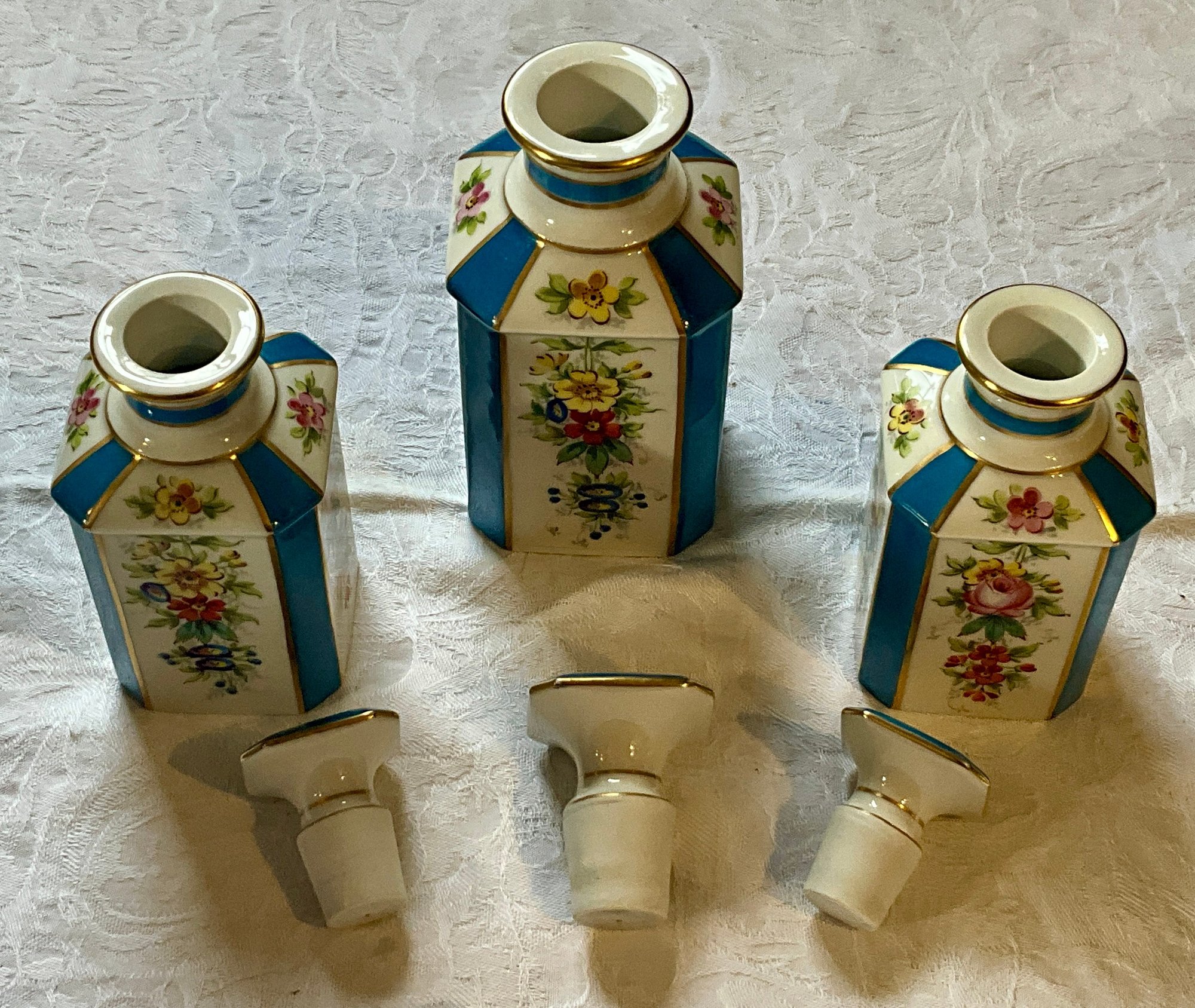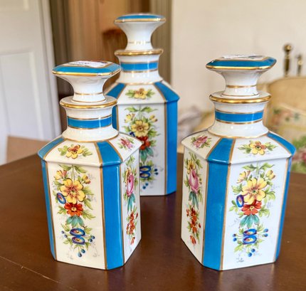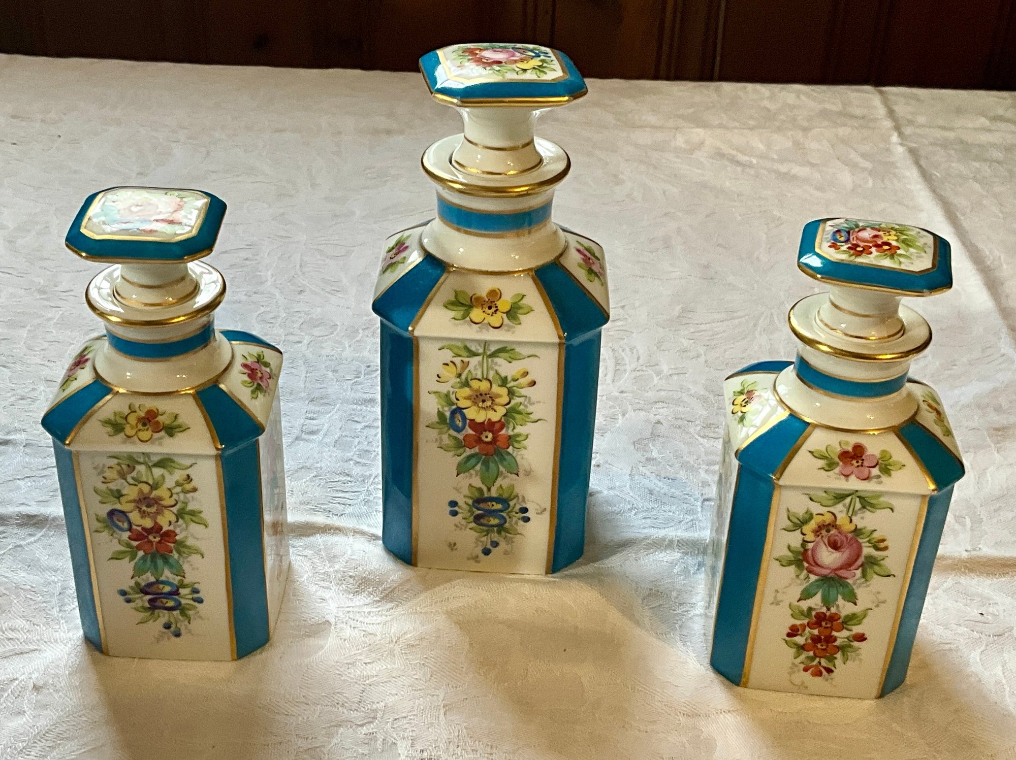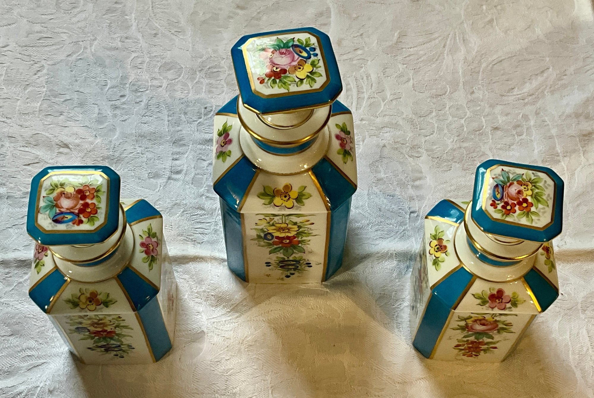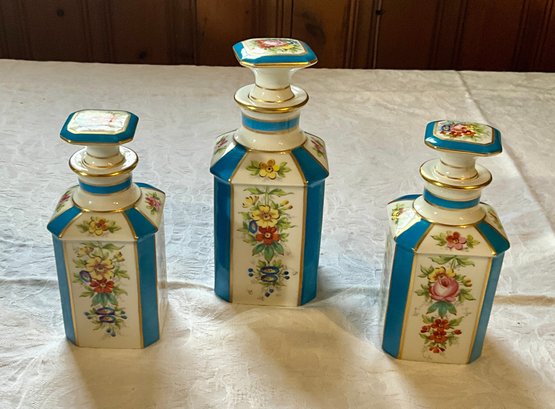 Three vintage Sevres dresser bottles with stoppers, teal blue and white with floral design.