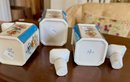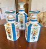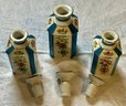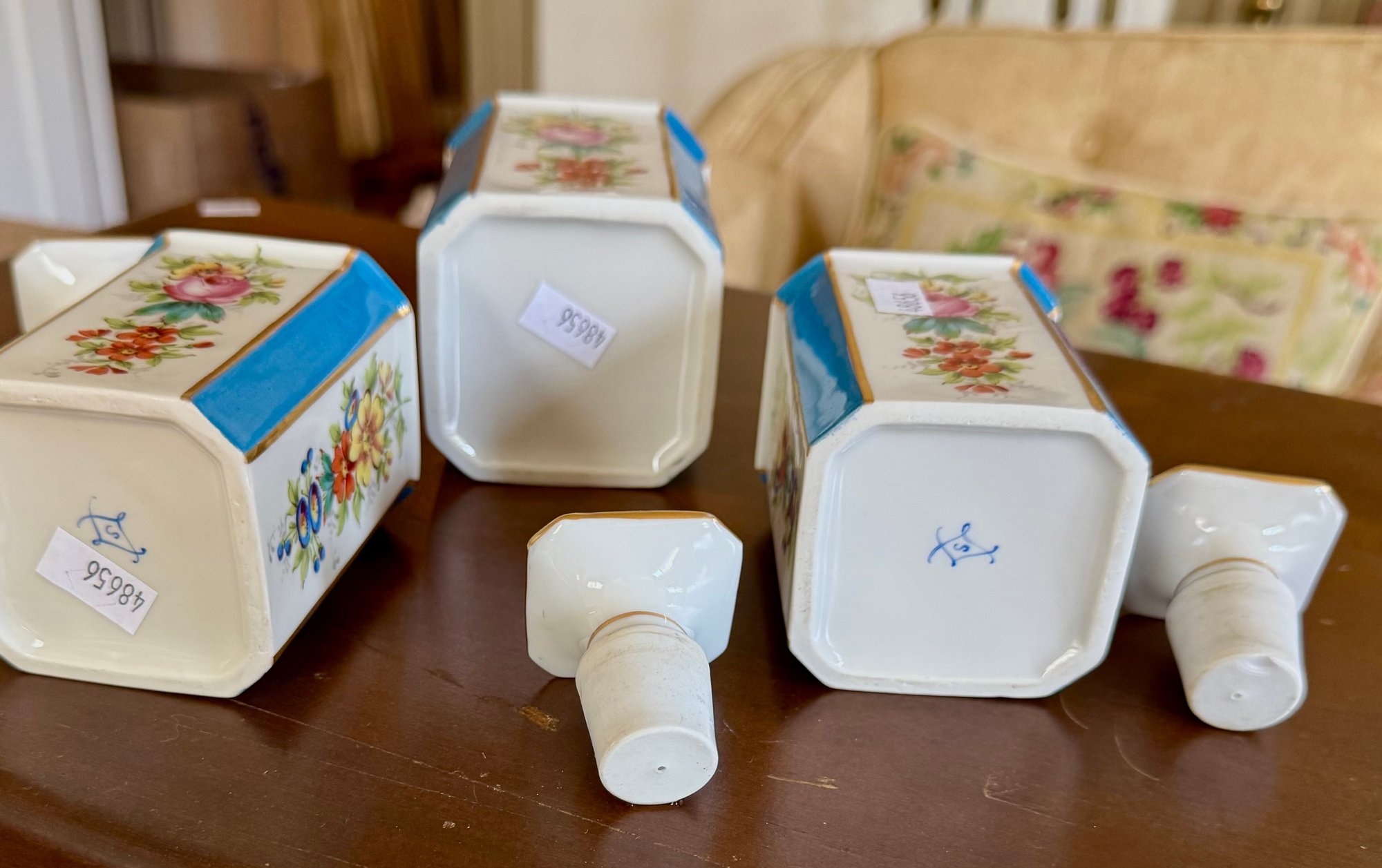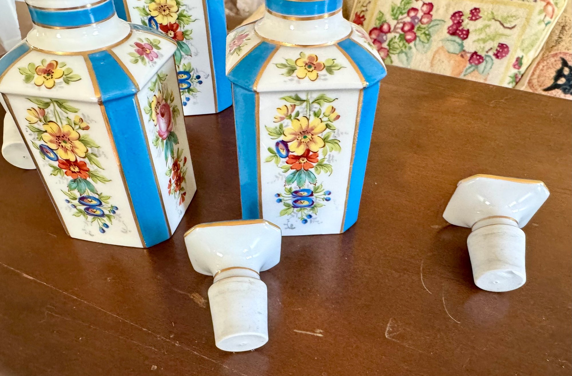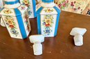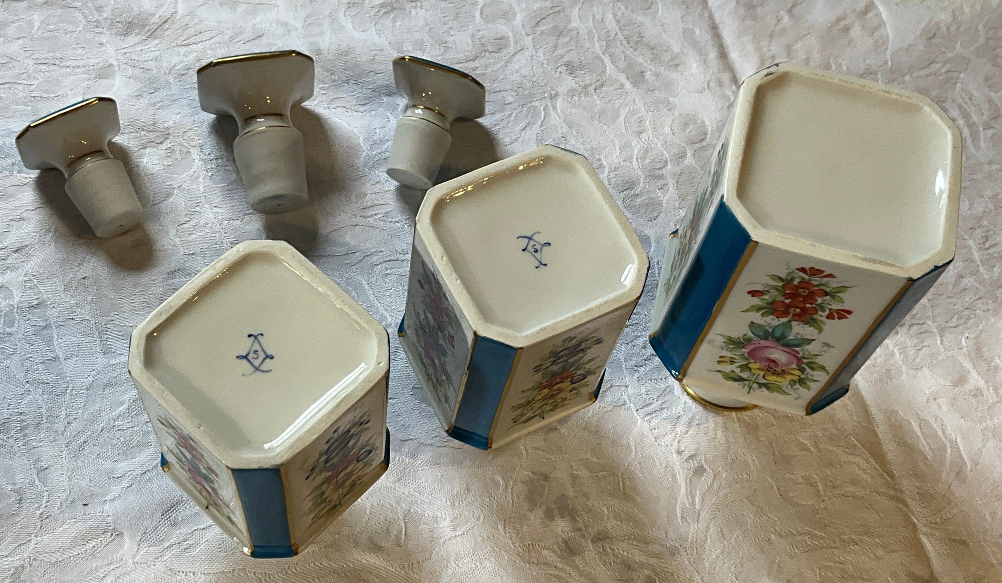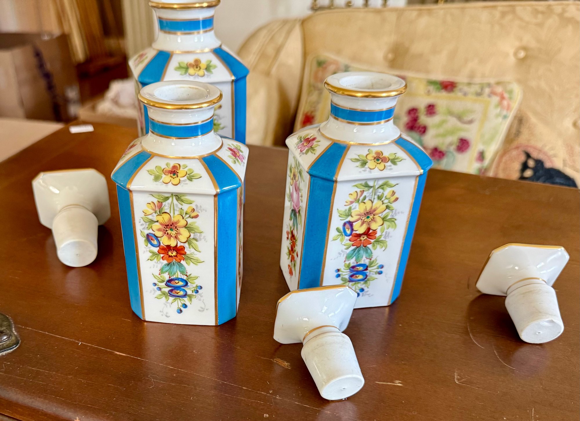 Three vintage Sevres dresser bottles with stoppers, teal blue and white with floral design.