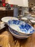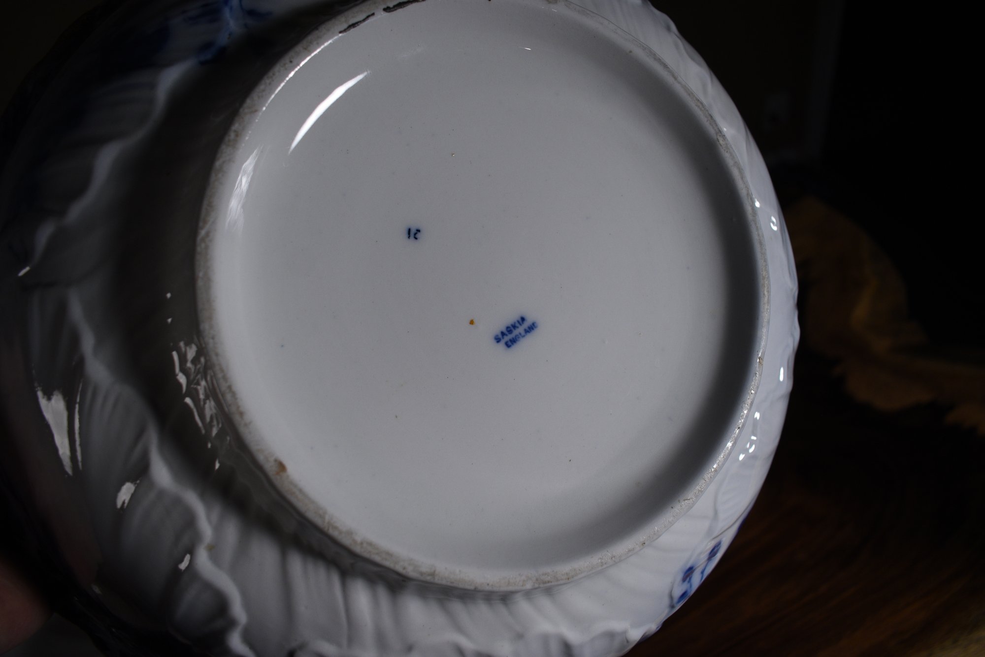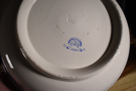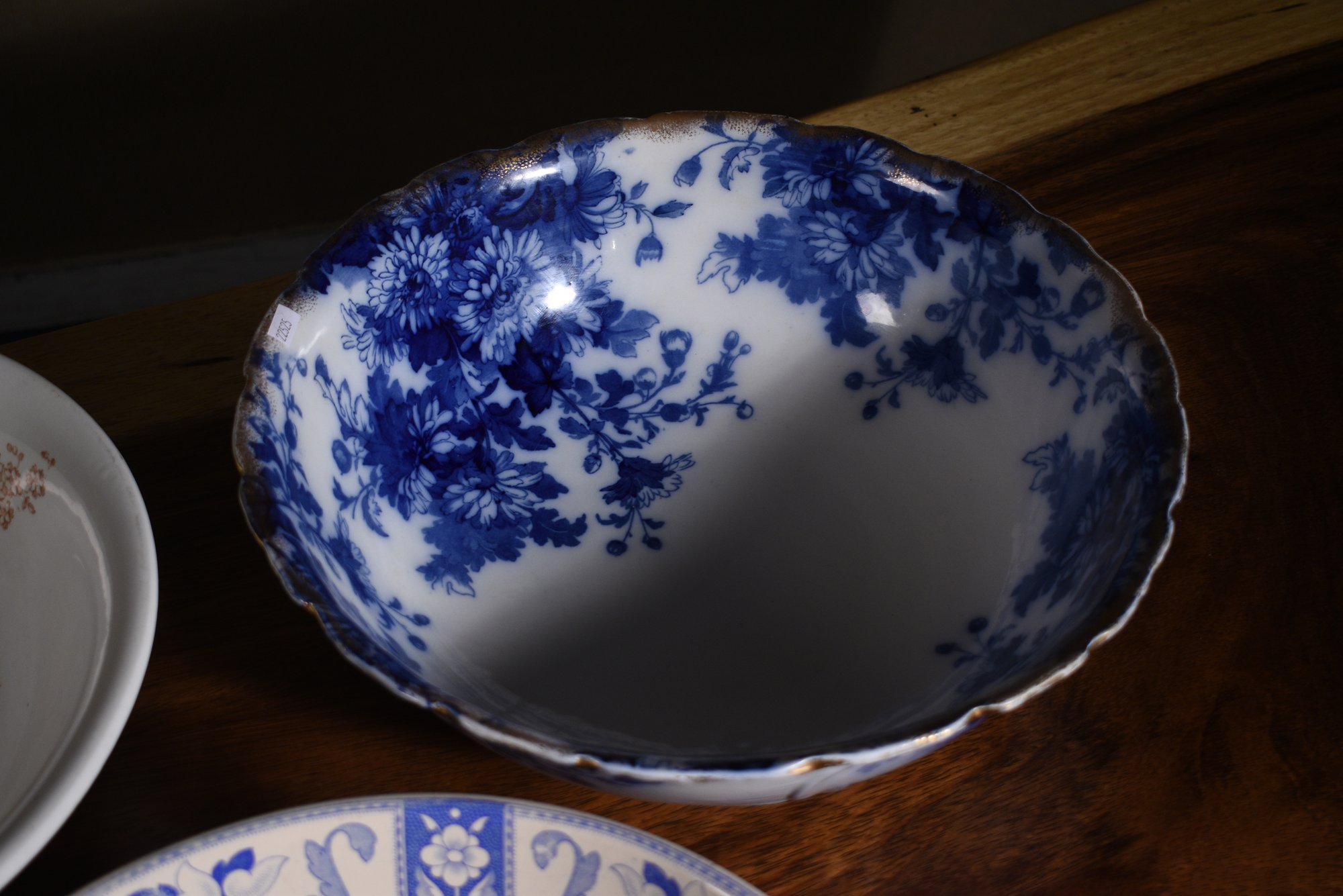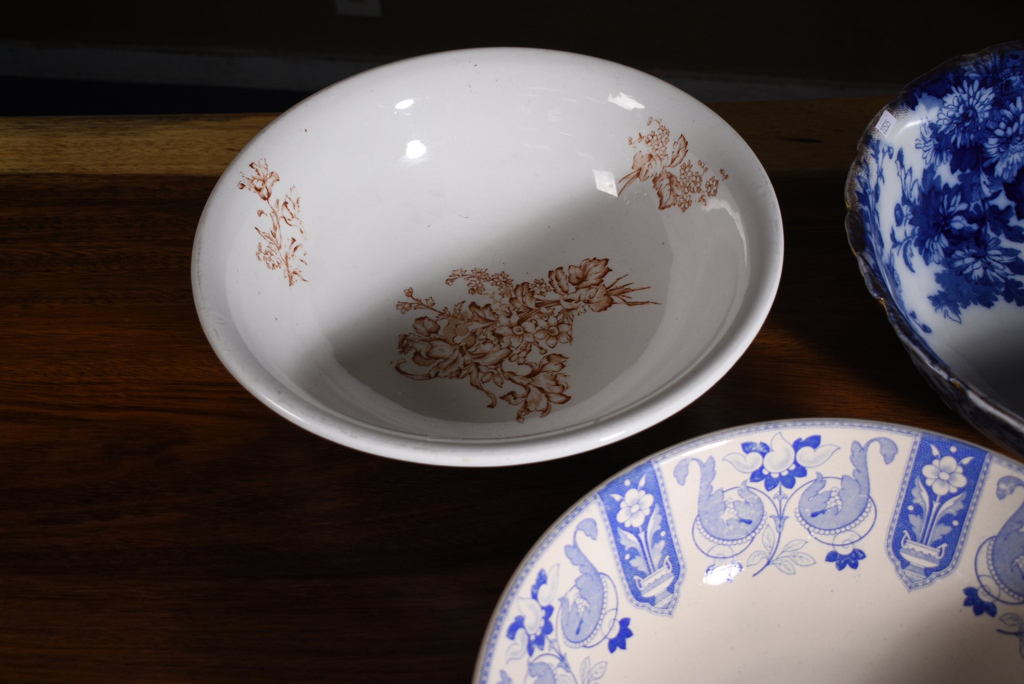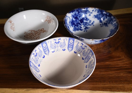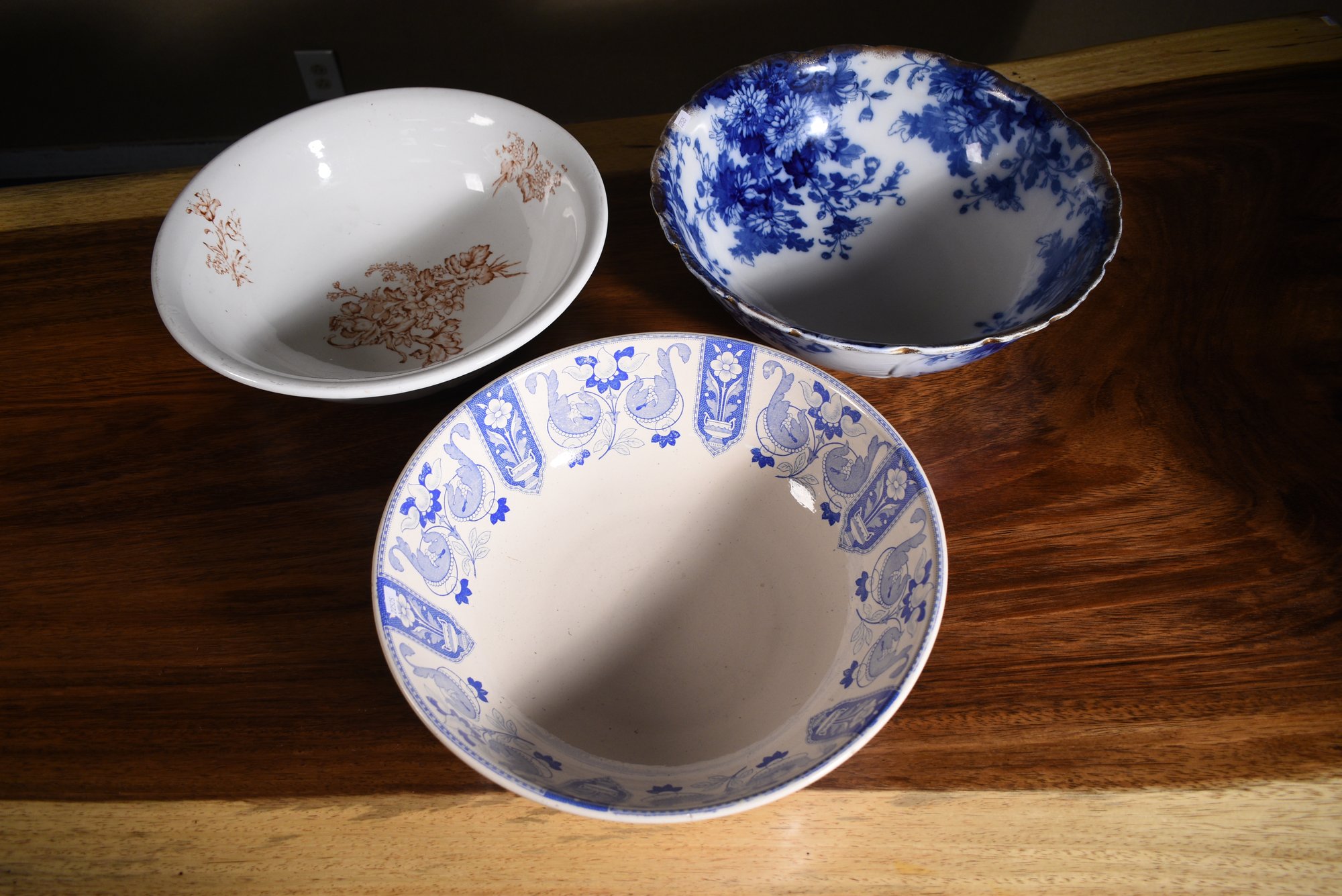 Three vintage wash basins including: stamped Sakia blue and white floral with gold edge 15.75" dia, unmarked sepia floral design on white 15.25” dia, Brownfield & Sons Yesso pattern blue and white 14.24” dia.