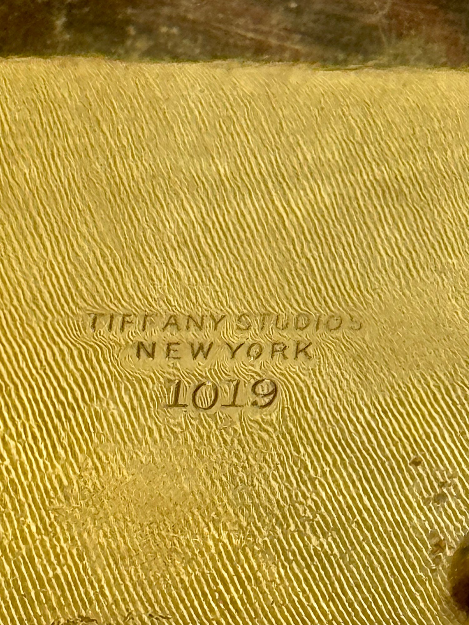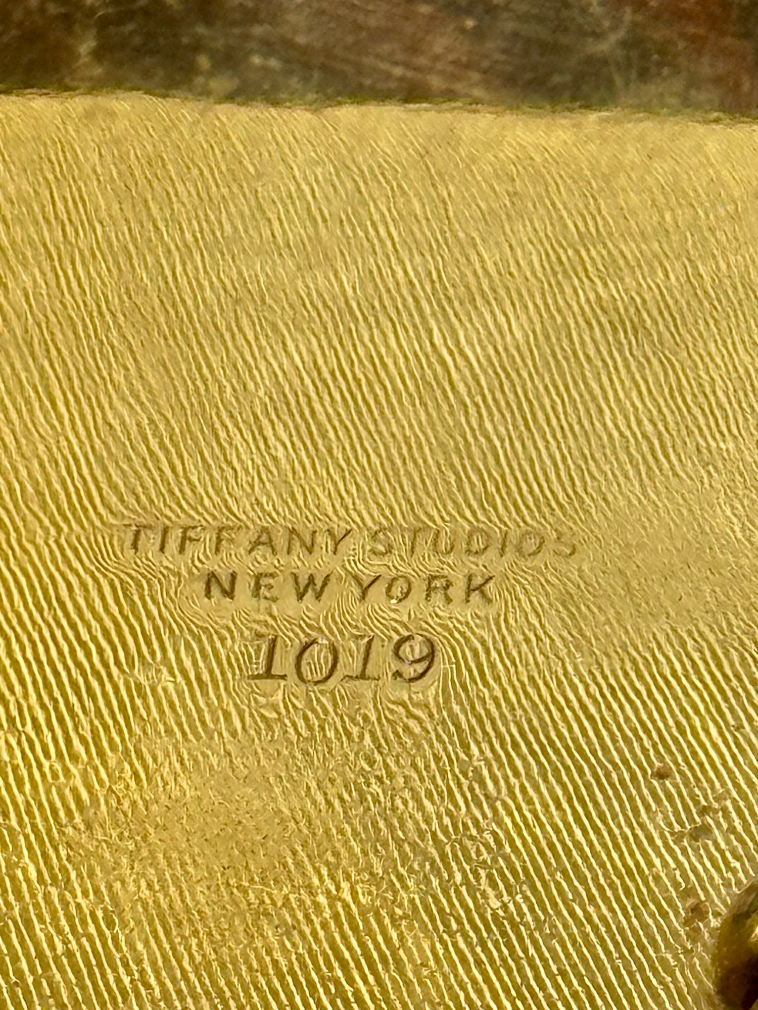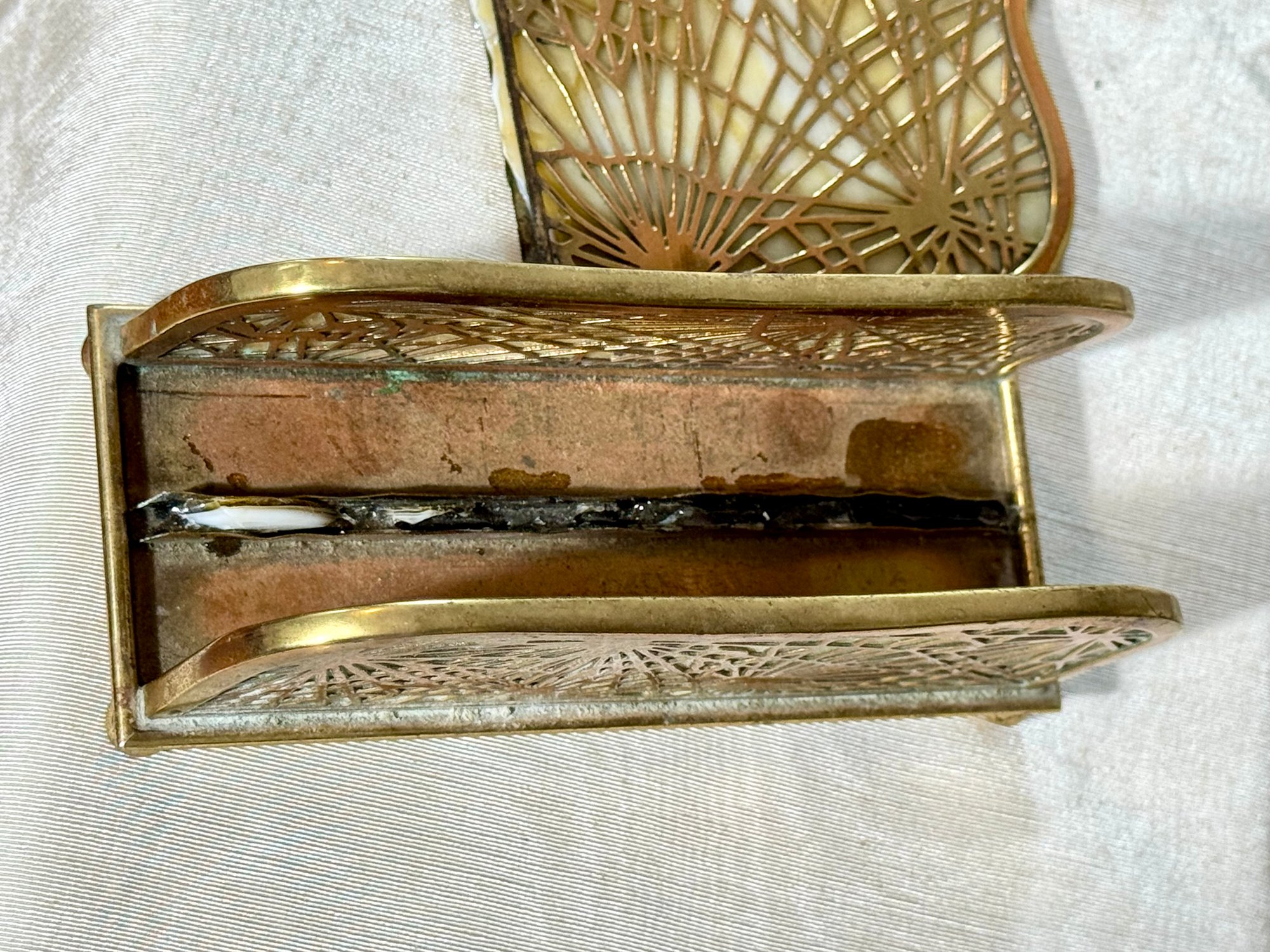 A Tiffany Studios New York letter holder with pine needle design, marked Tiffany Studios New York 1019.