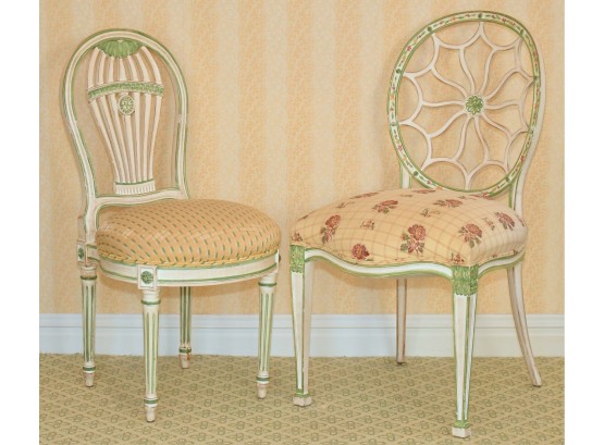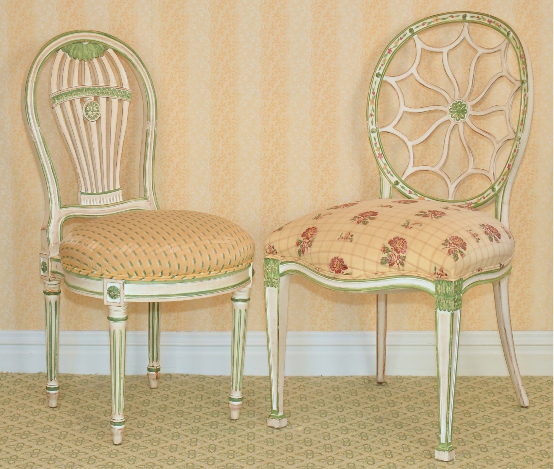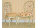 A French style chair with a circular reticulated floral back with an upholstered serpentine seat, in a green painted floral decorated surface, with square tapered legs 38"H x 20"W x 18"seat height, with wear and a tear to the yellow and rose floral upholstery.