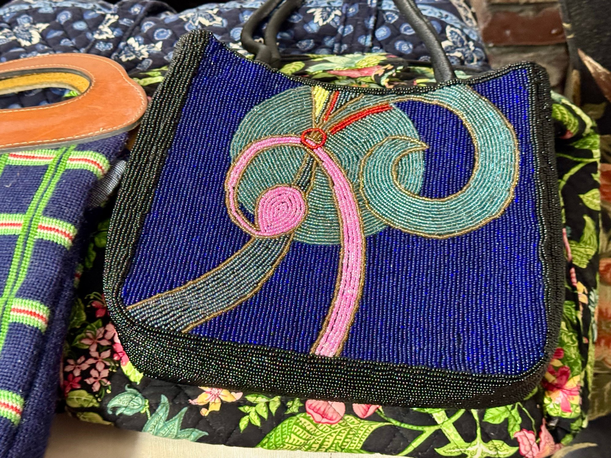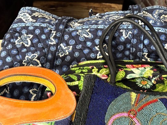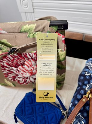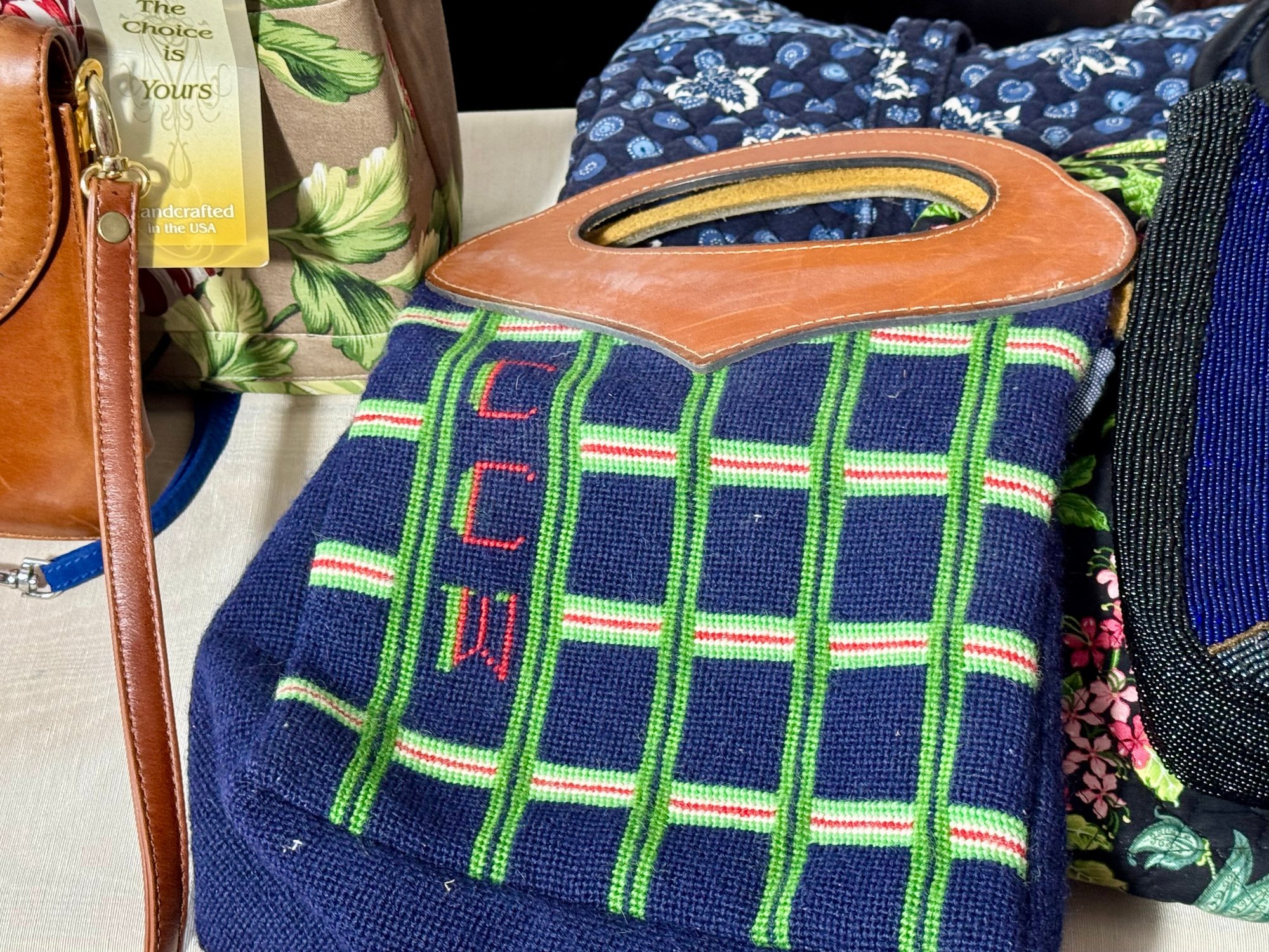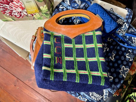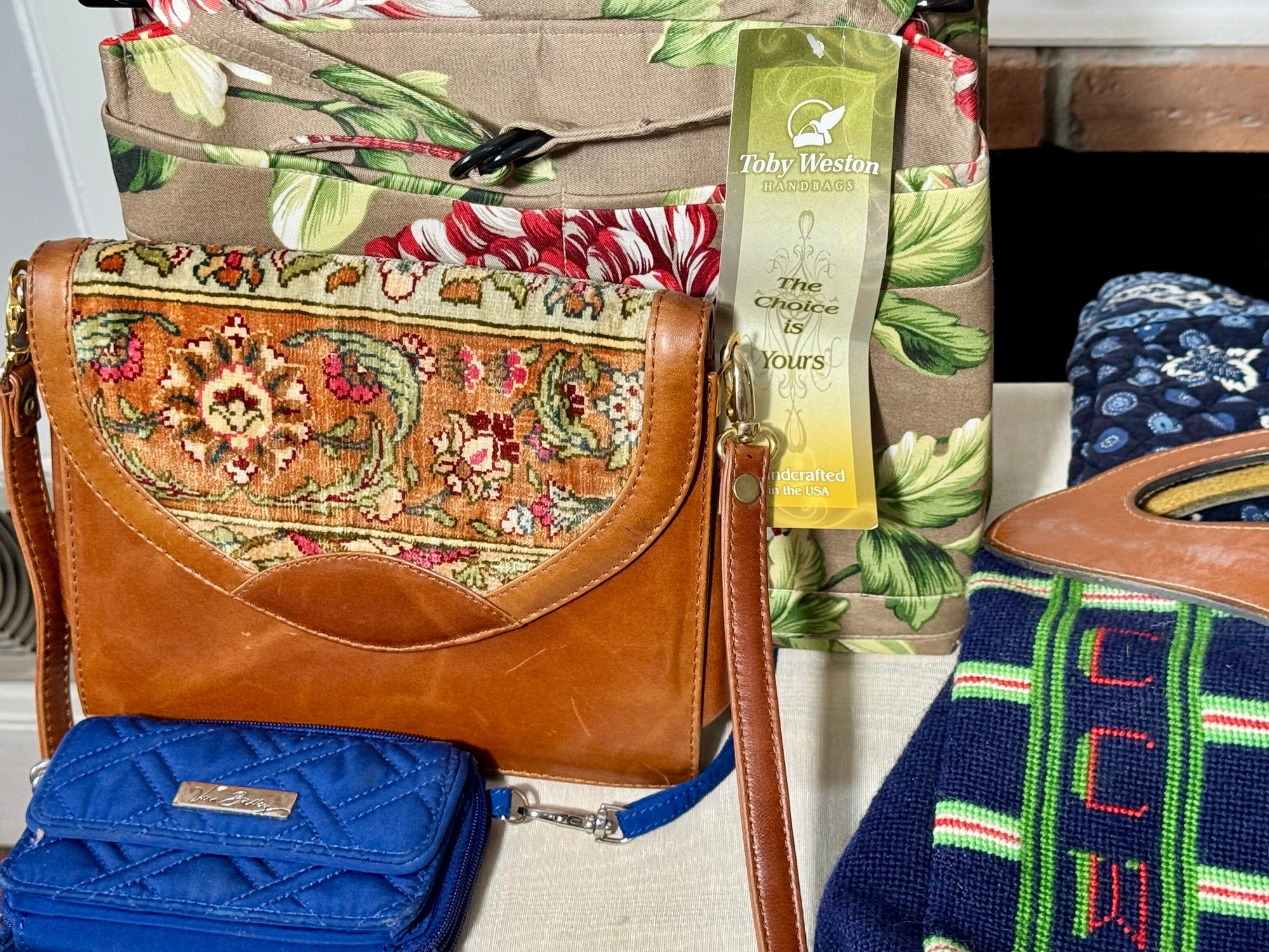 A Vera Bradley blue and white quilted bag, a Vera Bradley floral design quilted travel bag, a small Vera Bradley blue quilted purse, a Toby Weston floral design cloth hand bag, a brown leather purse with velvet design, a Delia beaded purse, a needlepoint monogrammed purse with leather handles.