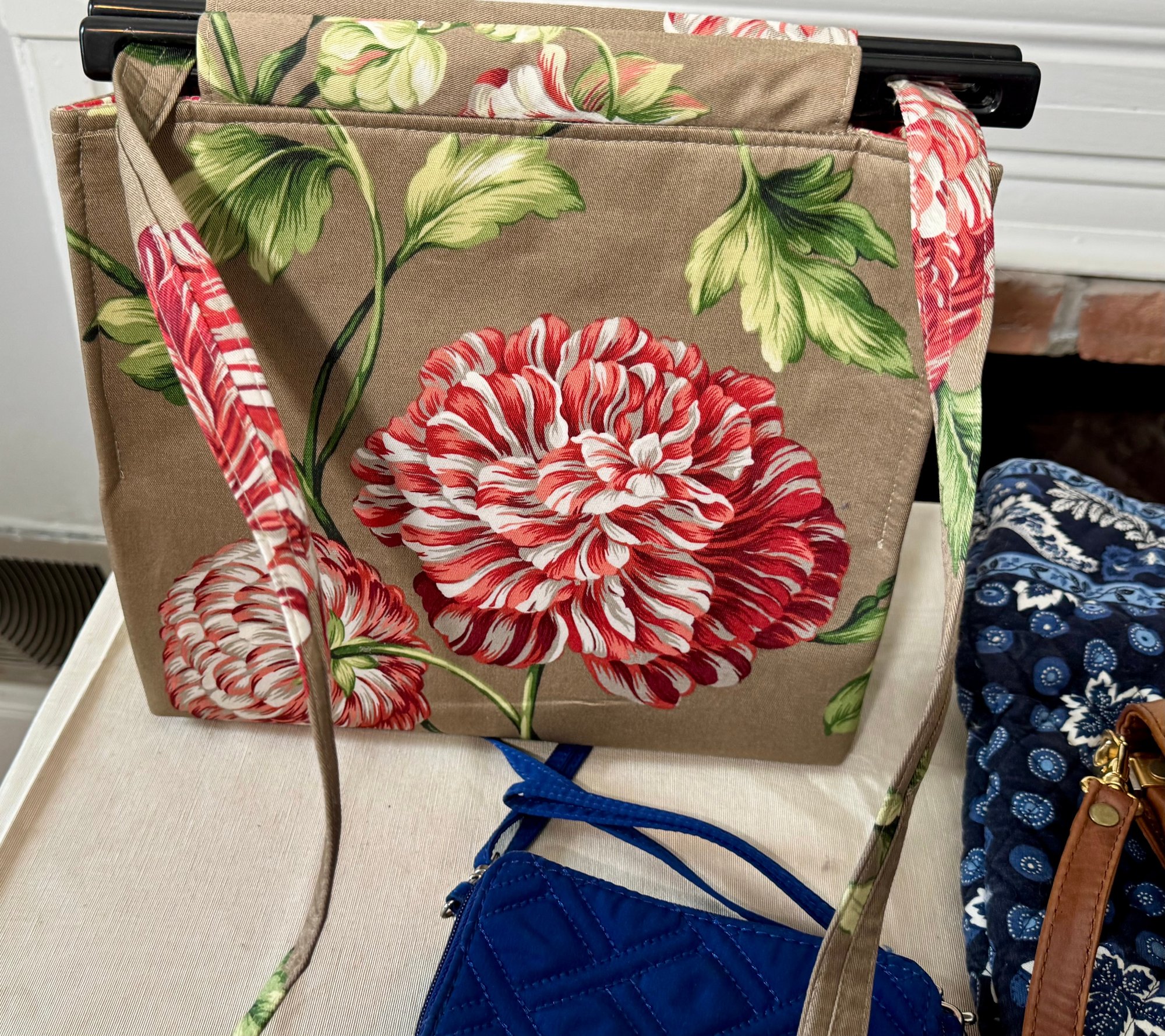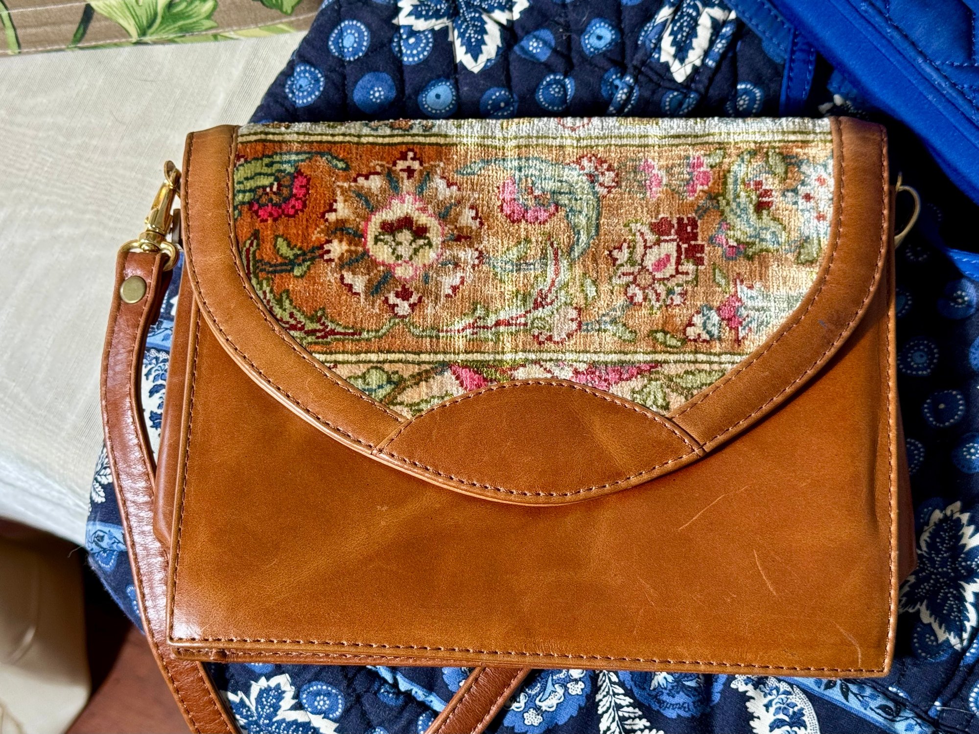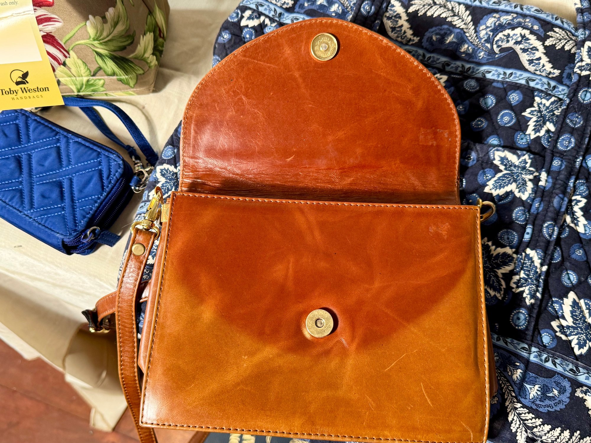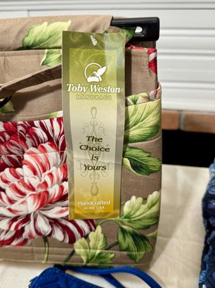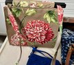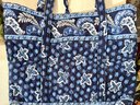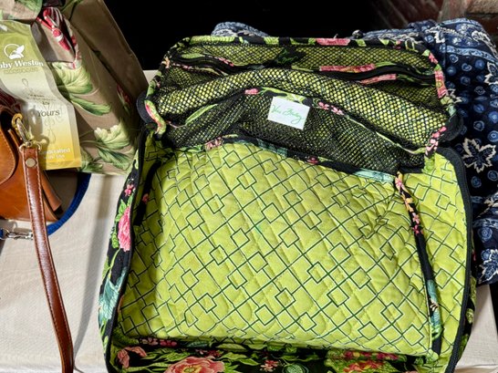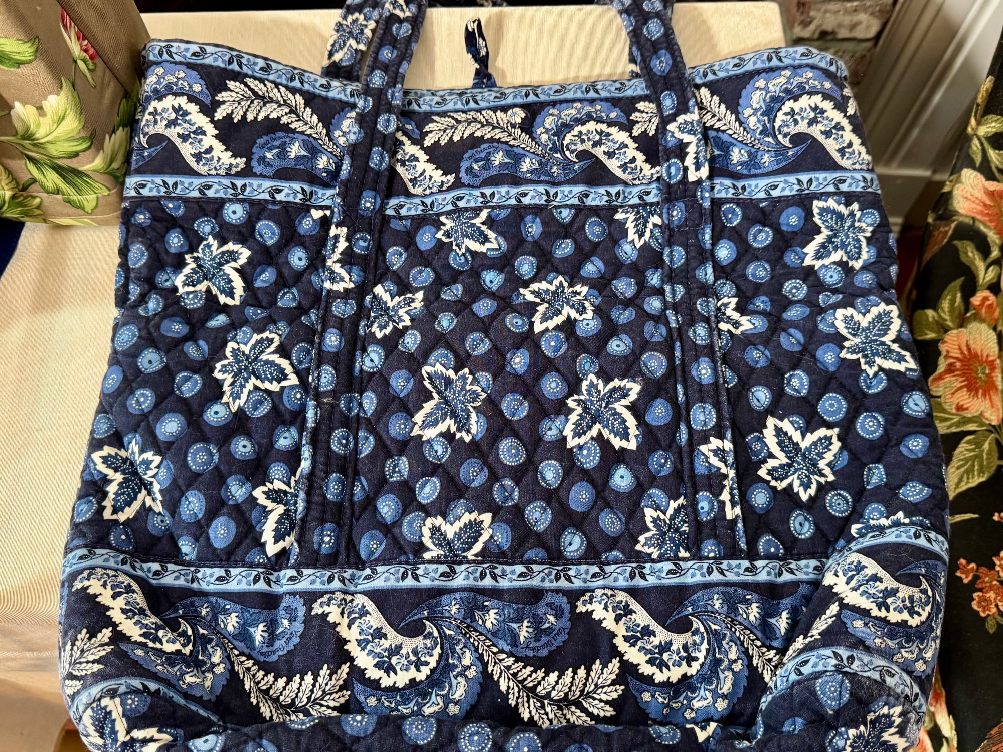 A Vera Bradley blue and white quilted bag, a Vera Bradley floral design quilted travel bag, a small Vera Bradley blue quilted purse, a Toby Weston floral design cloth hand bag, a brown leather purse with velvet design, a Delia beaded purse, a needlepoint monogrammed purse with leather handles.