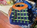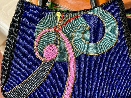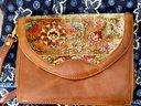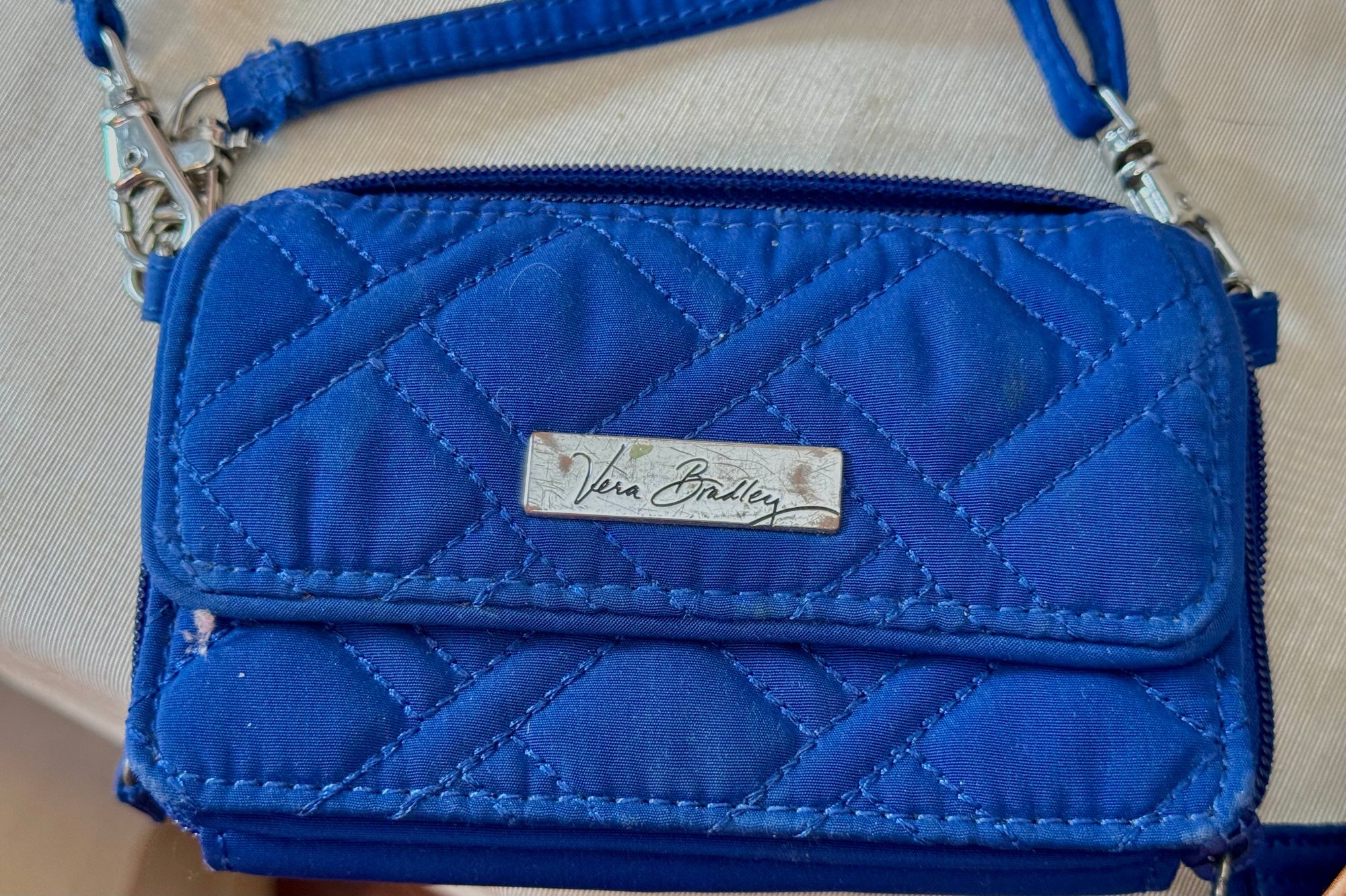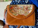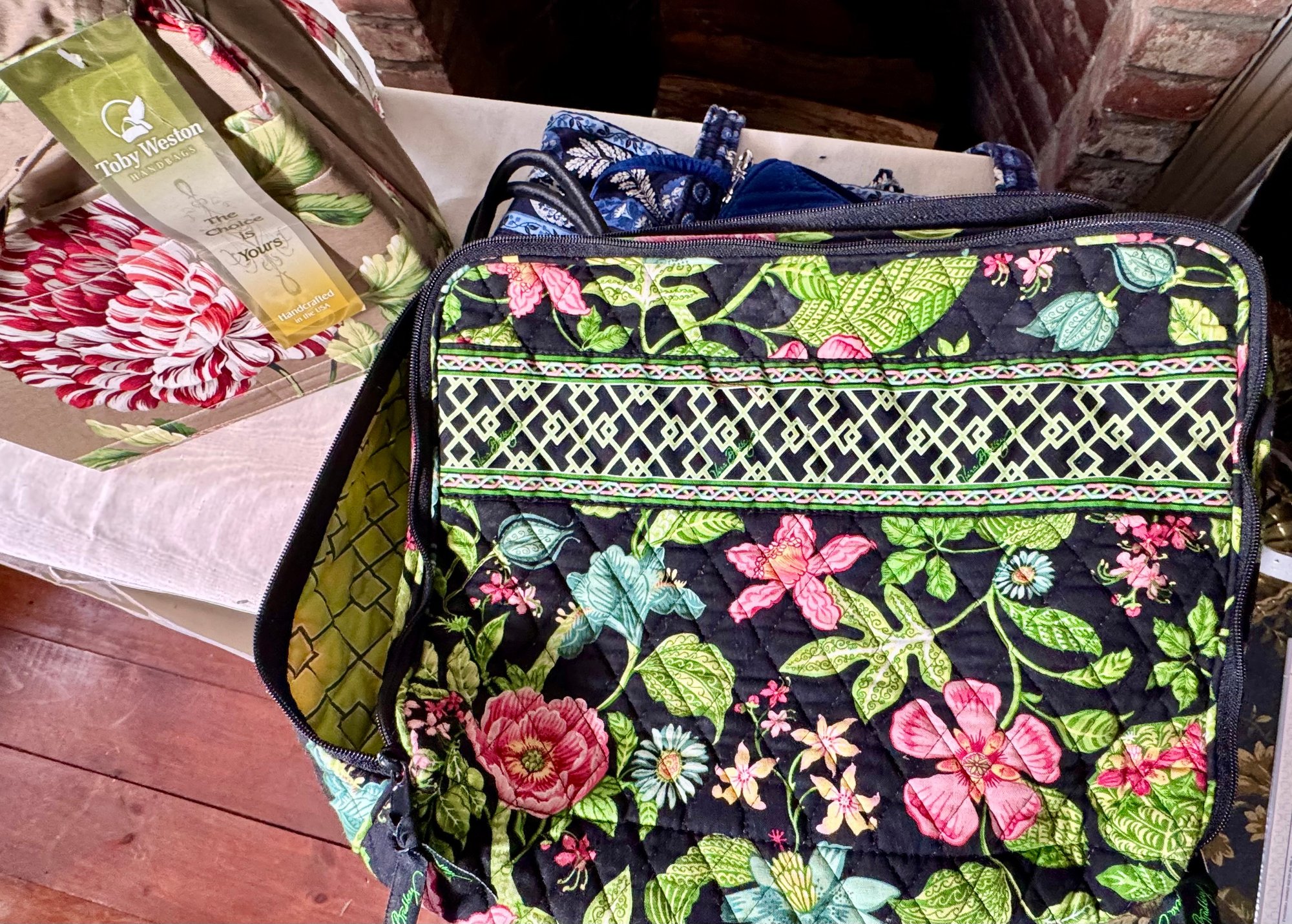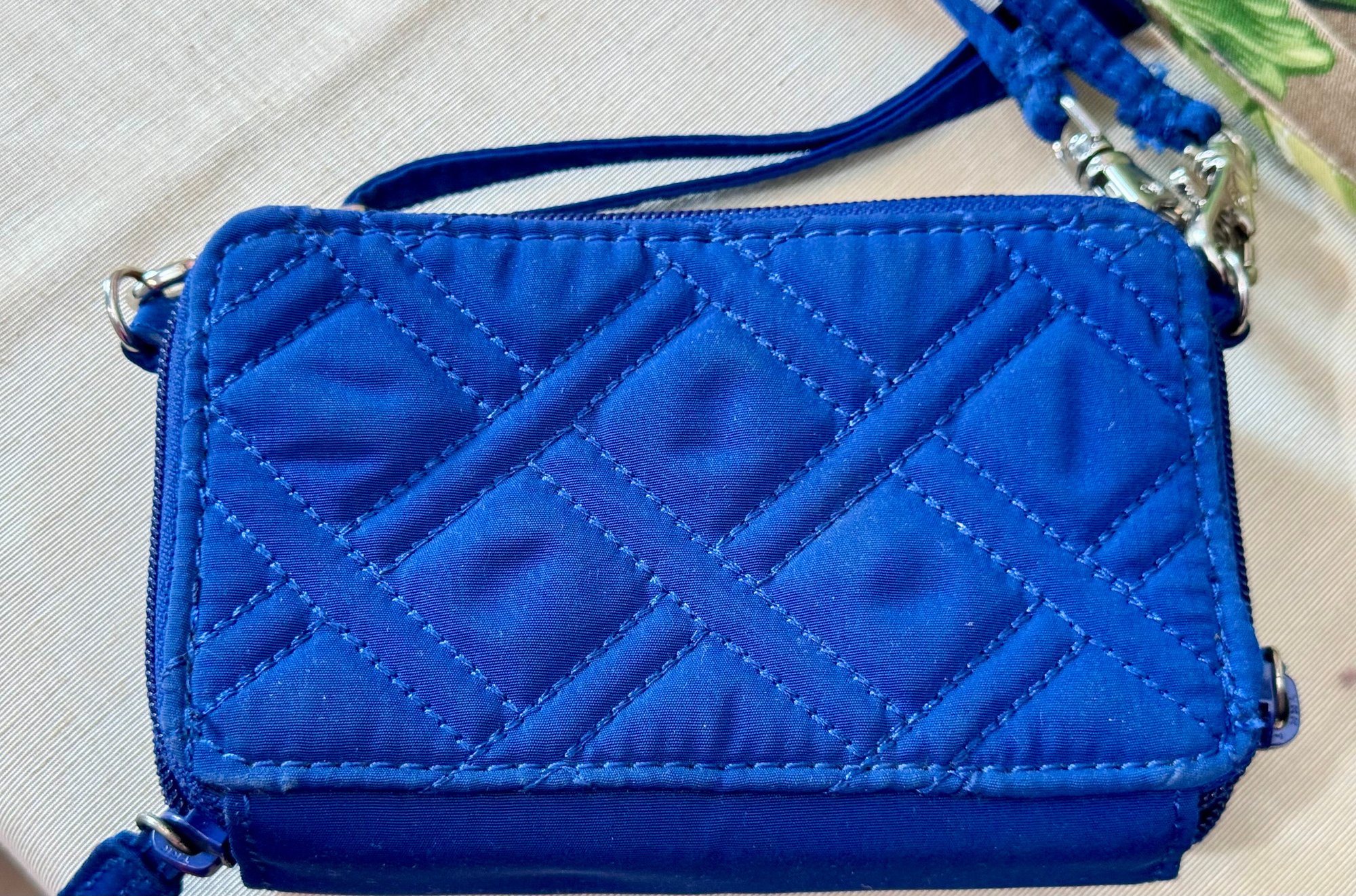 A Vera Bradley blue and white quilted bag, a Vera Bradley floral design quilted travel bag, a small Vera Bradley blue quilted purse, a Toby Weston floral design cloth hand bag, a brown leather purse with velvet design, a Delia beaded purse, a needlepoint monogrammed purse with leather handles.