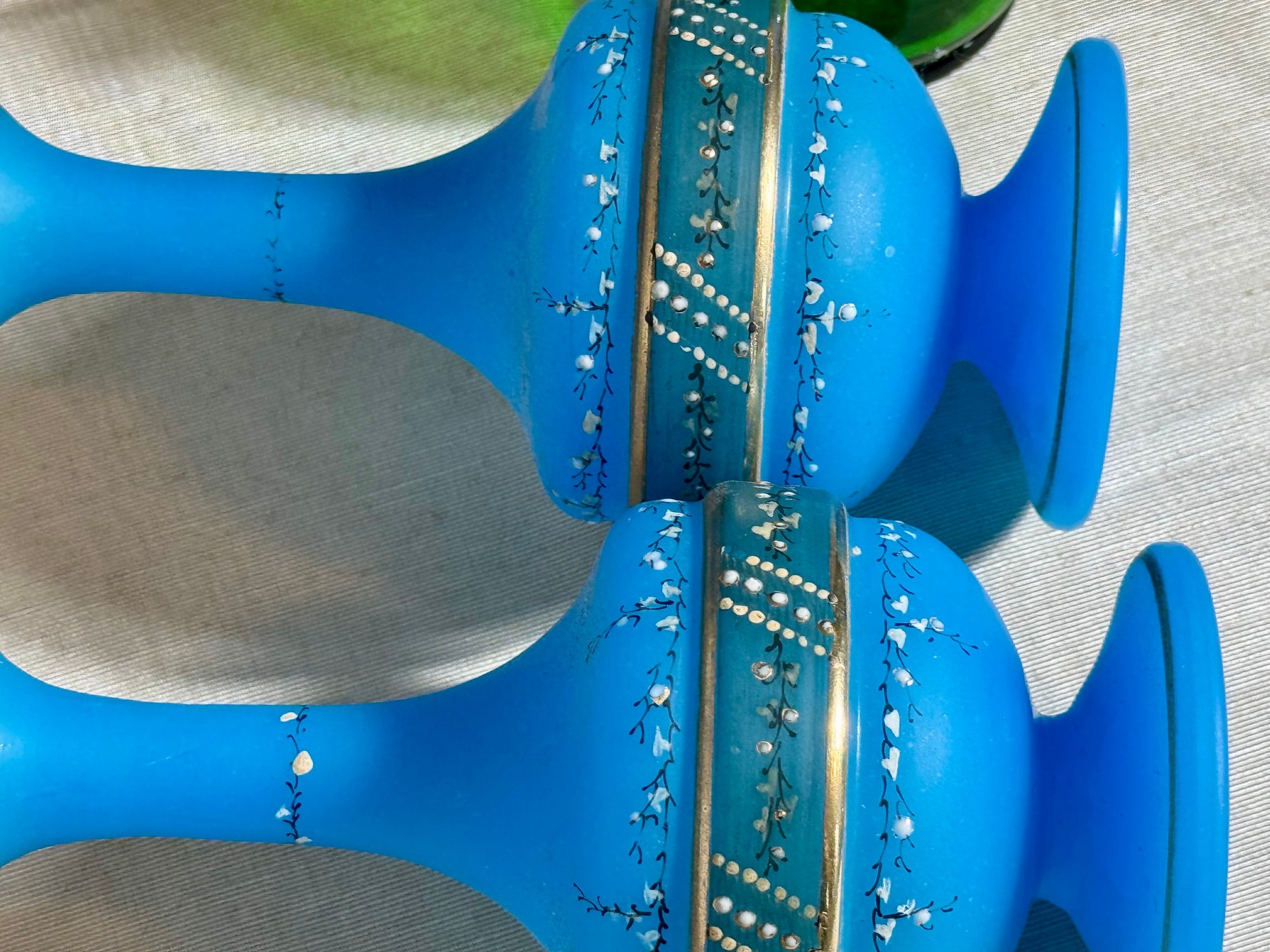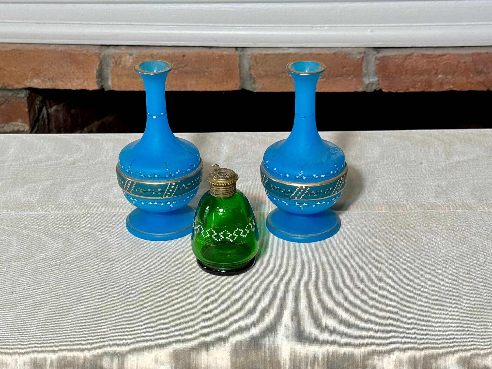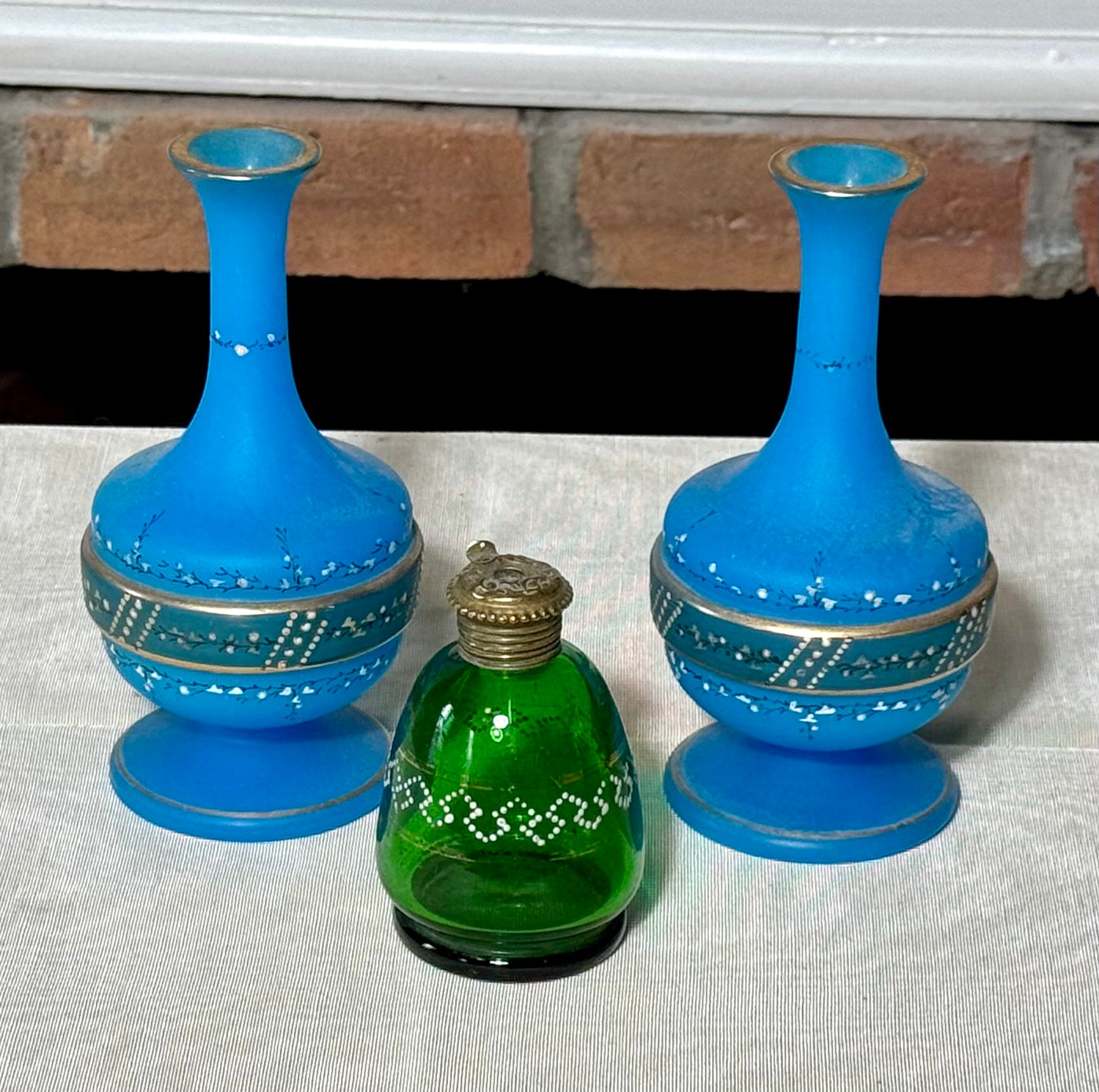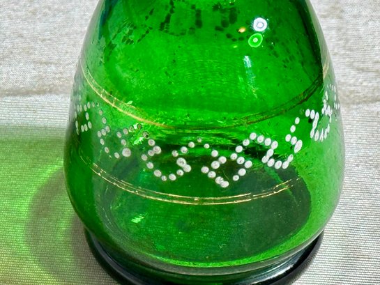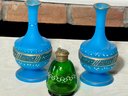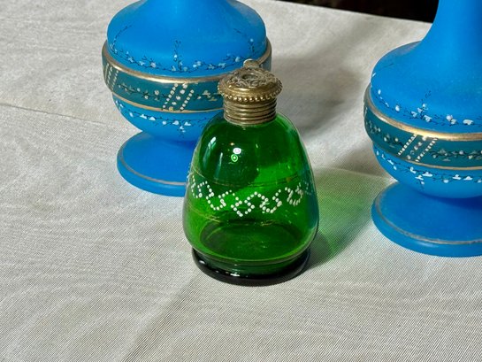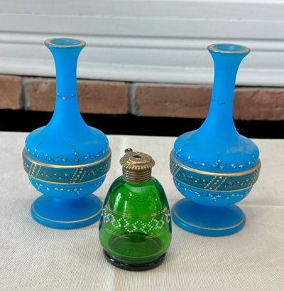 A pair of antique Victorian satin glass hand painted vases with gold and enamel finishes 5.75” H; and a green glass shaker with a top that you can open and close 3.25” H.