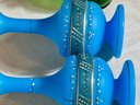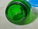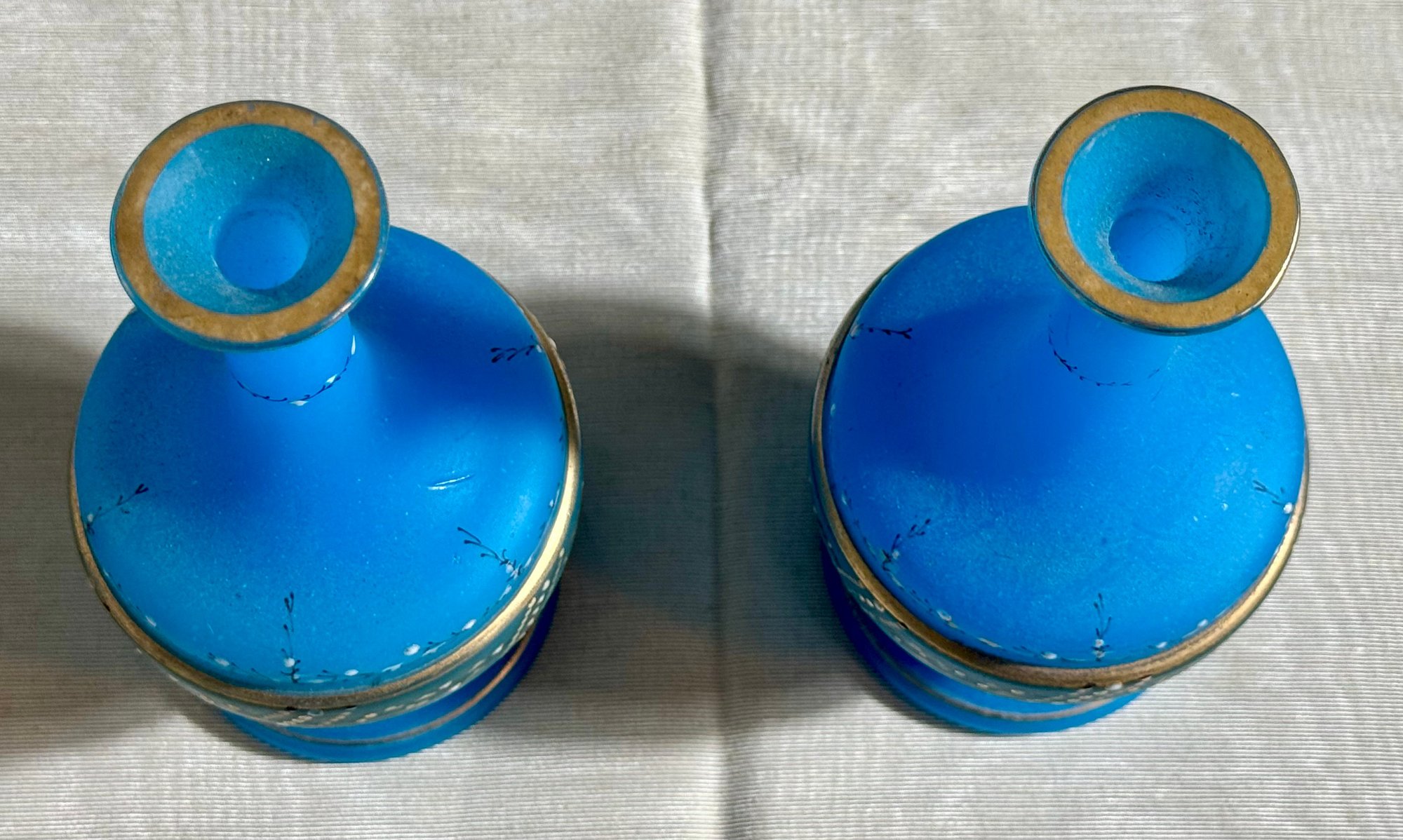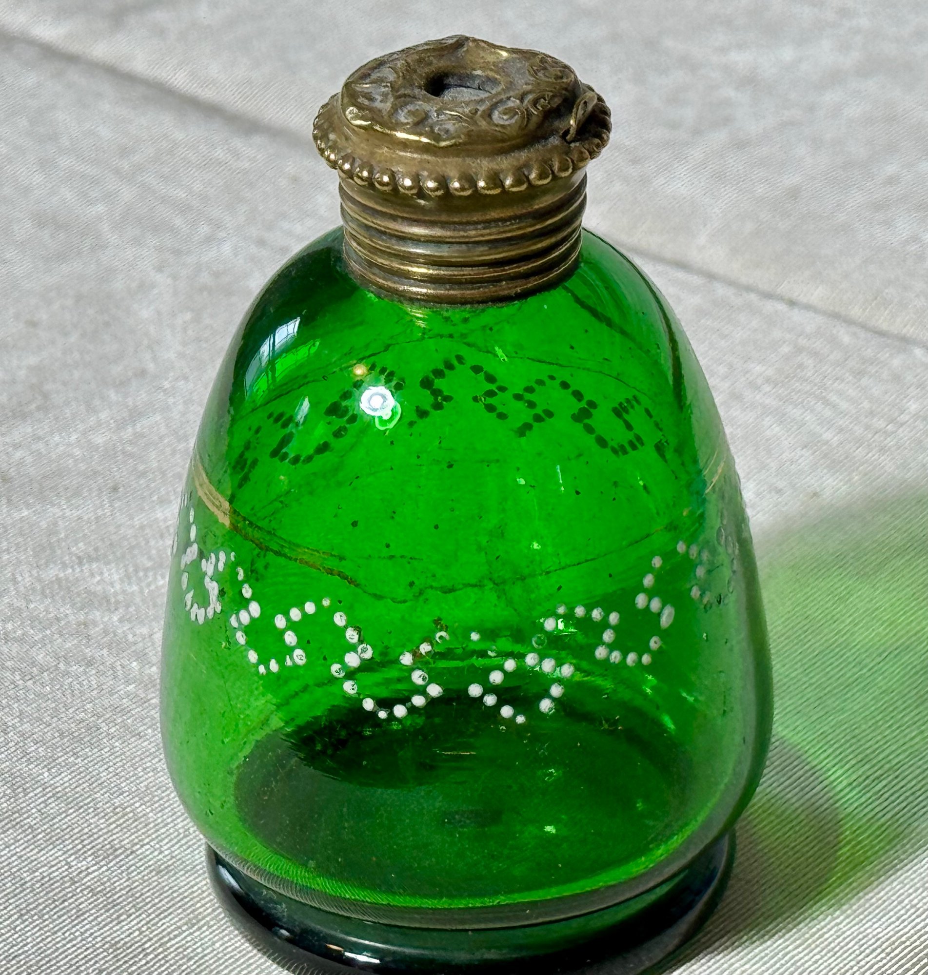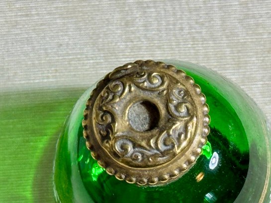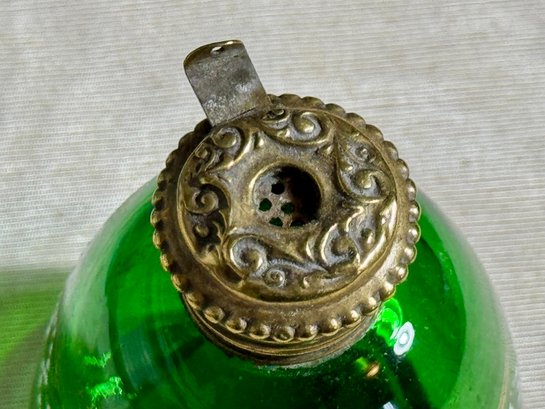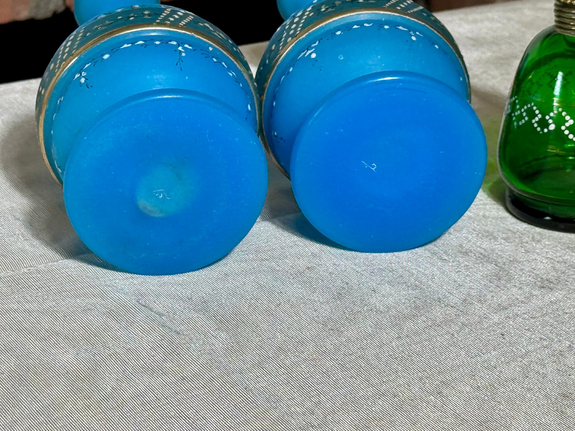 A pair of antique Victorian satin glass hand painted vases with gold and enamel finishes 5.75” H; and a green glass shaker with a top that you can open and close 3.25” H.