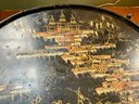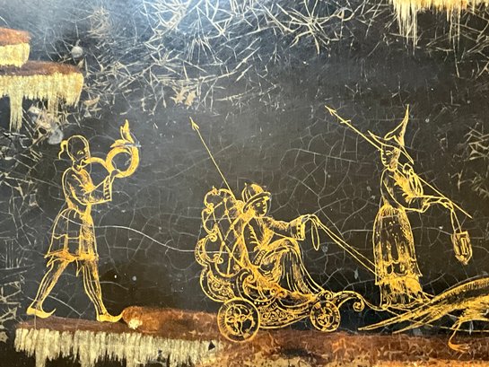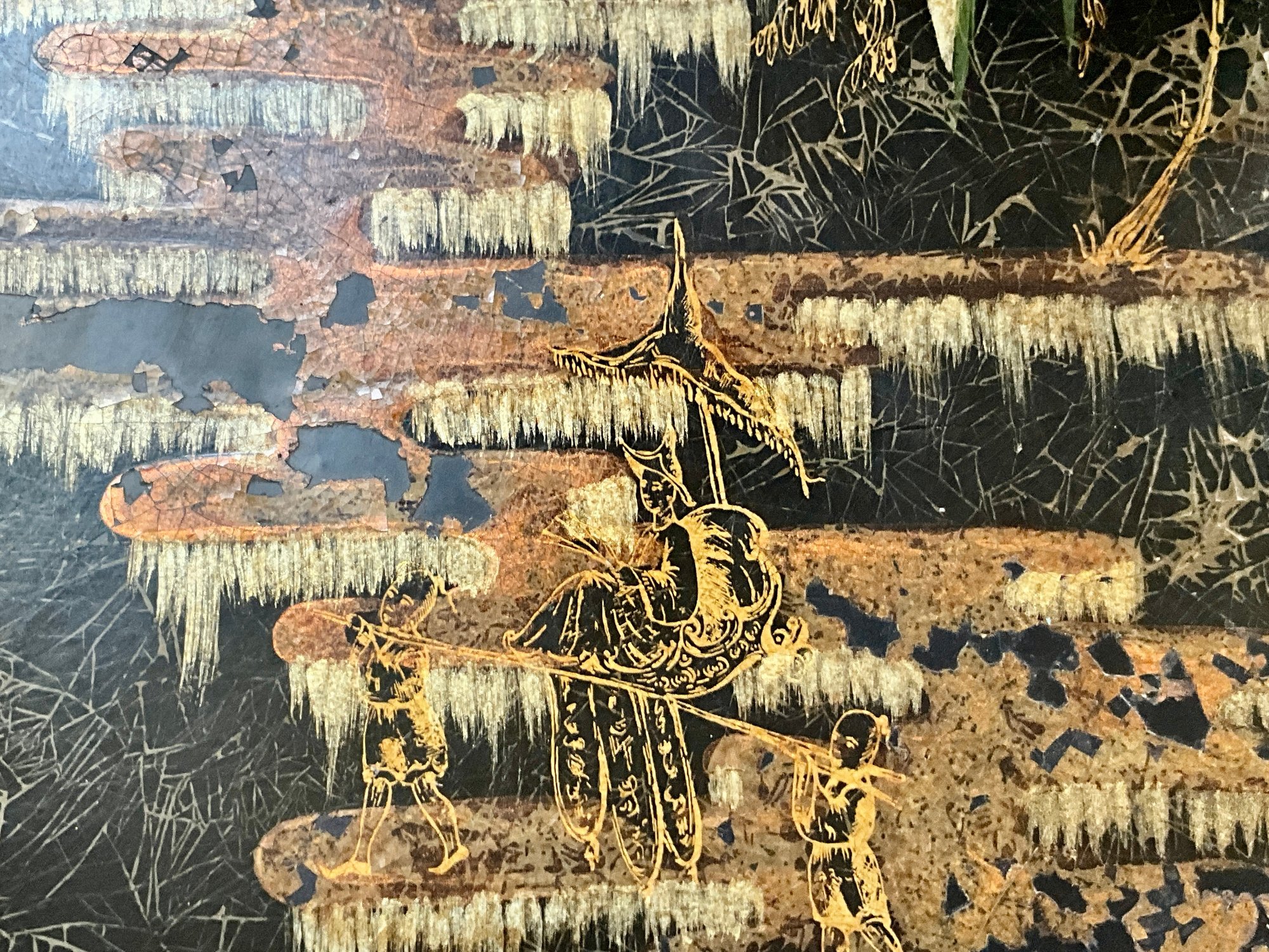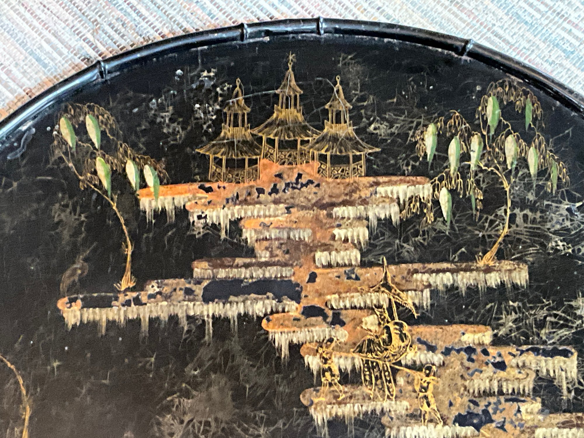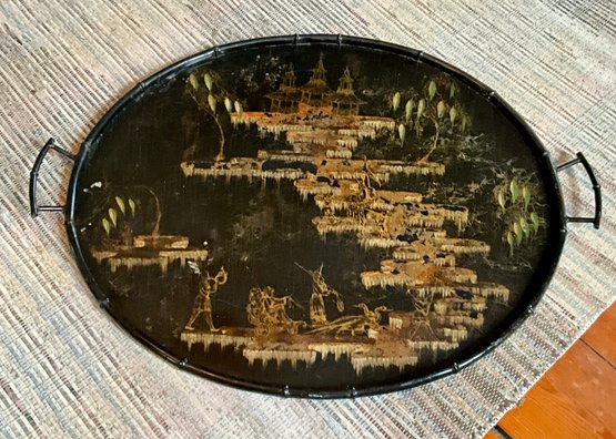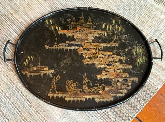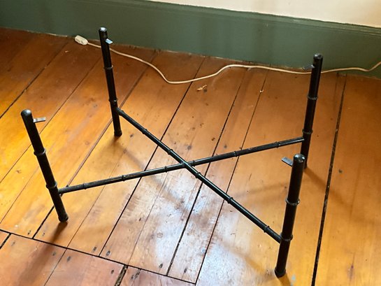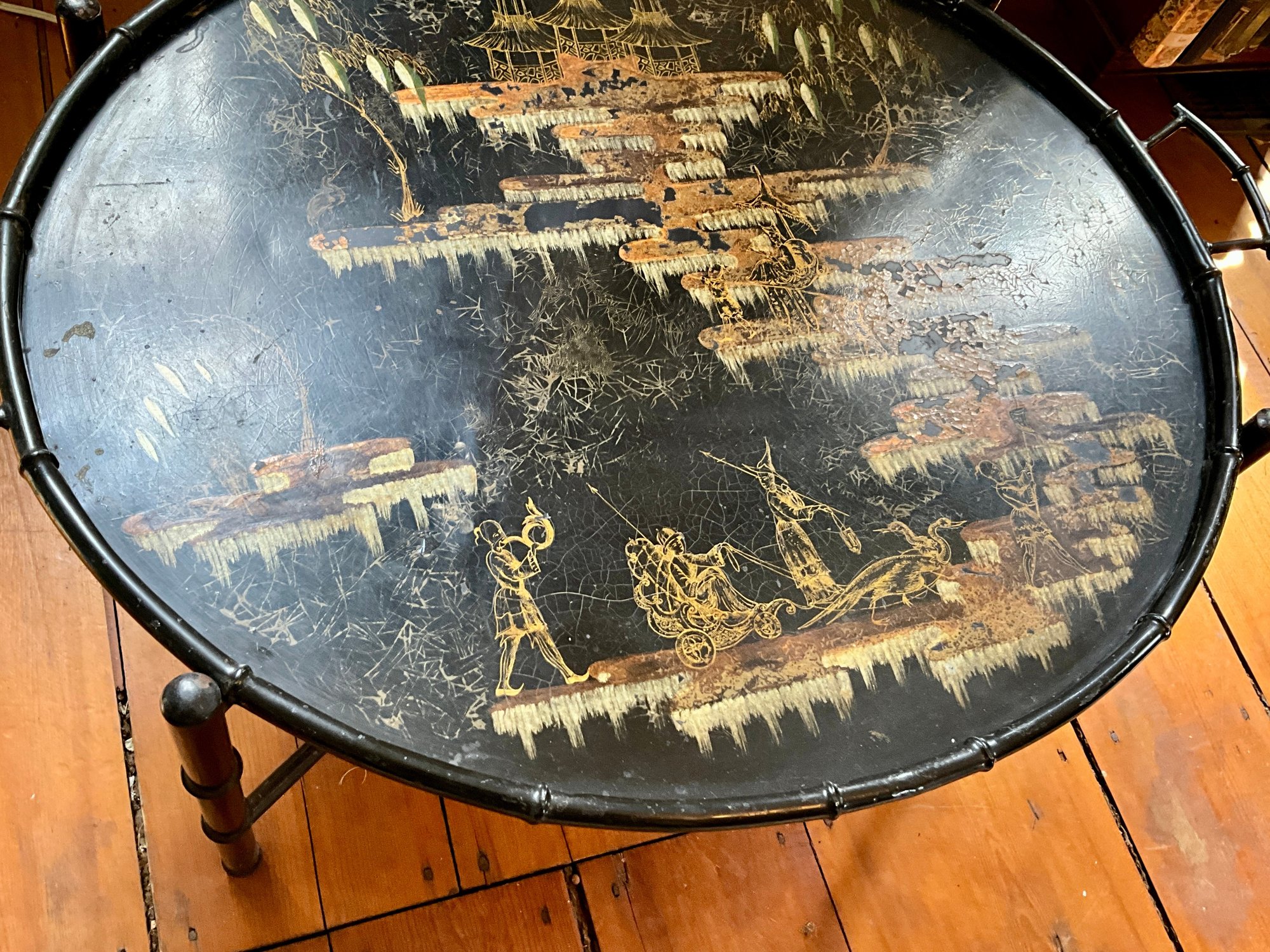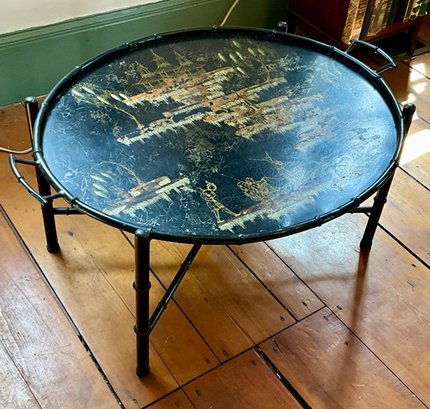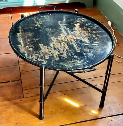 A vintage Asian design tray table, with a faux bamboo metal base.