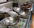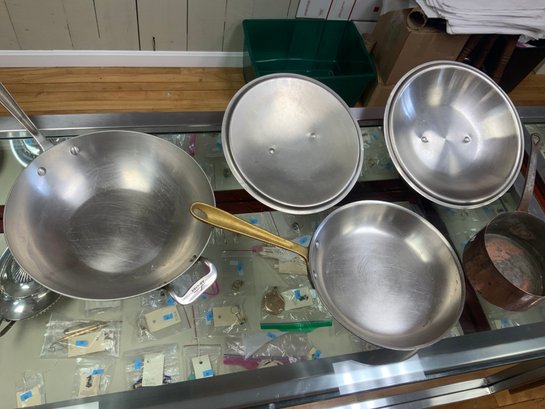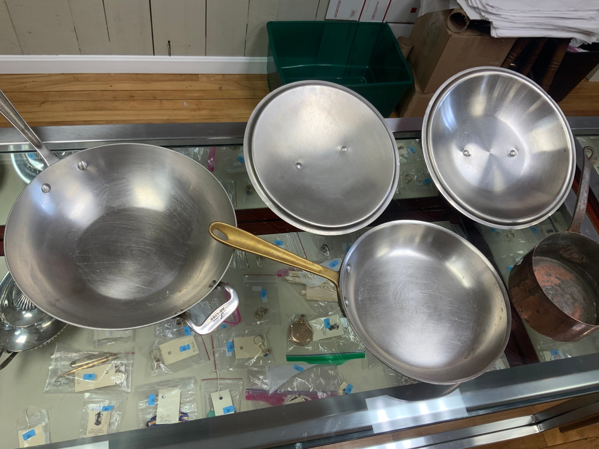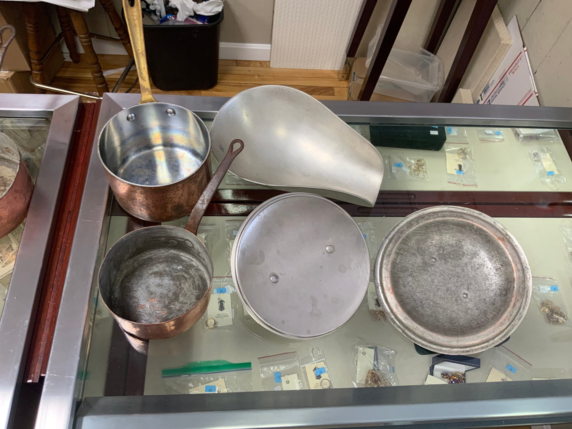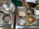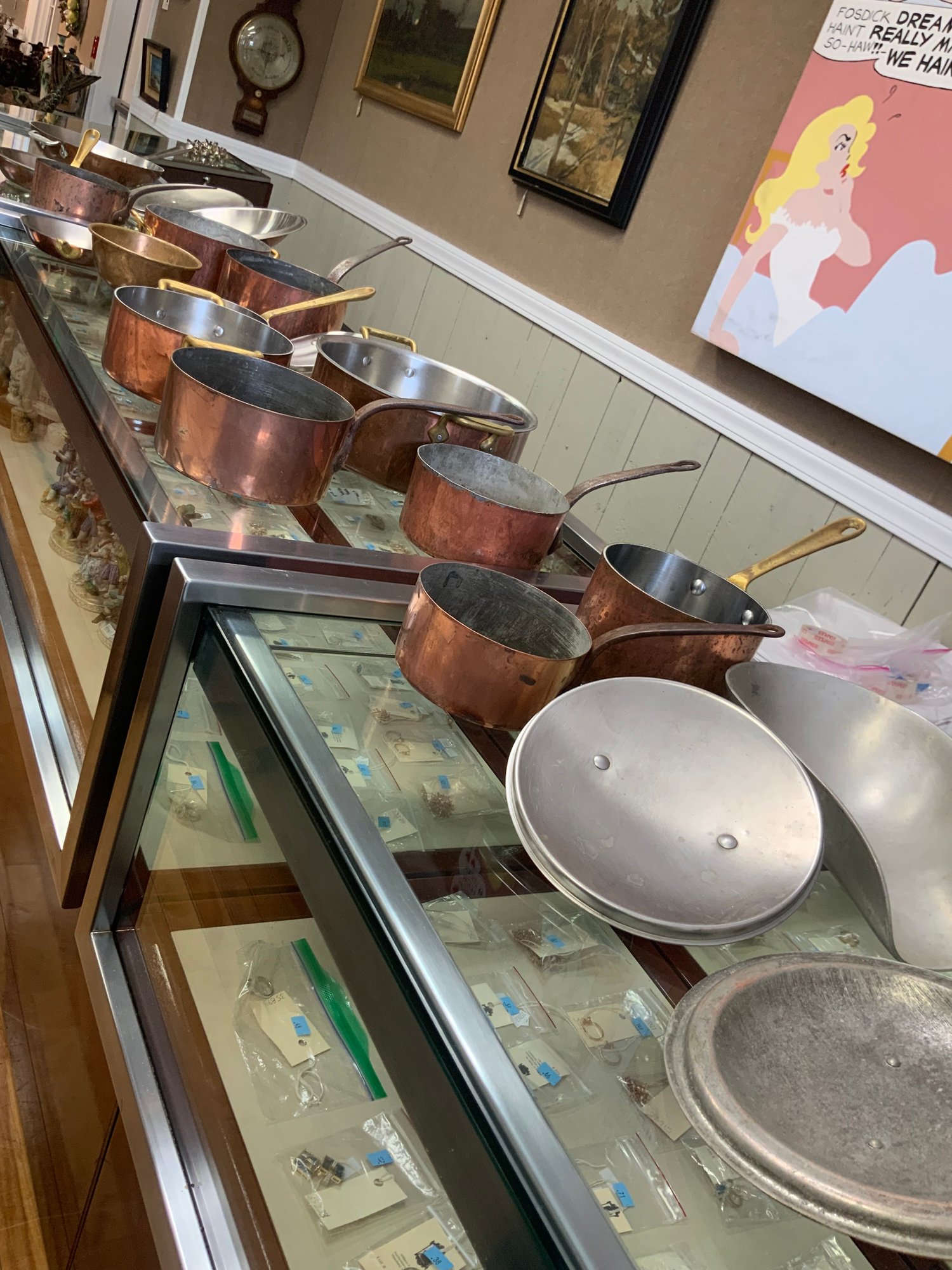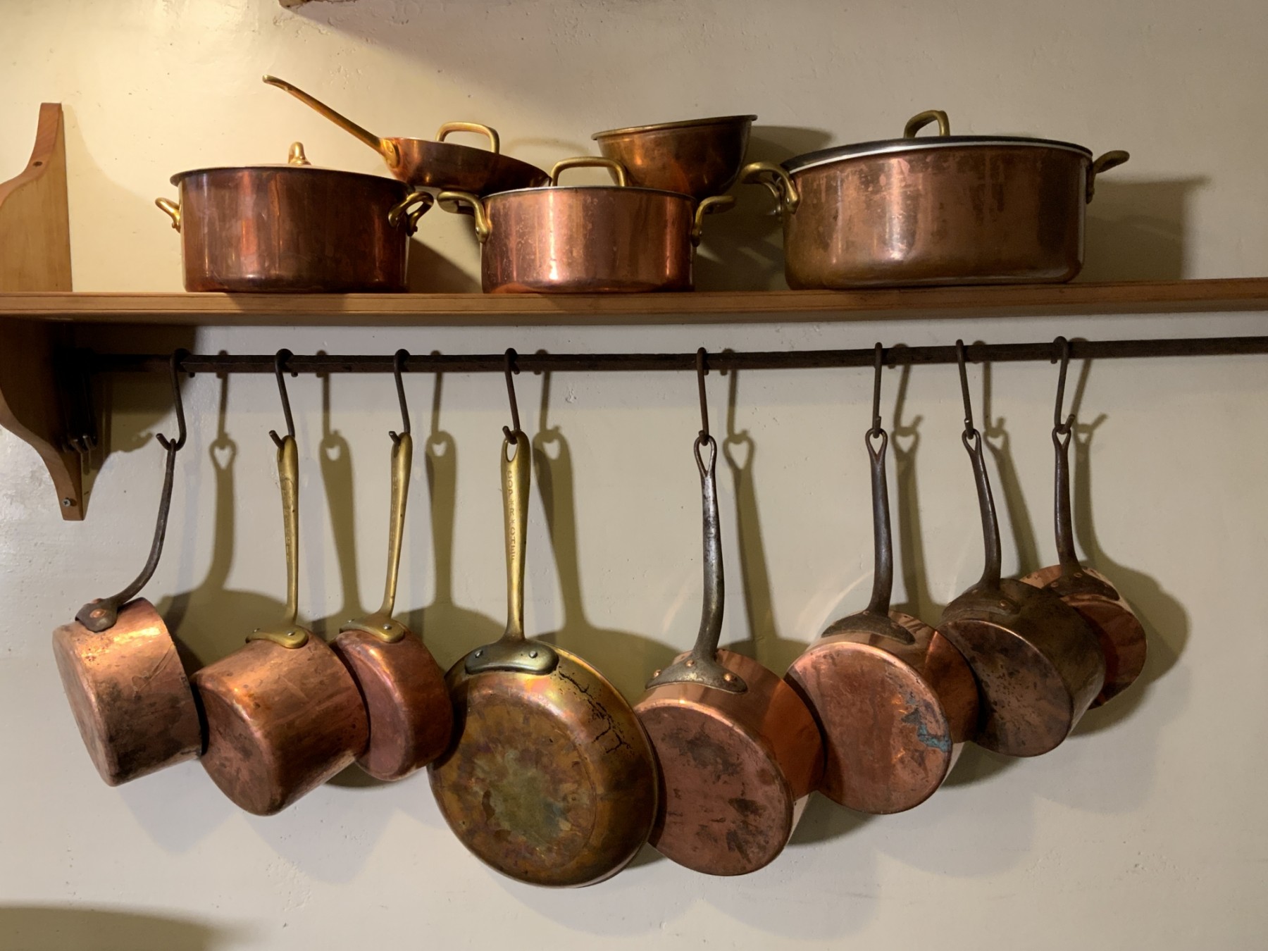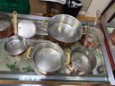 Thirteen pieces of vintage copper cookware, including a graduated set of sauce pans and three lidded pots.