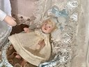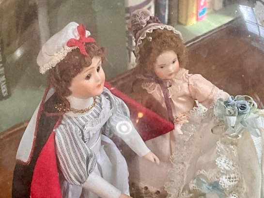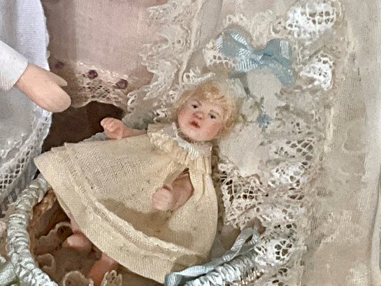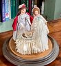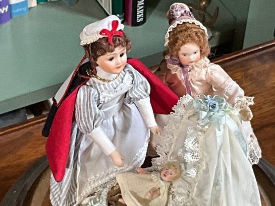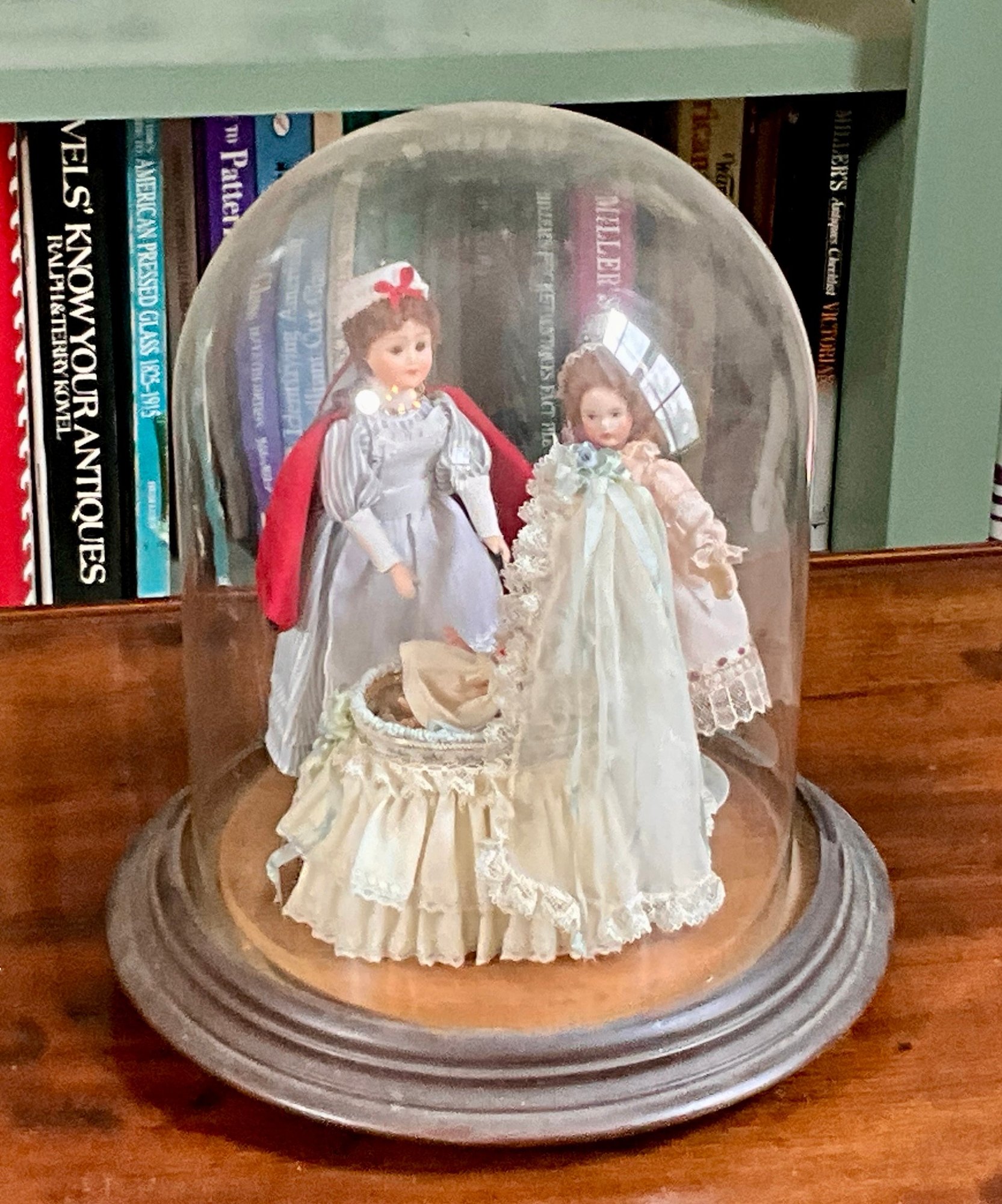 A vintage glass dome with porcelain doll figures including, a nurse and a mother standing next to a baby in a bassinet.